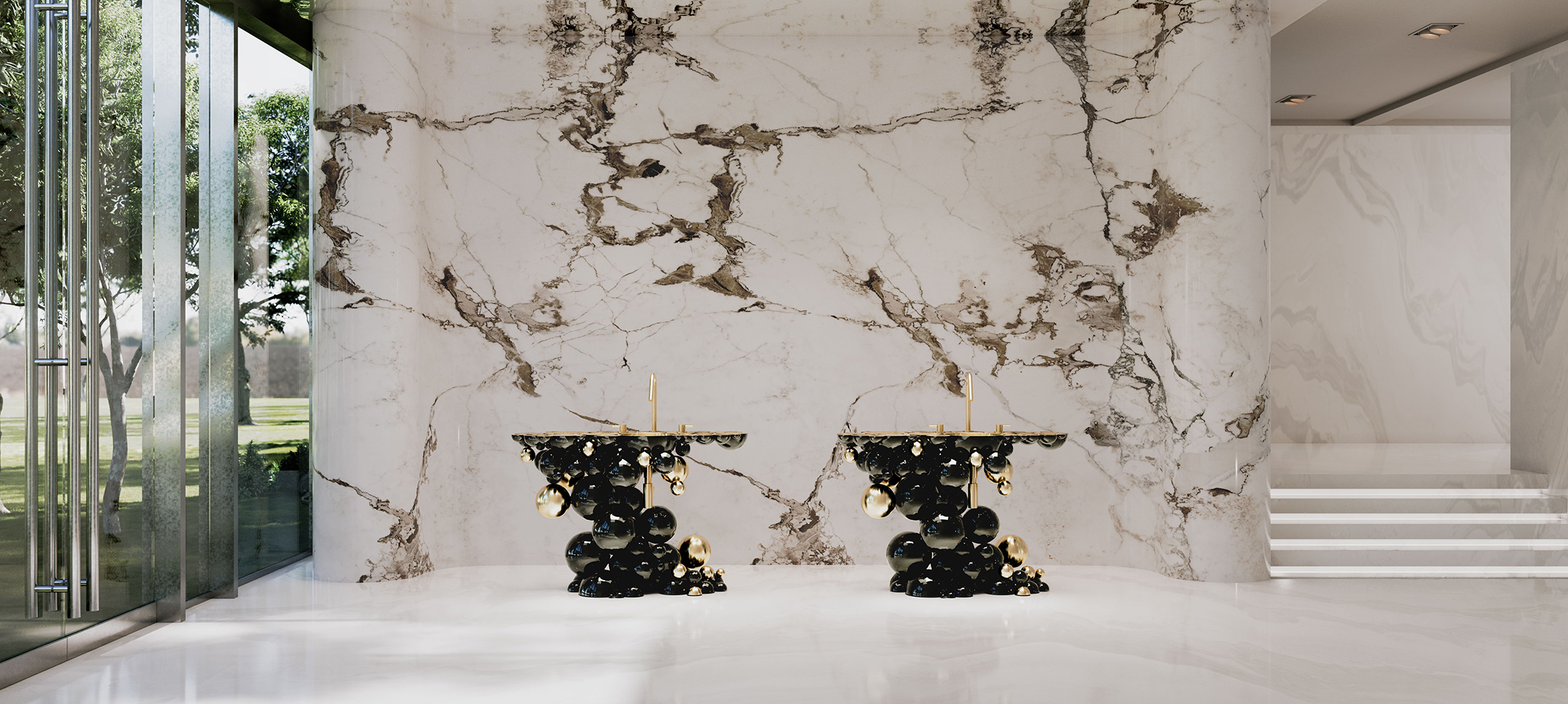 This luxurious bathroom features the Newton Vanity Cabinet by Maison Valentina, a revolutionary statement piece that combines contemporary design with exquisite craftsmanship. Inspired by the ancient art of metal casting, the Newton Vanity showcases a striking arrangement of black lacquered spheres interspersed with polished golden brass accents, creating an organic and dynamic structure. The cabinet's top features brass circles carved to resemble organic wood textures, and a polished brass sink complements them, enhancing its sophisticated appeal. This vanity seamlessly integrates into the bathroom's design, offering functionality and artistic elegance. Perfect for contemporary luxury interiors, the Newton Vanity transforms the bathroom into a space of sophistication and crafty expression.
