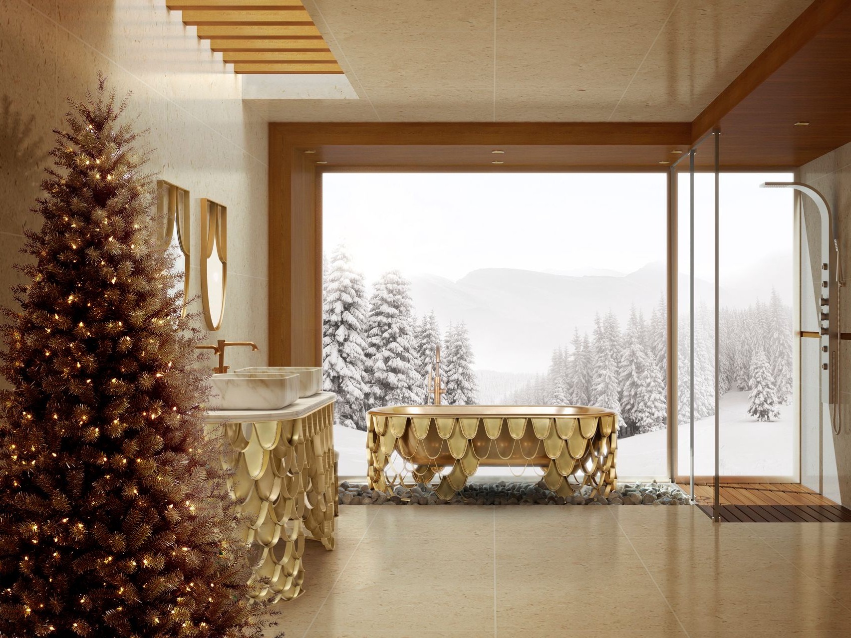 Maison Valentina is a well-known brand in the market for luxury bathrooms. Achieve your goals with our Koi collection, made with only the purest love. The Koi Bathtub features an oval form, a curved lip, and an aged brushed brass base that resembles the scale pattern of the Japanese Koi carp. It is the ideal place to lay your head while bathing. To make this room even more sumptuous and comfortable, we may add the gorgeous Koi Mirror and the graceful Koi Vanity Cabinet. A perfect luxury bathroom design for a cold winter with long hot baths.