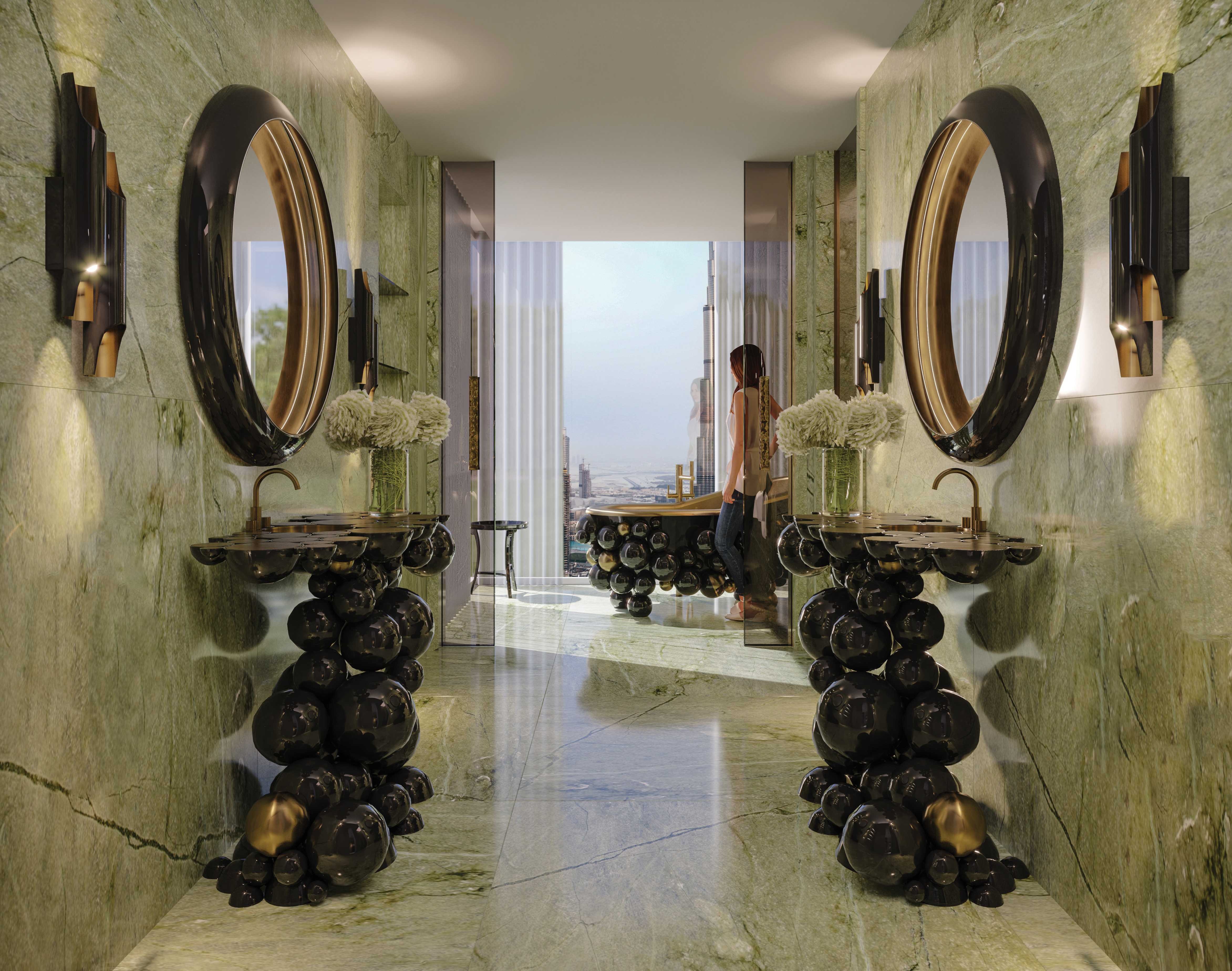 A true urban sanctuary in the heart of Dubai, this green marble bathroom transforms everyday rituals into moments of pure escape and introspection. The Newton Bathtub, with its sculptural, bubble-inspired form, stands proudly before floor-to-ceiling windows that reveal the awe-inspiring skyline, a seamless blend of modern architecture and serene self-care. The Newton Freestanding paired with the bold Ring Mirrors brings symmetry and sophistication to the space, while Galliano Wall Lamps cast warm, ambient light that enhances the rich textures and tones. Designed to awaken the senses and calm the spirit, this bathroom is not just functional; it’s an elevated experience, a design haven where natural beauty meets metropolitan grandeur.