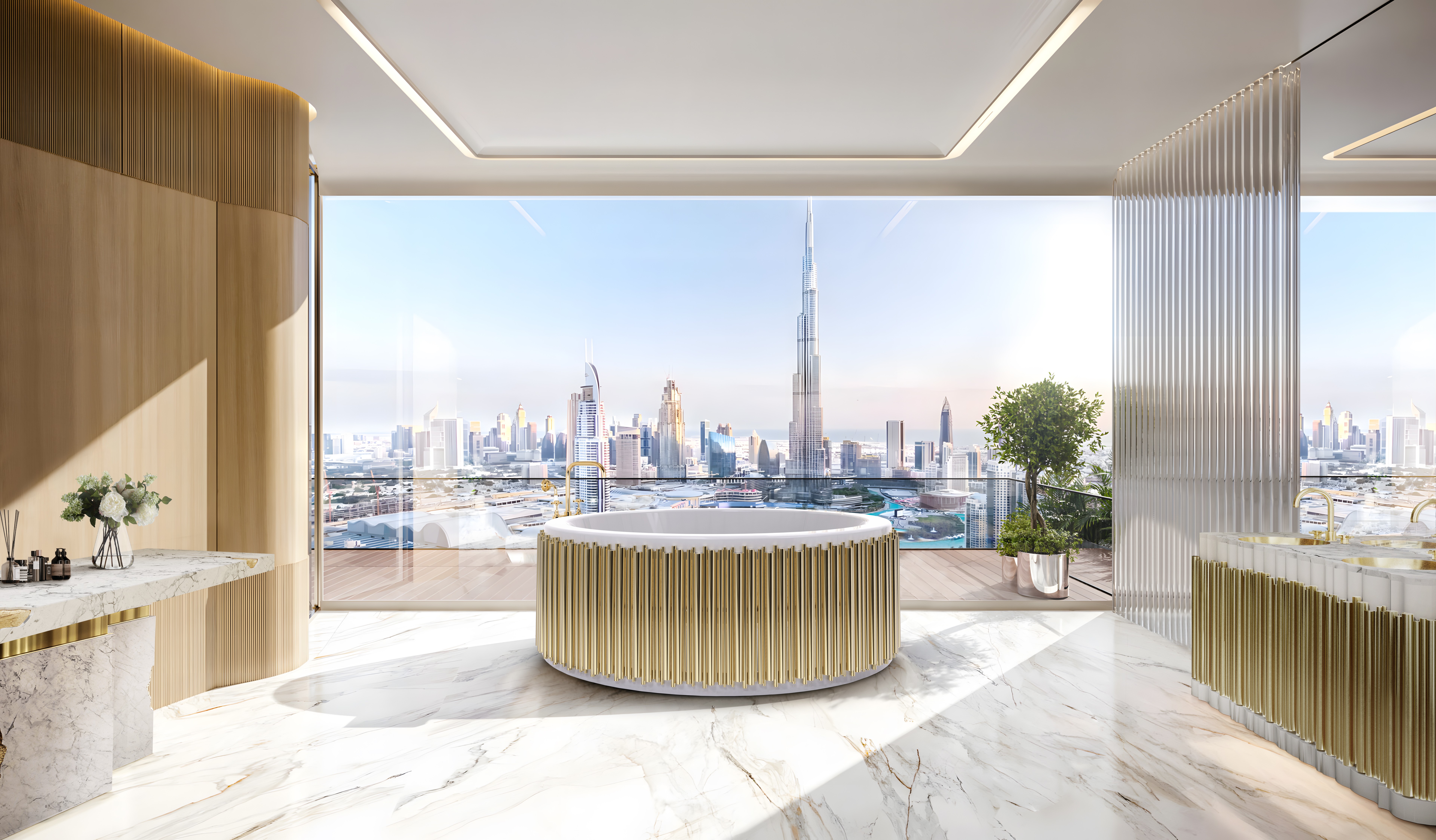 “Skyline Symphony” brings together the grandeur of Dubai with the refined artistry of Maison Valentina. Featuring the iconic Symphony Bathtub and Vanity in polished brass and marble, this space celebrates modern luxury with classical soul. Surrounded by panoramic skyline views and golden light, the ambiance evokes serenity, power, and architectural poetry. Crafted in Portugal, this Symphony Collection setting is a tribute to bespoke design in its most elegant form.