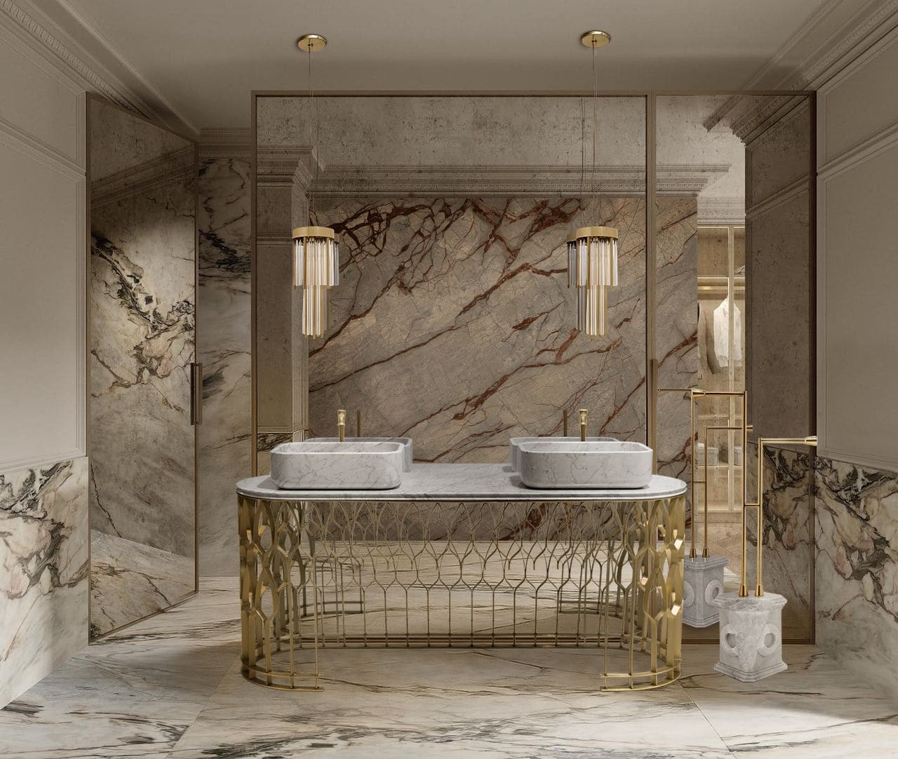 A timeless space where sculptural design and luxurious materials redefine everyday moments. The vanity cabinet, adorned with golden geometric lines and a marble top, becomes a true centerpiece of elegance. Nearby, the Petra Towel Rack, carved from pure marble and finished with brass, adds a sculptural accent that elevates function to art. This is where bold craftsmanship and serene aesthetics coexist in perfect harmony.