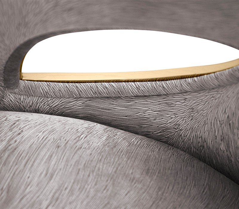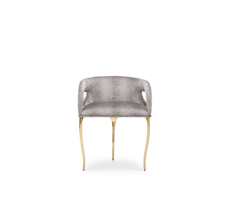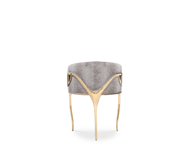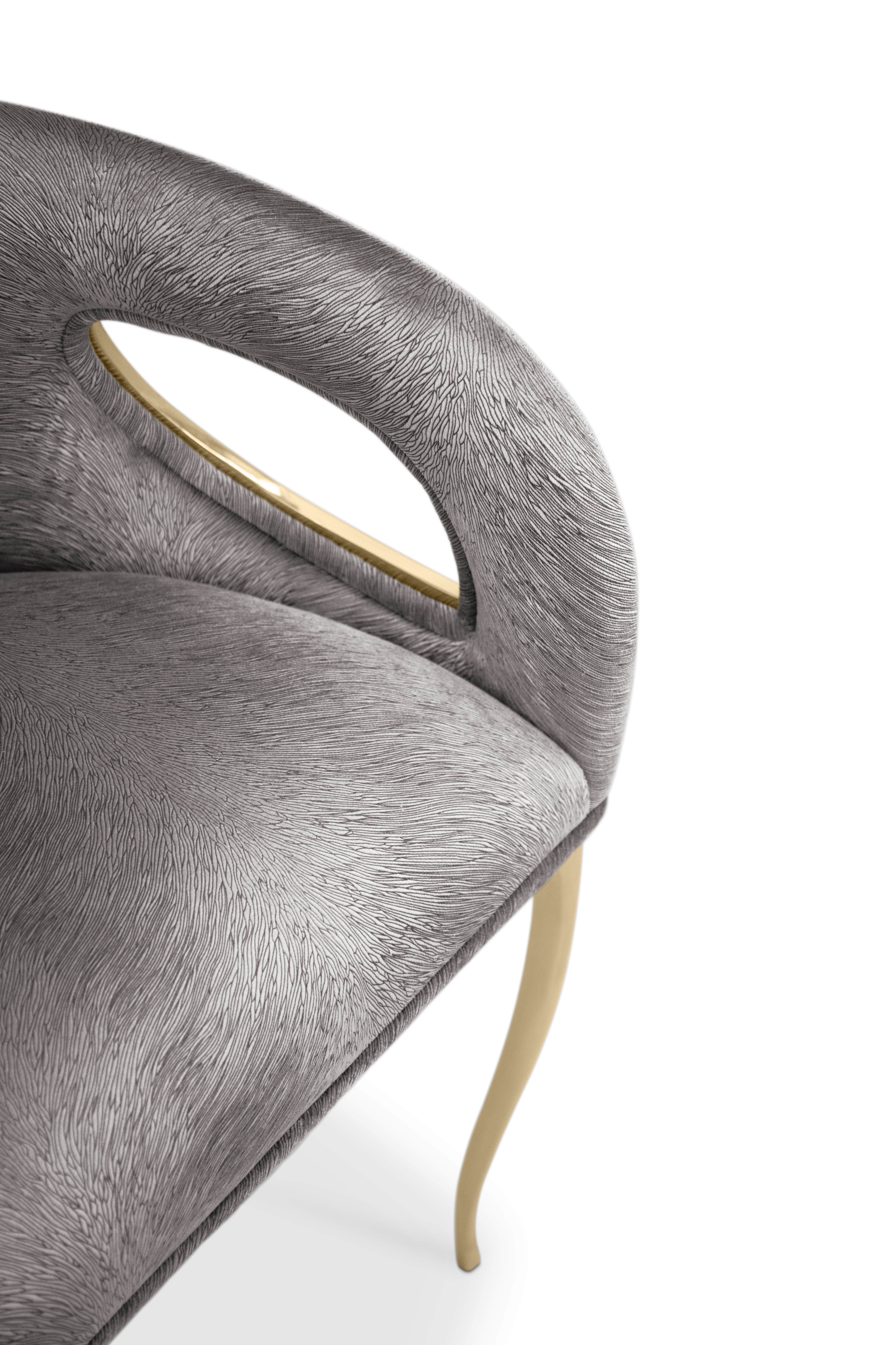 The Chandra chair is both bold and daring, embodying a unique blend of contemporary flair and vintage glamour. Its modern design features a tight back upholstery that accentuates its sculpted fluidity, while delicately placed metal bands add a touch of refinement and sophistication. This striking chair is a perfect statement piece that seamlessly combines daring aesthetics with timeless elegance.