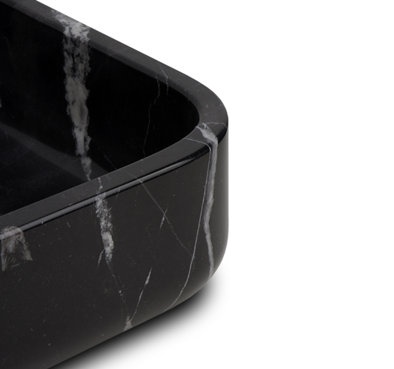 The Koi Rectangular vessel sink is an incredibly unique item in Nero Marquina, Carrara, and Estremoz marble. It has a beautiful shape that makes it easy to match with any base or tap. Its versatility provides endless possibilities to create the perfect luxury bathroom design project and adorn any ambiance with great elegance and uniqueness.
