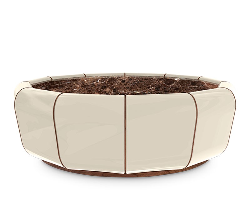 The Darian takes up a new form, this time as a lavish center table. Incredibly expert craftsmanship creates a luxurious silhouette that will improve your bathroom or closet design. Involving the glossy beige lacquered wood are fine Walnut Root lines, finished off with a circular dark Emperador marble top. A sumptuous item that blends the splendor of art with a lush personality.
