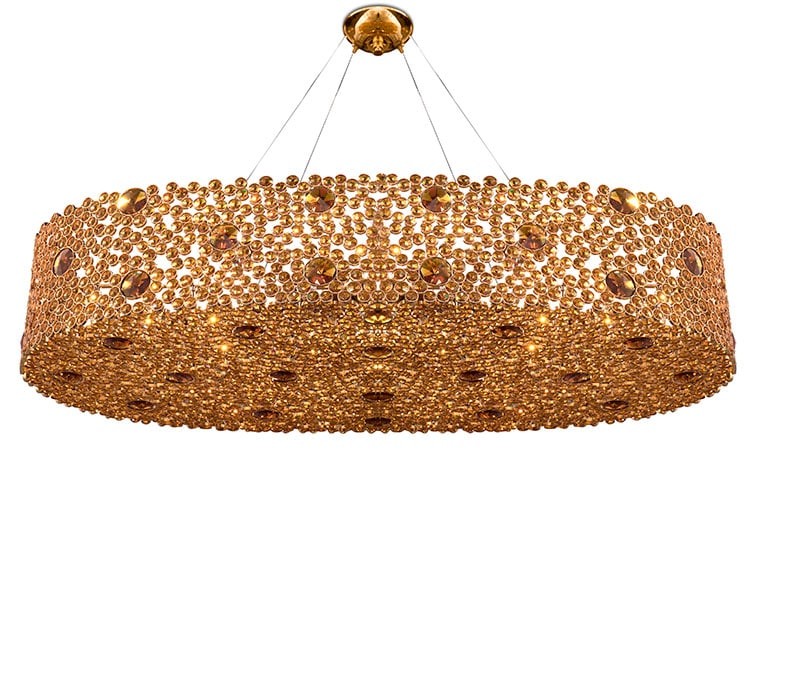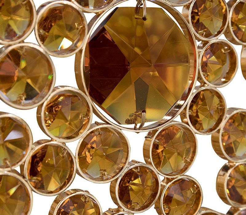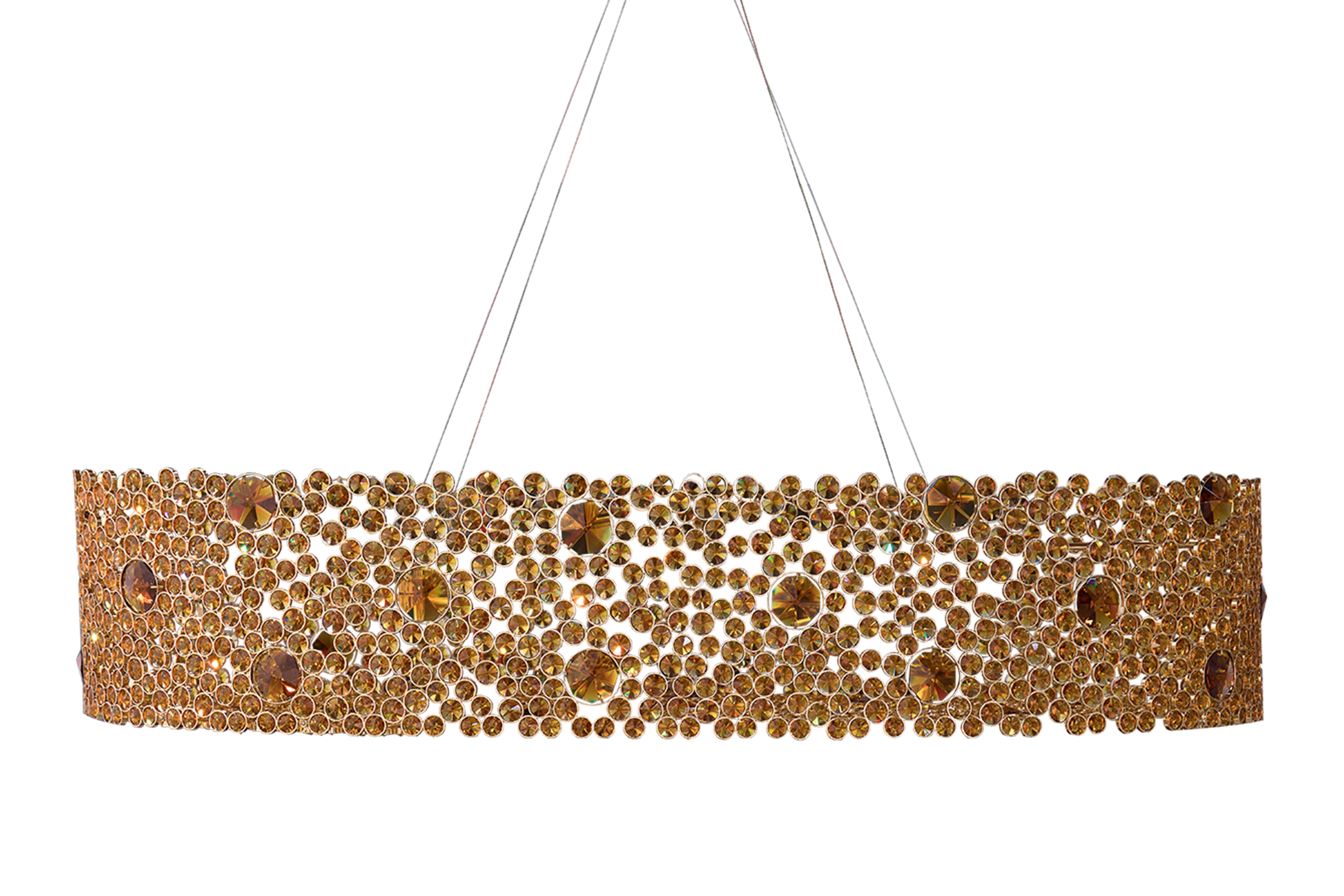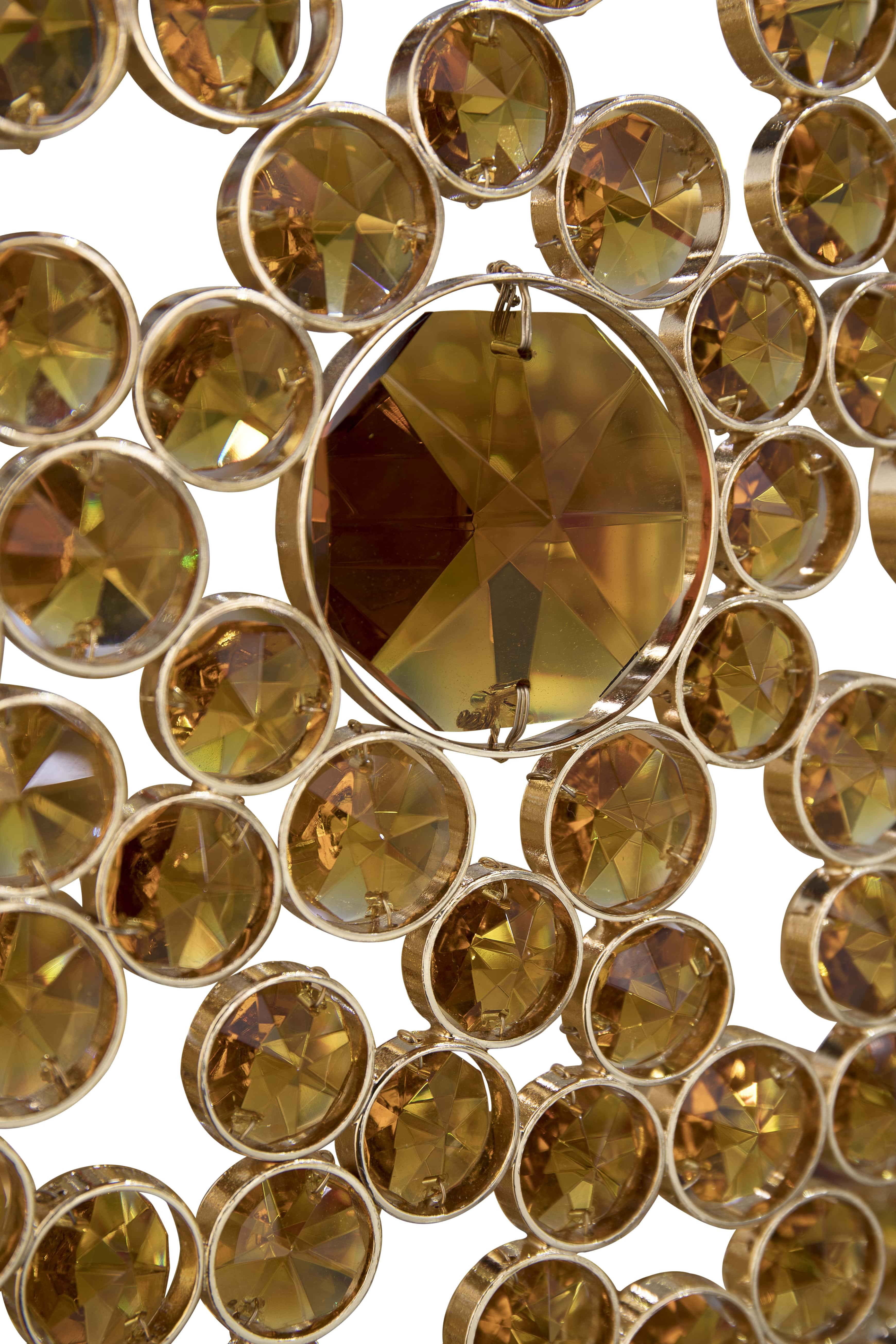 The elegant silhouette of this chandelier takes its brilliance from the skillful application of the crystal. The eternal circles are individually wrapped in brass and placed with astonishing attention to detail. The result is an extraordinary source of light.