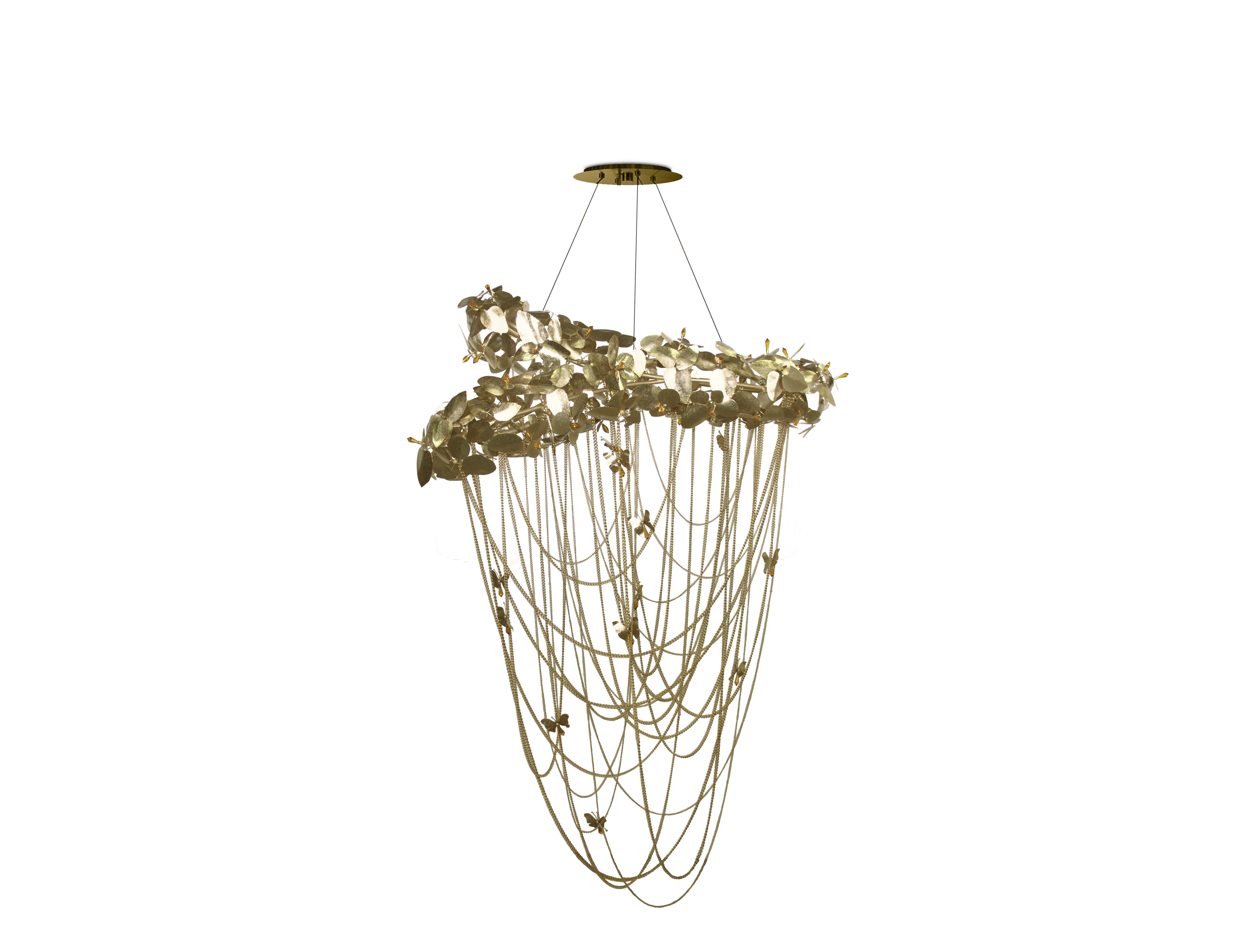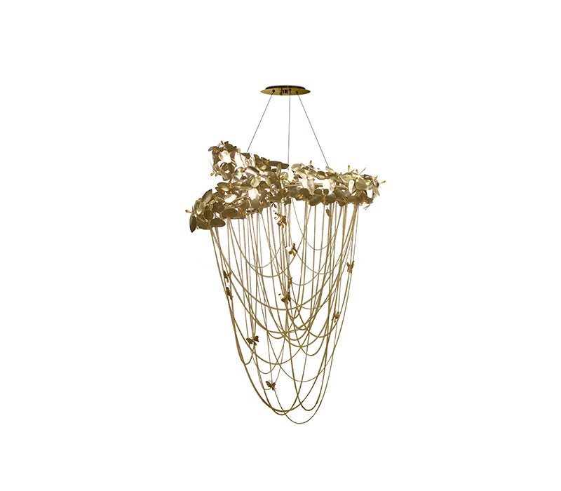 This amazing chandelier is inspired by Alexander McQueen. This masterpiece is a gold chandelier, as powerful as his exhibitions, combining the best luxury with the most exquisite handmade materials. Made with gold plated hammered brass, handmade butterflies and majestic flowers ending with the touch of beautiful crystals. Bold and feminine, this creation is a real lumen sculpture.