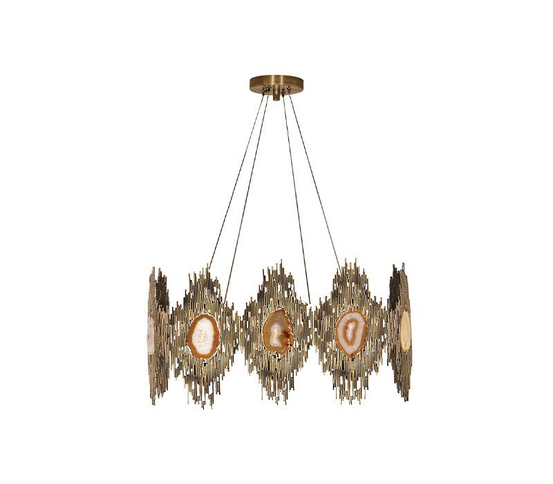 The Vivre features stunning vintage details combined with a sleek, modern design. Its dark, neutral hues and intricate agate stone patterns create a mesmerizing contrast with the light and the gold metal, which elegantly frames each stone in a harmonious balance. Hand-selected agate slices emit a radiant glow when illuminated, enhancing the piece’s allure.