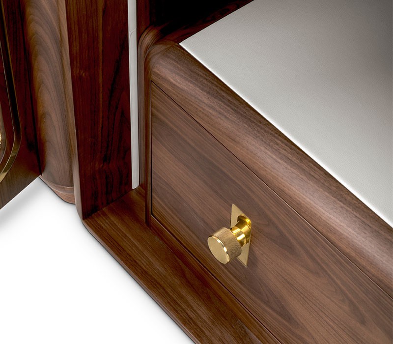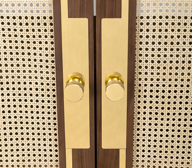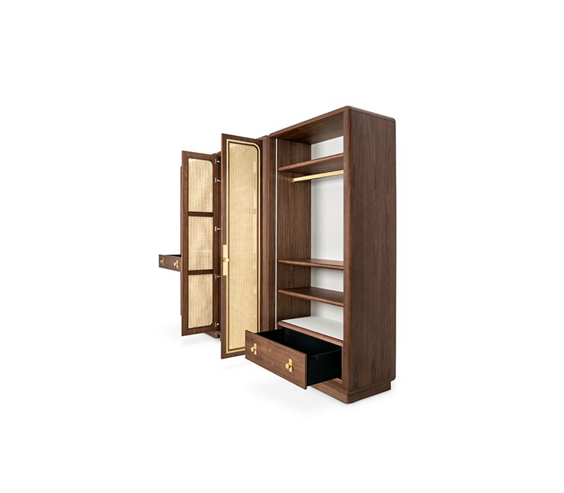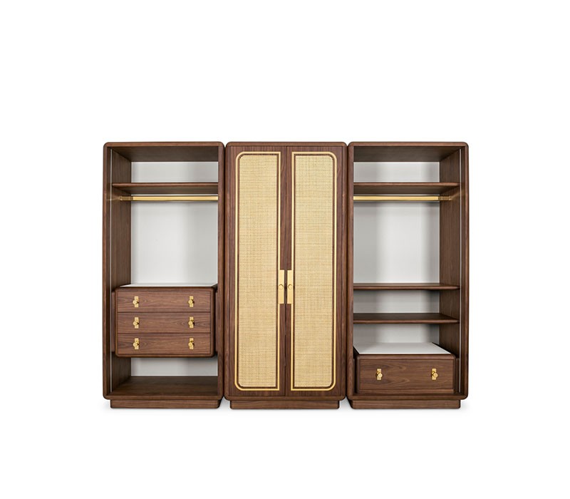 The stunning and luxurious Franco Closet has a distinguished design, full of glamor. Built-in varnished walnut wood, straw, and polished brass, this modern closet will fit all your favorite fashion items as it exudes a unique beauty to your space.