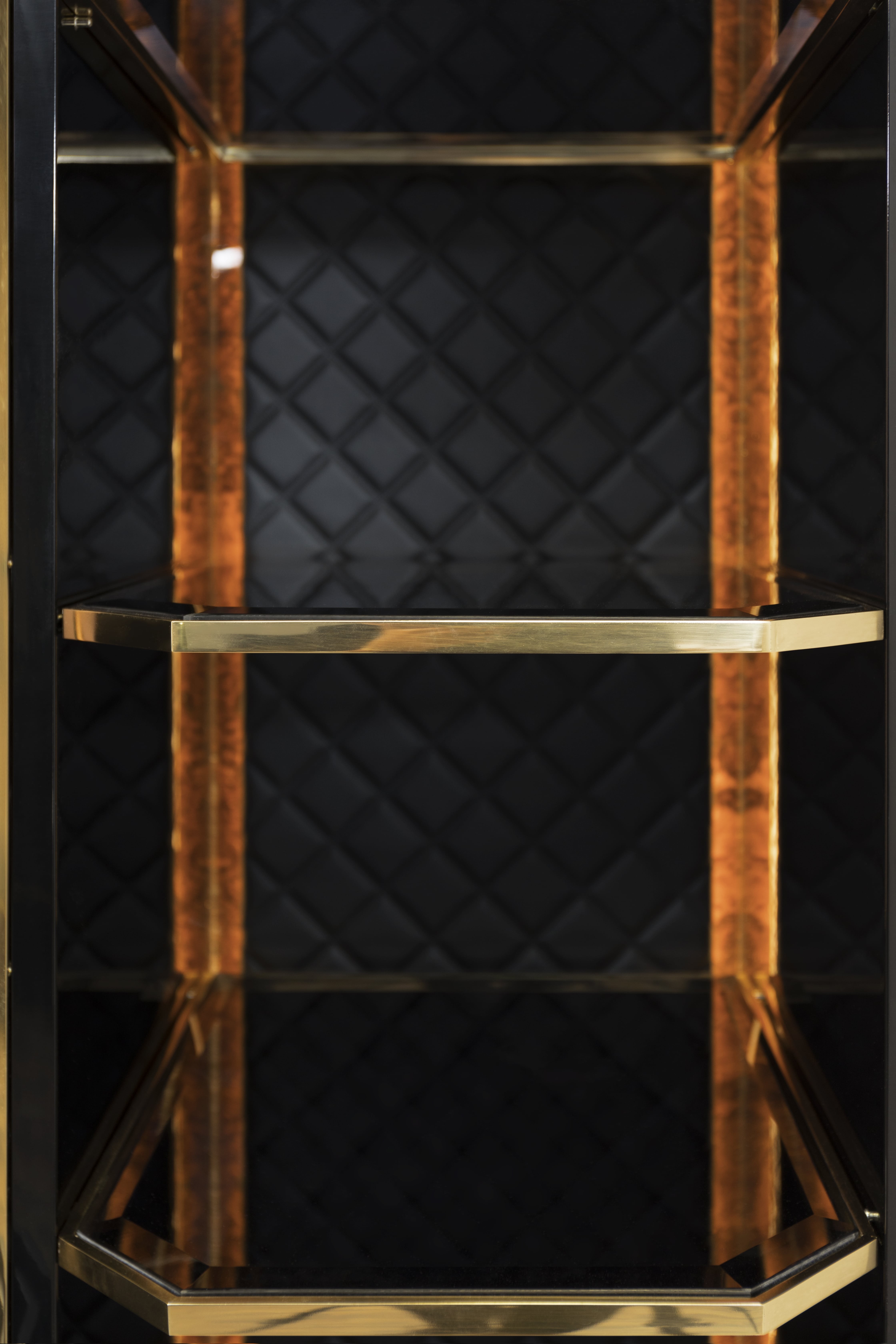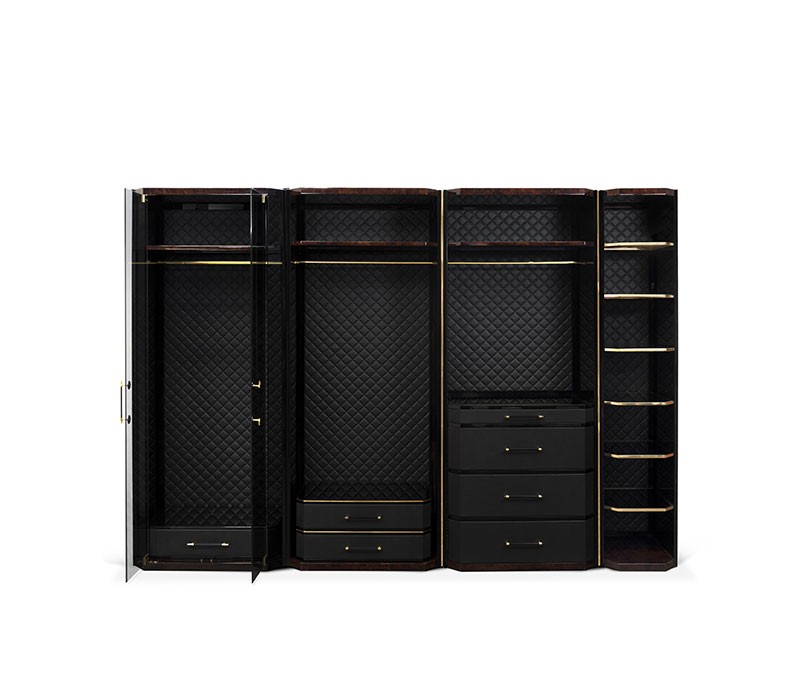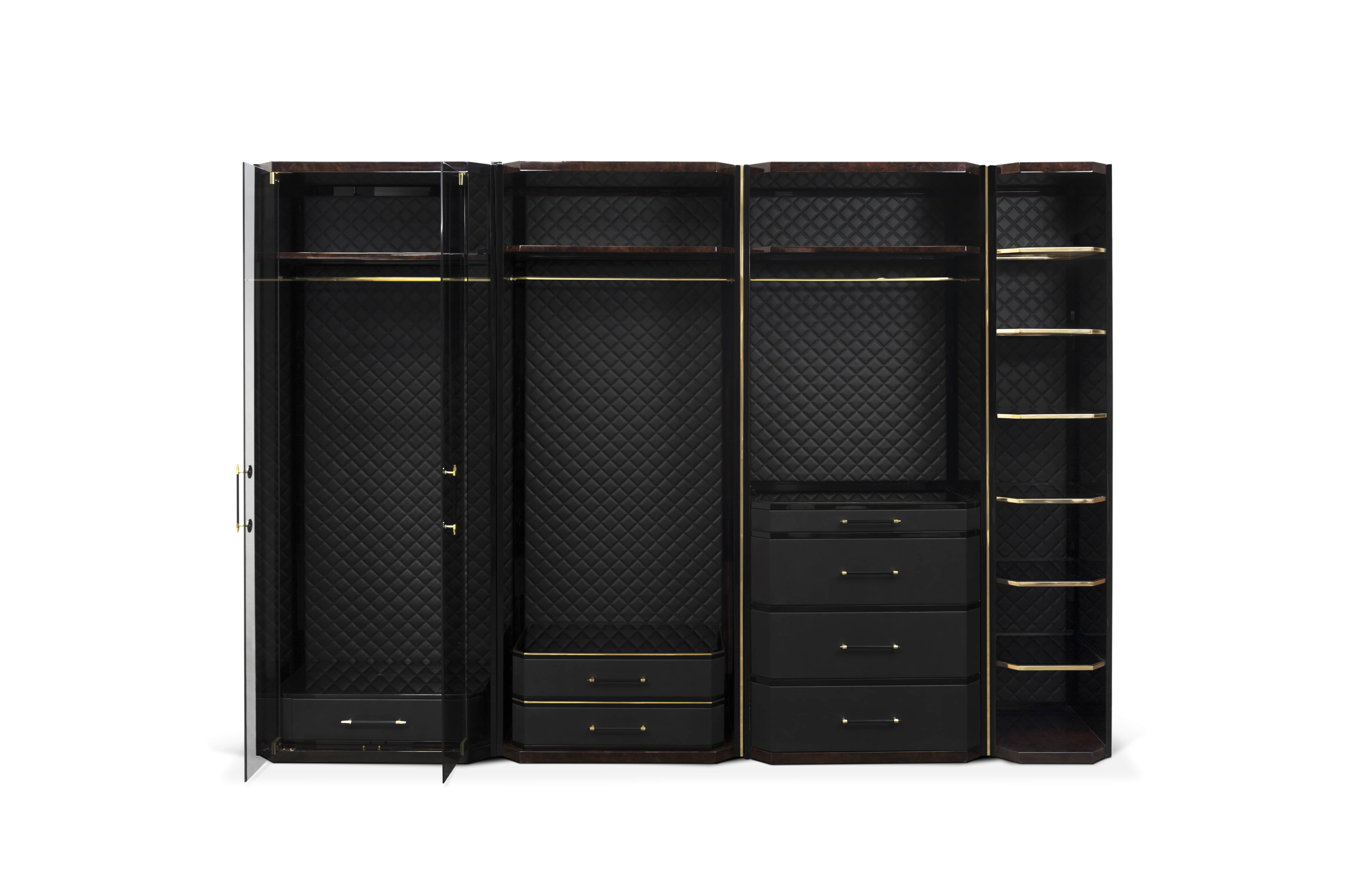 Waltz closet is an elegant modular clothing storage solution. Made with the finest materials, walnut root veneer, black leather, black lacquered wood, brass, and smoked mirror. Waltz is the ideal closet for a luxury master bedroom offering a fully customizable organization system. The Waltz is a modular piece, allowing different module combinations to better fit into your space.