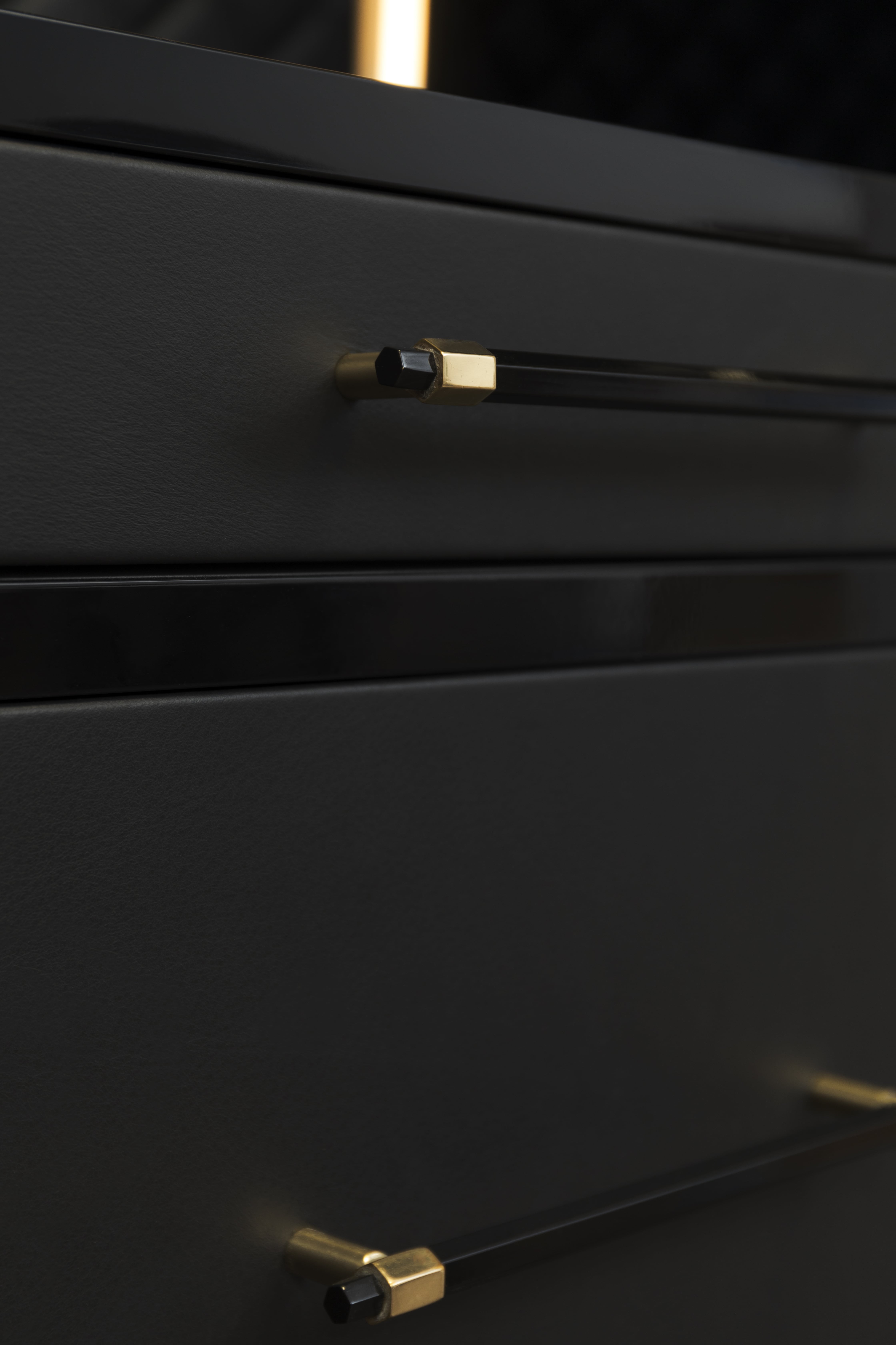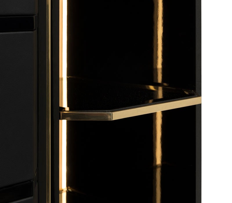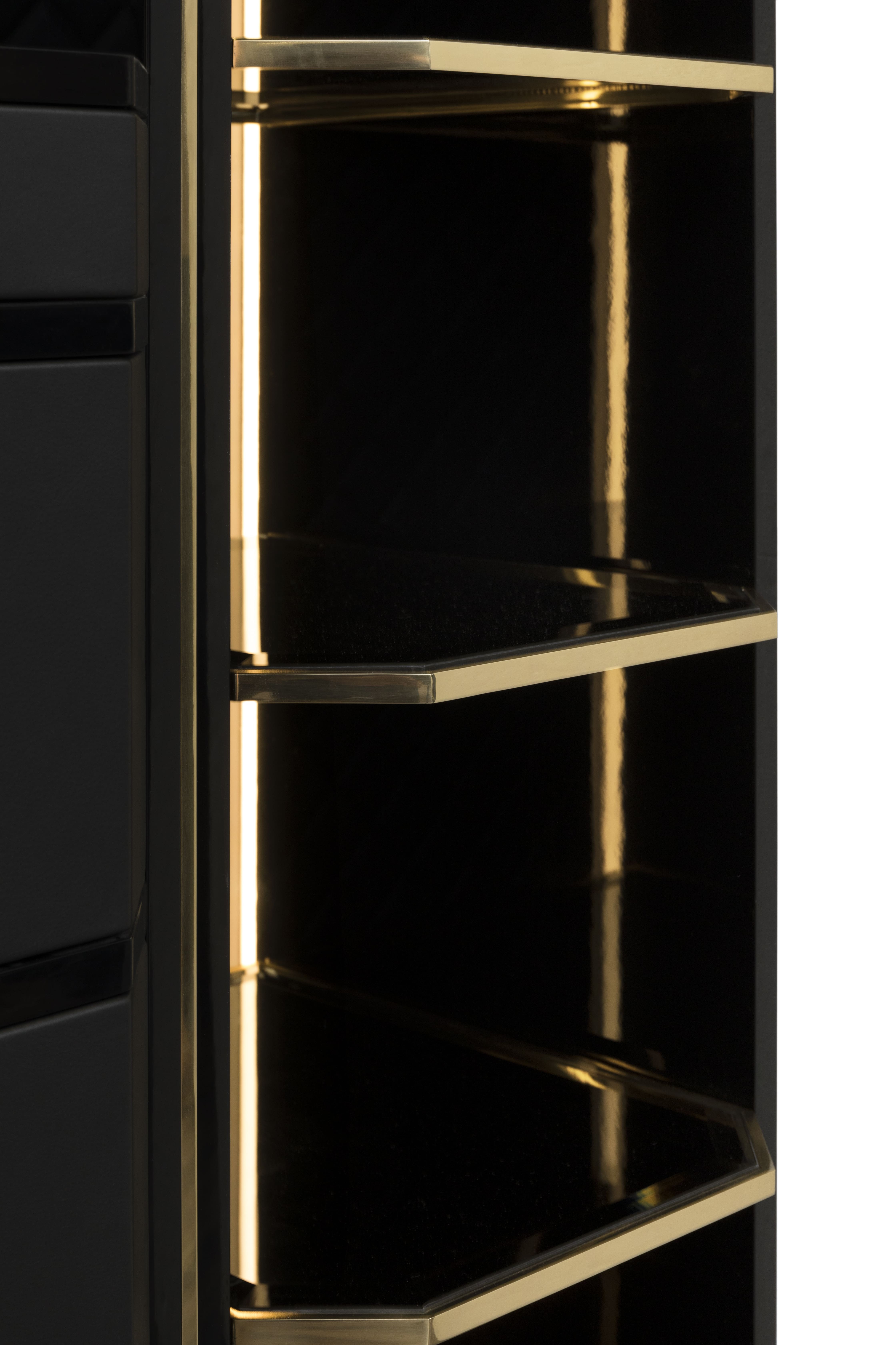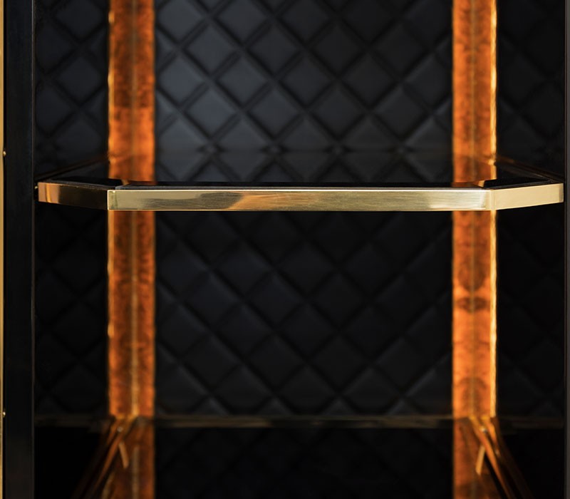 Waltz closet is an elegant modular clothing storage solution. Made with the finest materials, walnut root veneer, black leather, black lacquered wood, brass, and smoked mirror. Waltz is the ideal closet for a luxury master bedroom offering a fully customizable organization system. The Waltz is a modular piece, allowing different module combinations to better fit into your space.