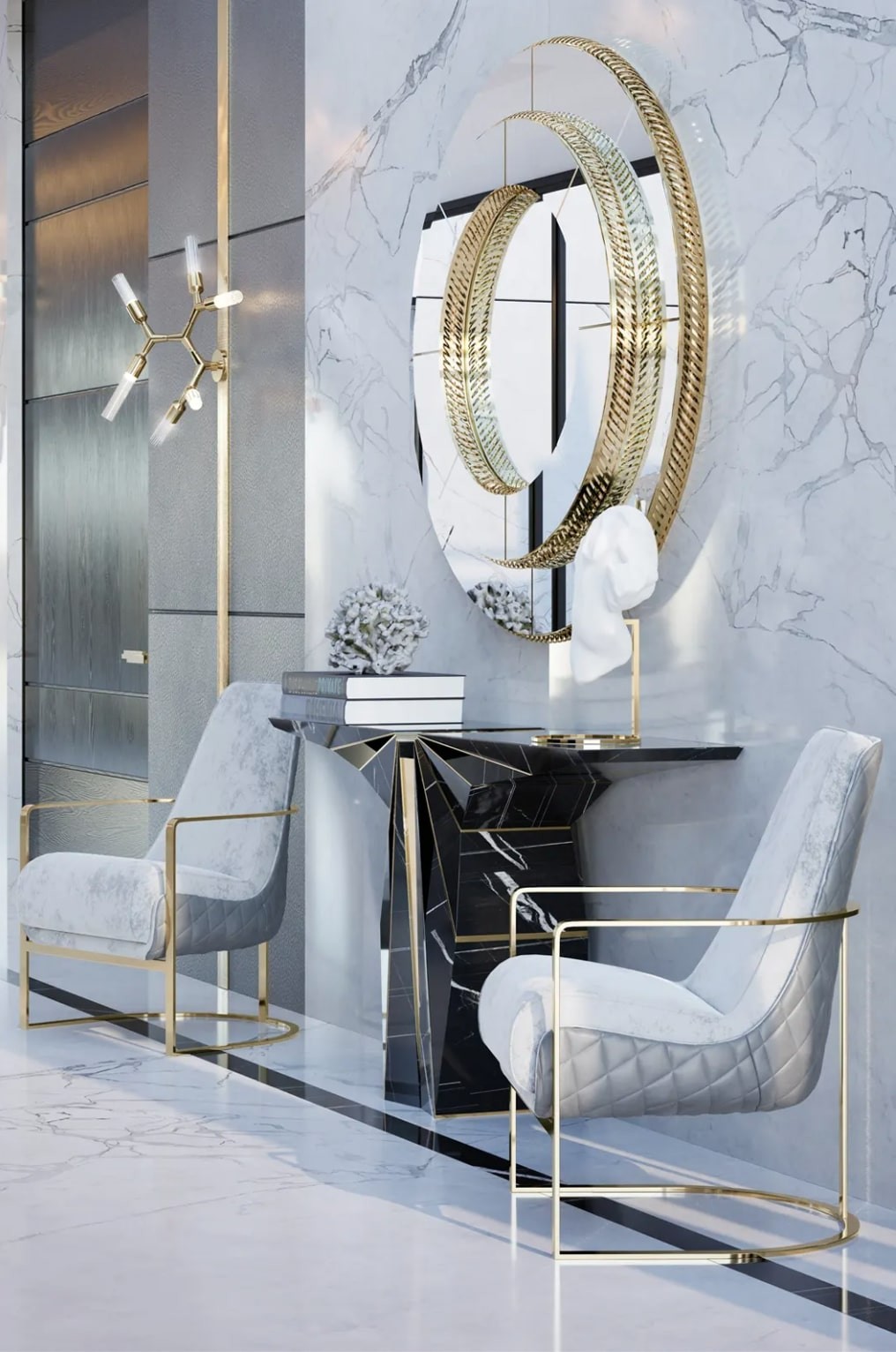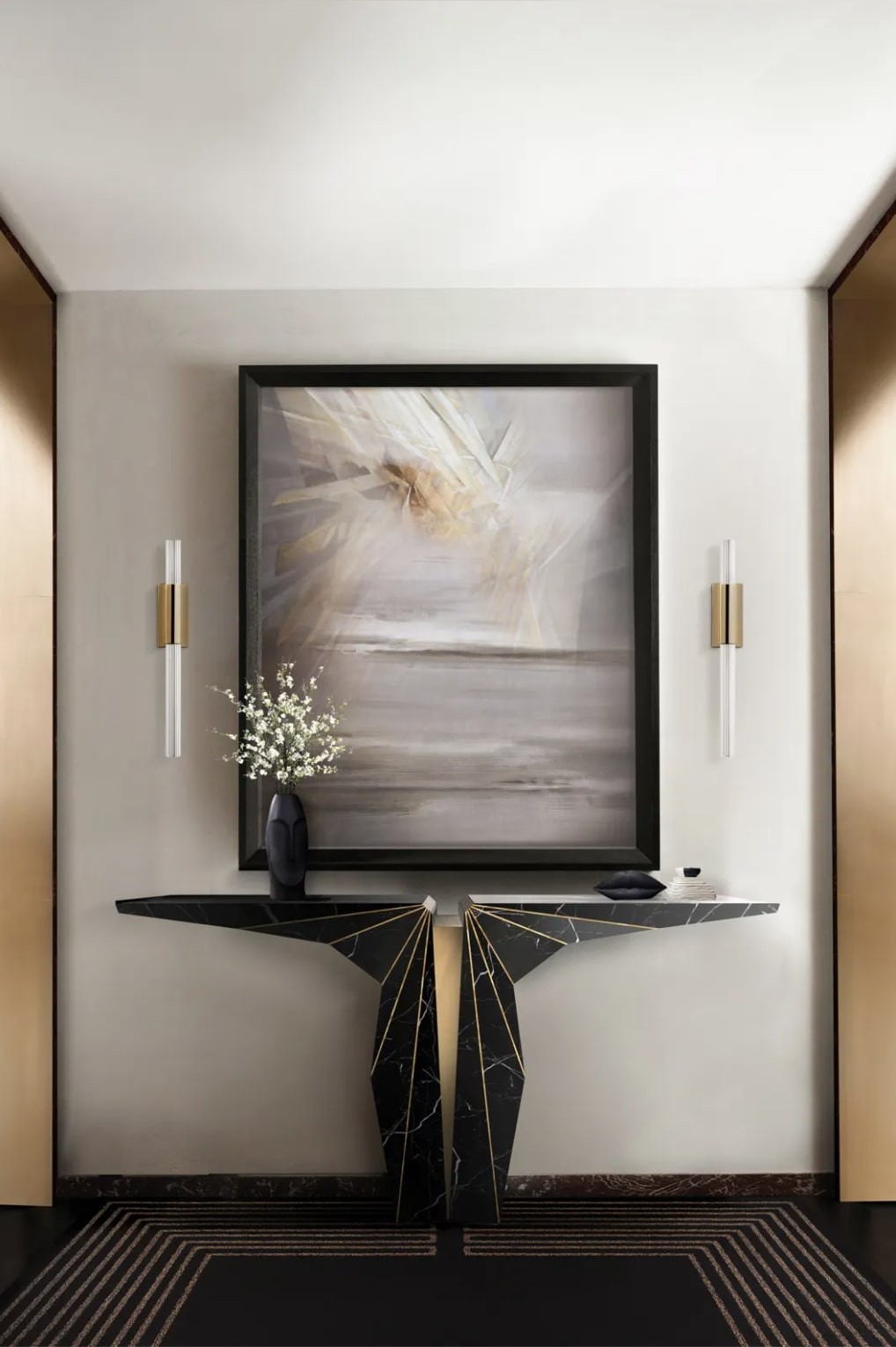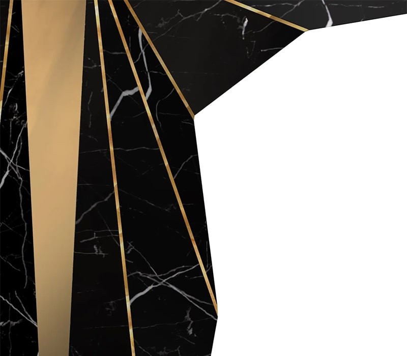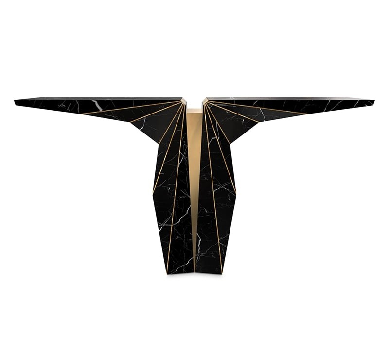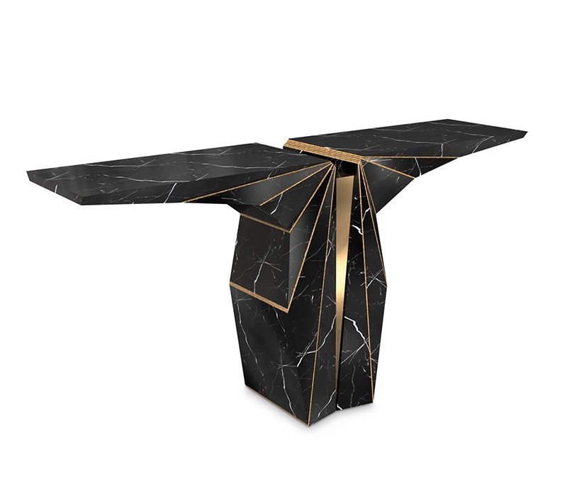The apogee elegance, the Suspicion Console is daringly sculpted in stone and fills any room with lavishing luxury. This marble console table is the epitome of intricate equilibrium, joining marble with fine brass lines.