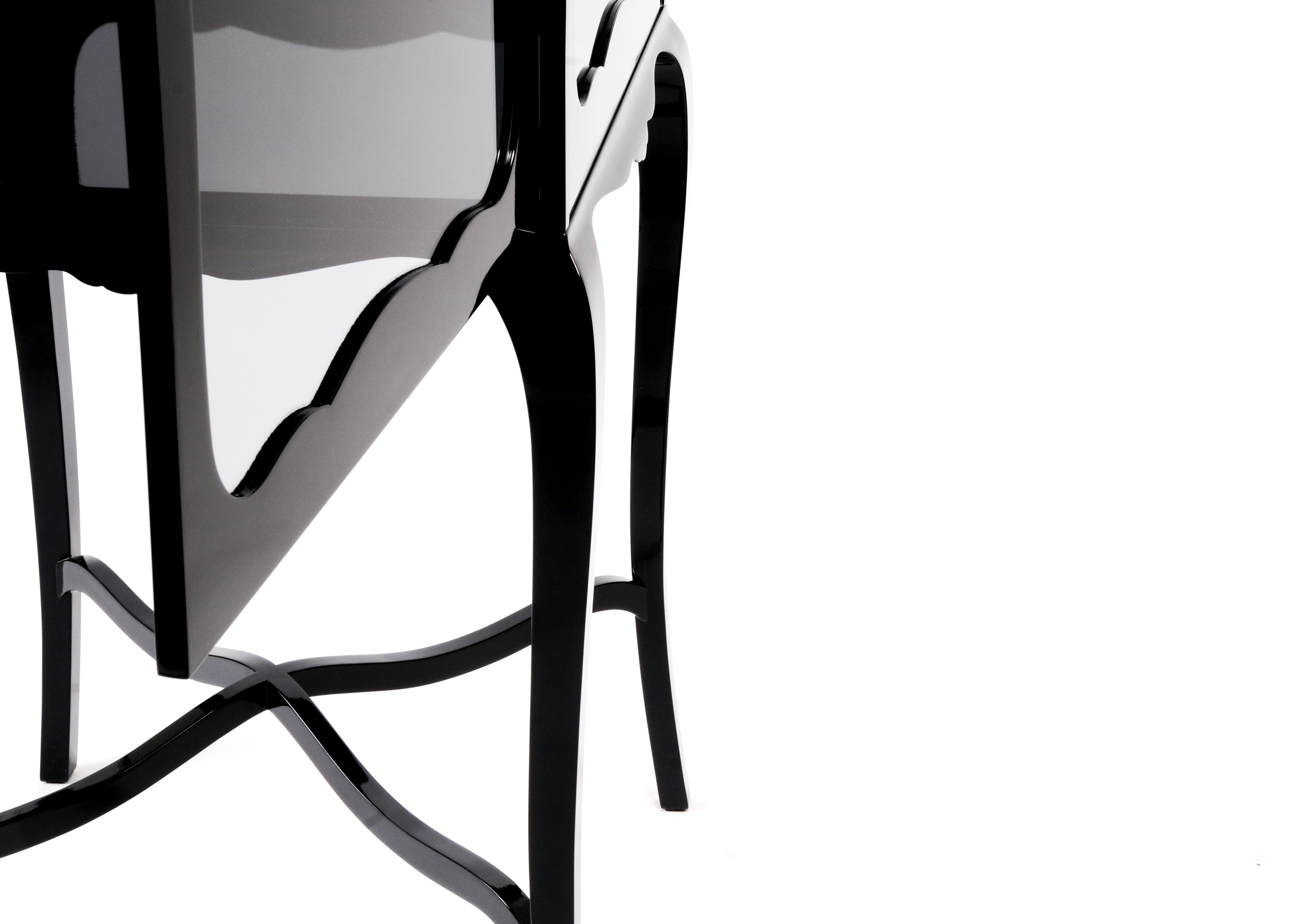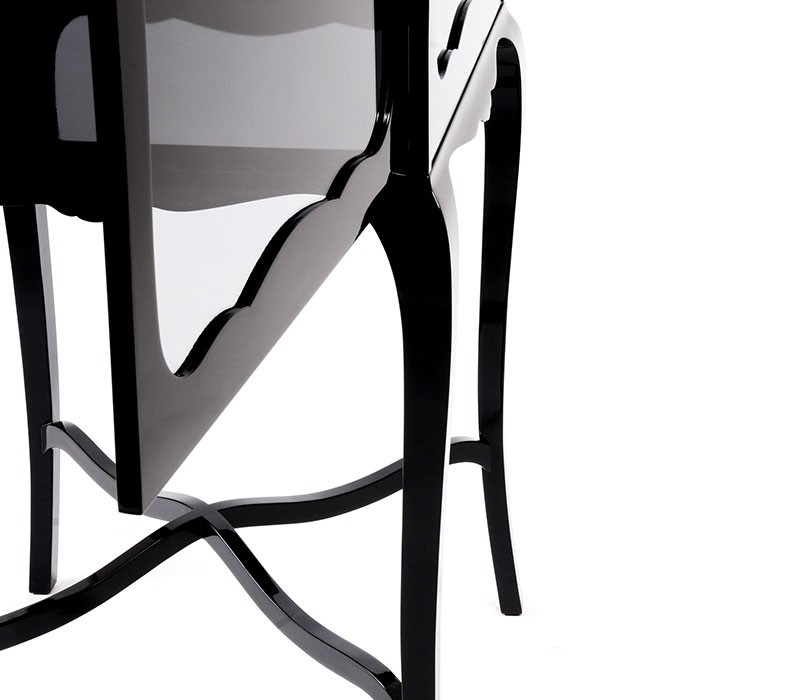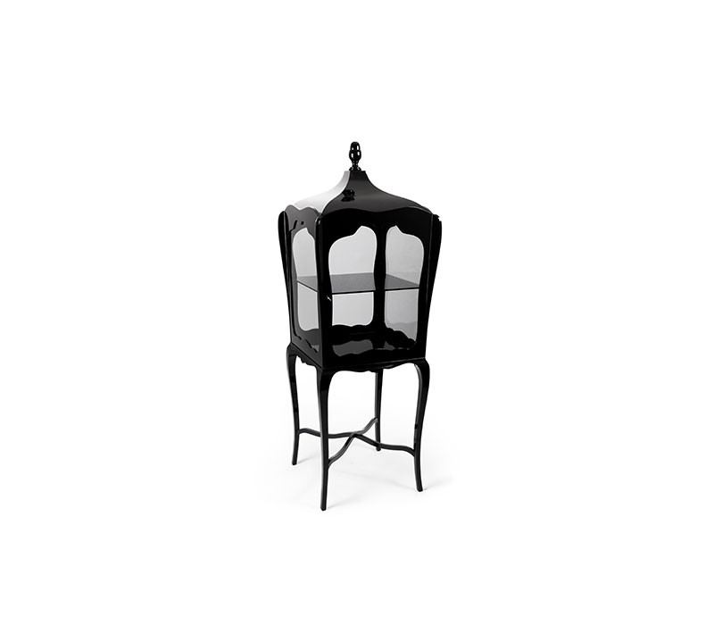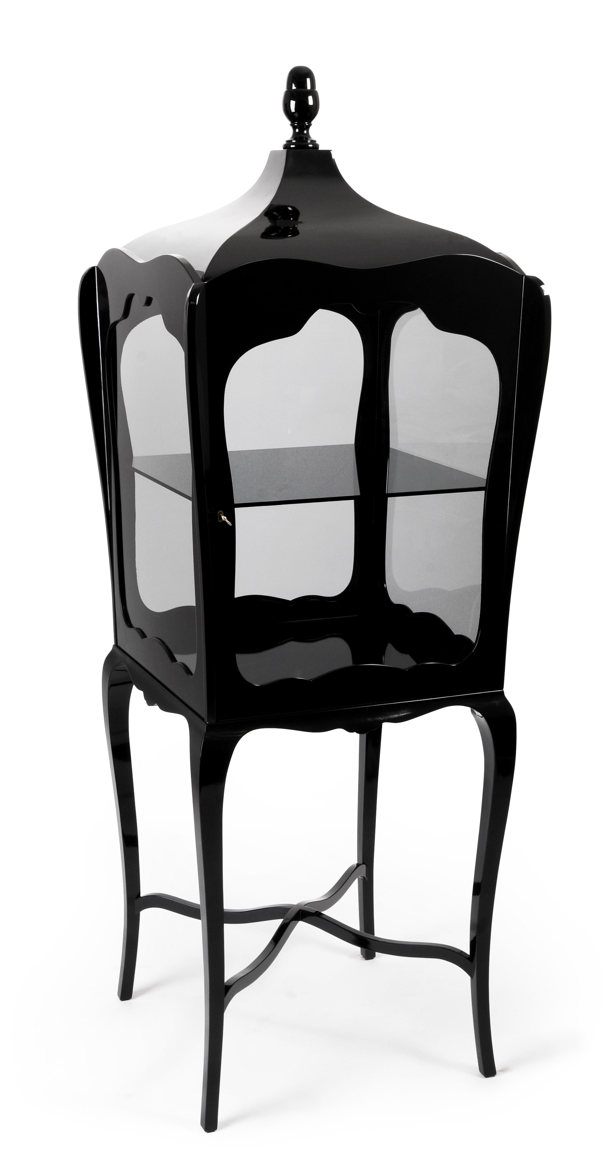 A reinterpretation of 17th-century French Style glass display cases of countryside Chateaux, the Palatino Slim Display Cabinet is an elegant storage piece whose lines easily capture the imagination and holds the best things in life. The black detailed frame is handcrafted in mahogany and supports four panels of clear glass. Behind its door that opens through a golden knob and closing switch, the interior boasts a single shelf in tempered glass. A versatile yet timeless case piece to showcase precious objects in different private homes or contract projects, from the most contemporary interior design rooms to the most classic interiors.