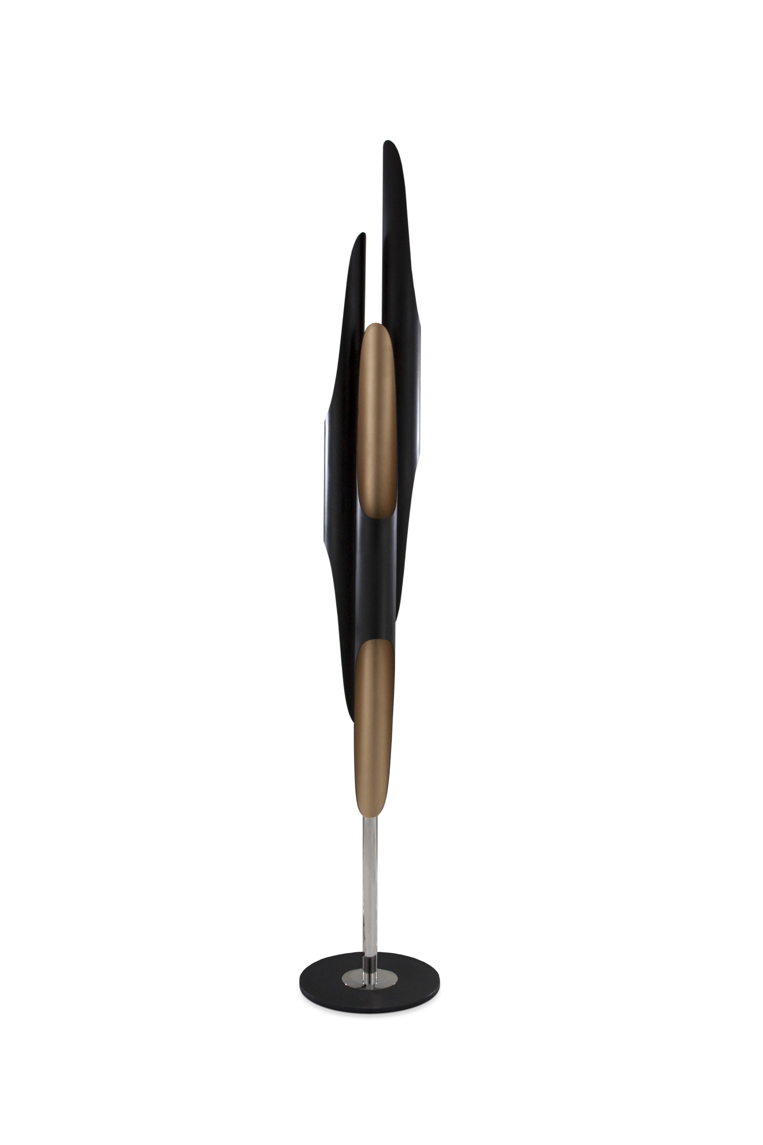 Inspired by the American jazz saxophonist and composer John Coltrane, Coltrane floor lamp embodies the avant-garde jazzy vibe that this legendary musician transmitted in every music concert. Handmade in brass and aluminum, the minimal black floor lamp has a matte black finish on the three lamp shades with a gold powder paint on the inside, that provide a smooth lighting effect. This functional floor lamp is ideal for minimalist settings, as well as for, mid-century modern reading nooks.