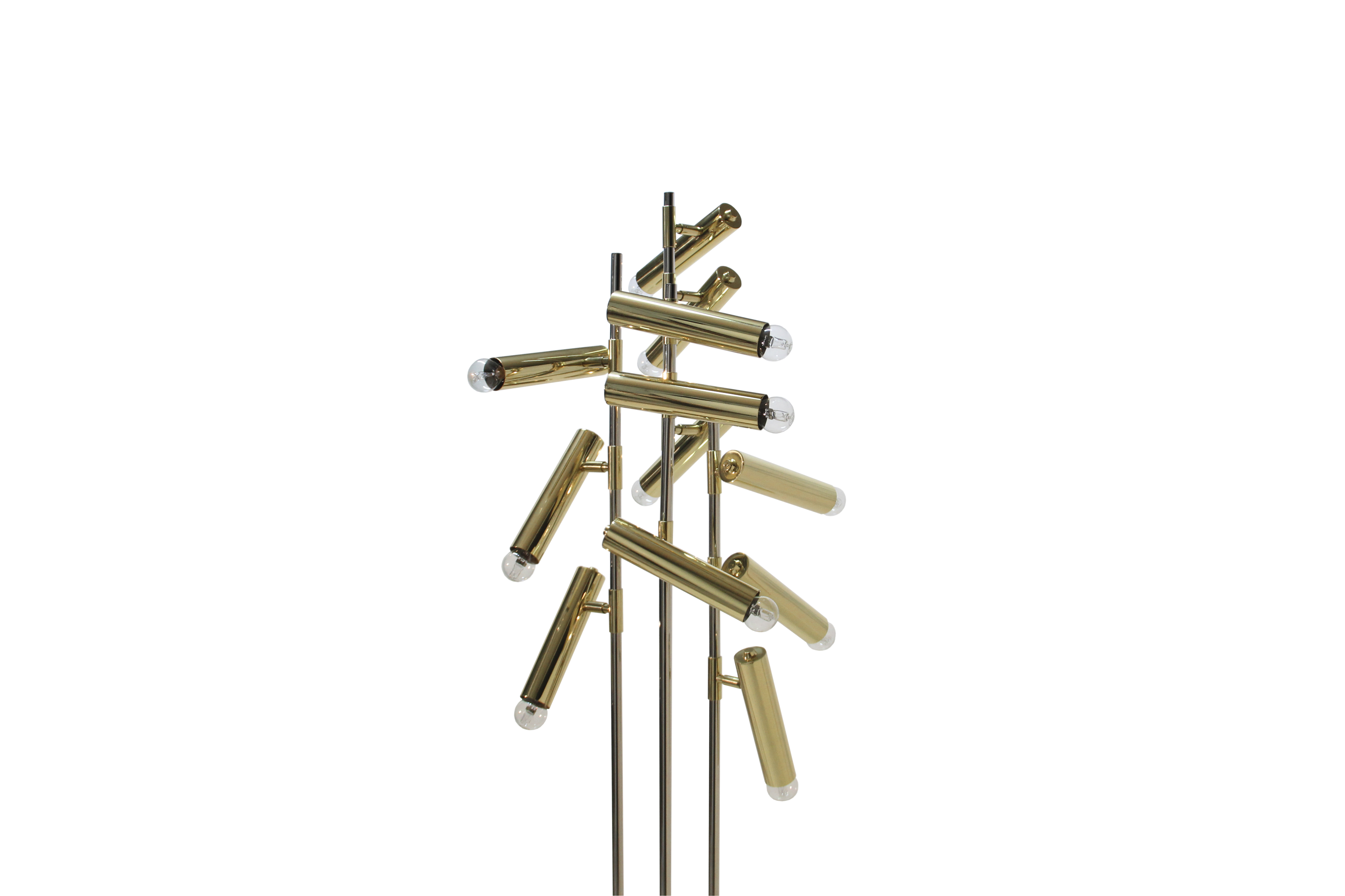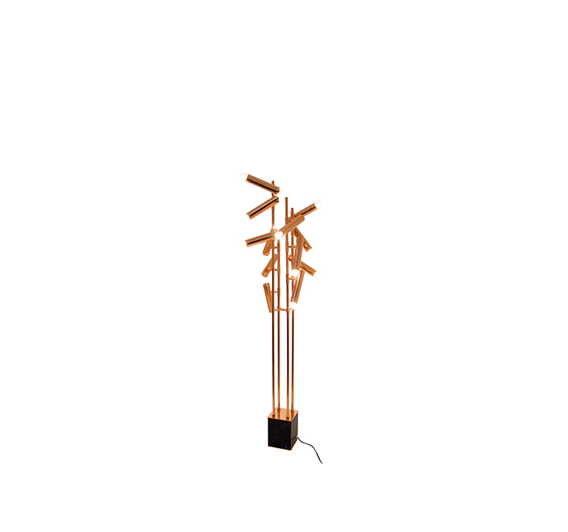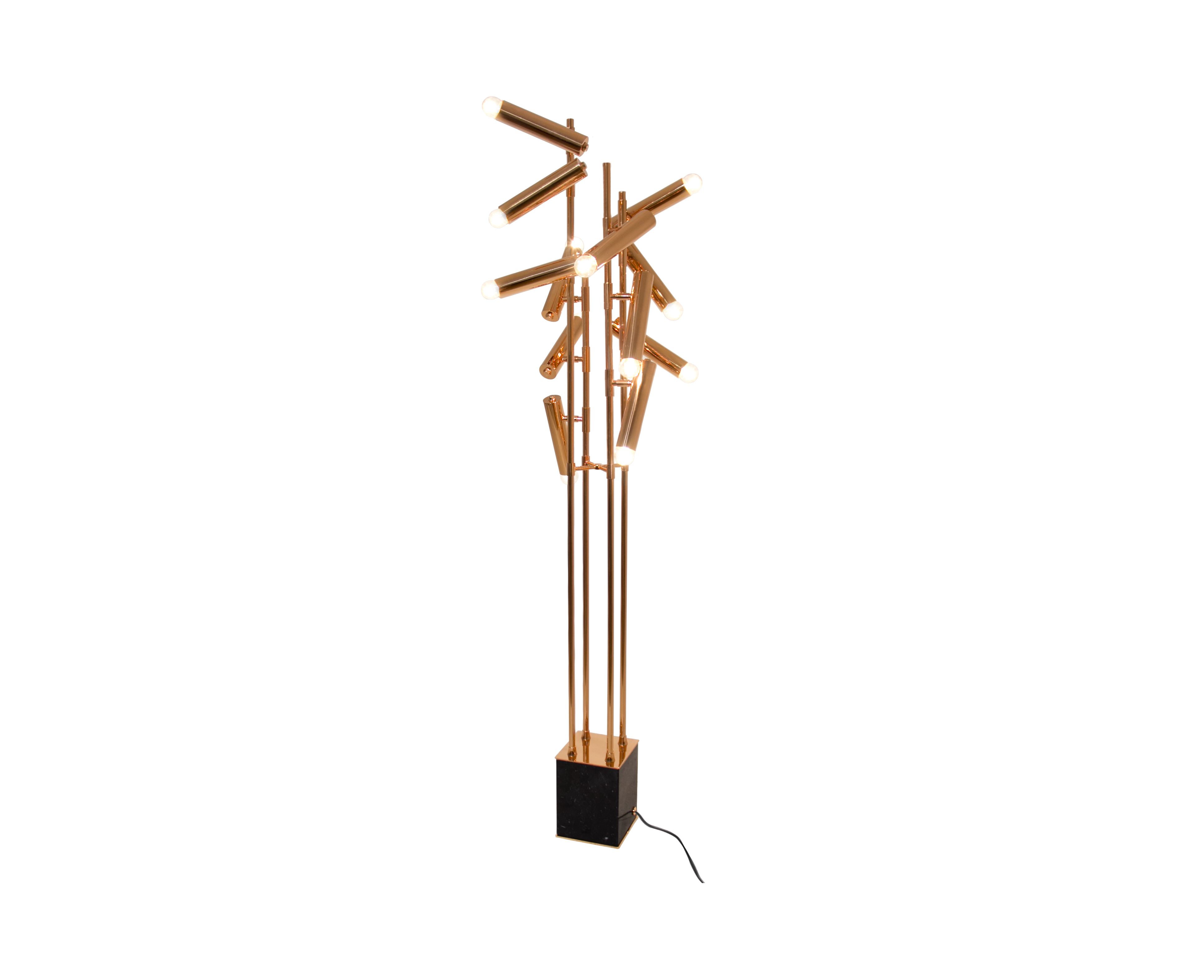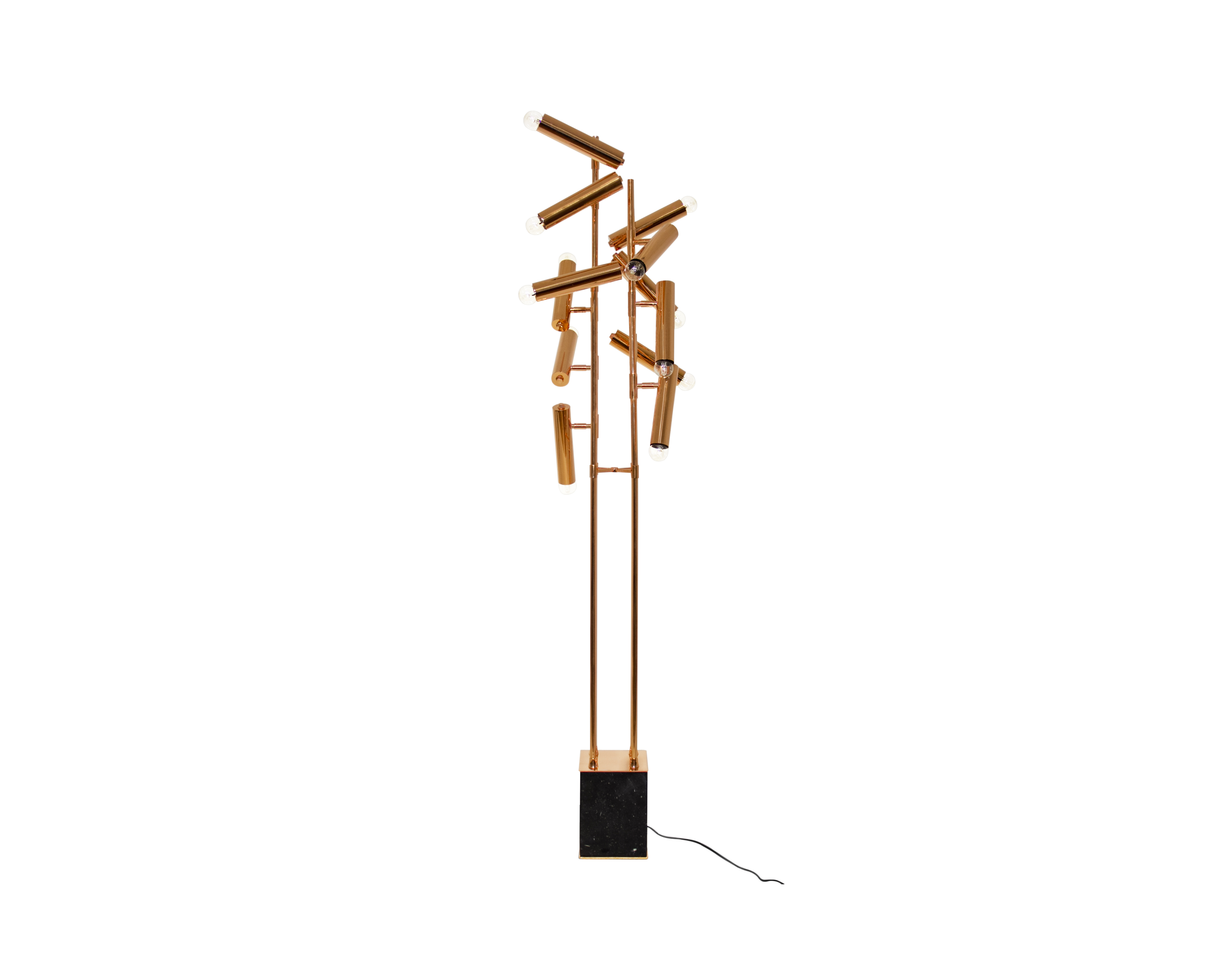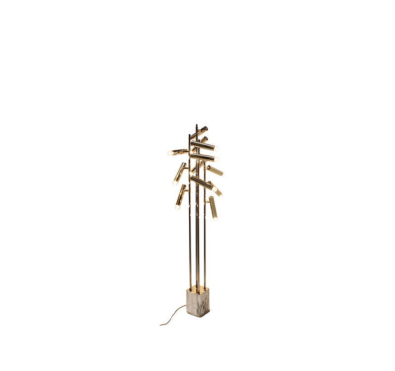 CYPRES, Latin for Cypress, is a tree of many symbolisms and ornamental capabilities, often seen in artistic works and gardens. The unmistakable foliage grows in dense, dark green sprays which lends a full imposing body to the tree. CYPRES Floor Lamp stands strong like the tree with its four gold plated brass sprouts emerging from the Carrara marble base, and the lamps acting as the oblong seed cones fully illuminating your bathroom.
