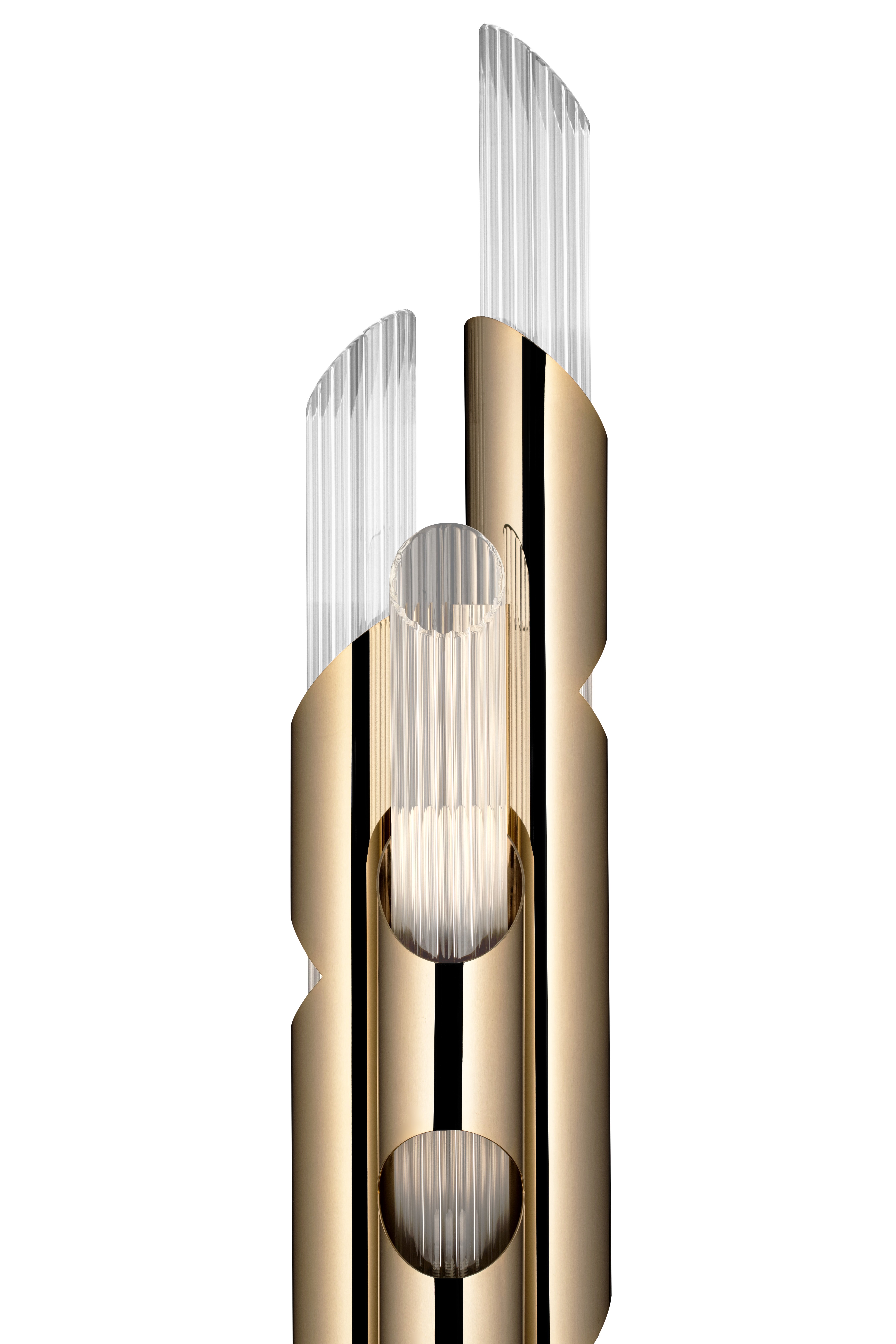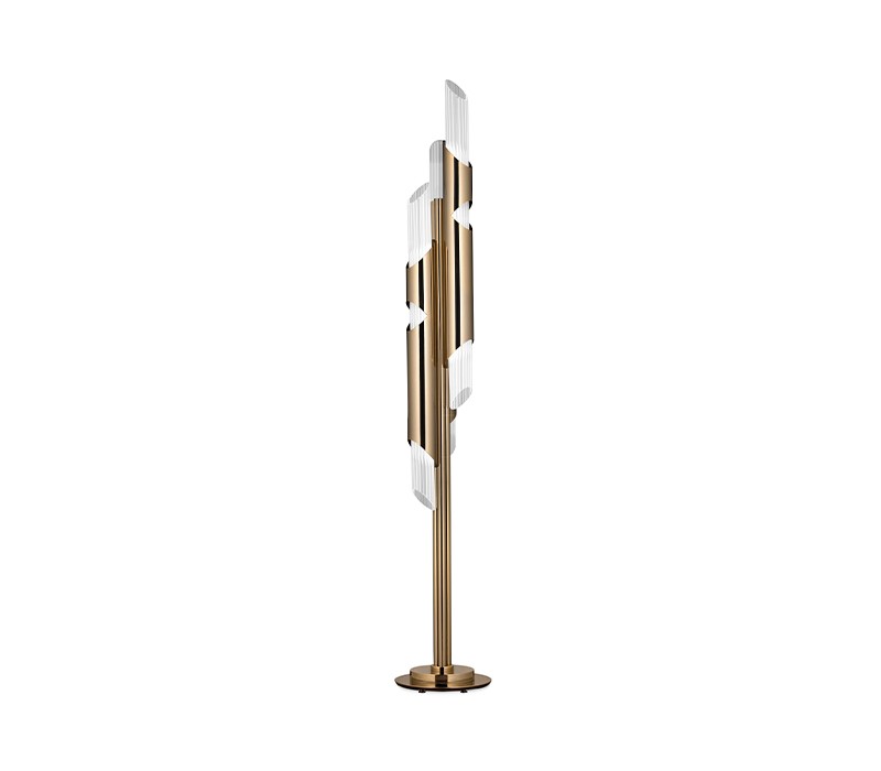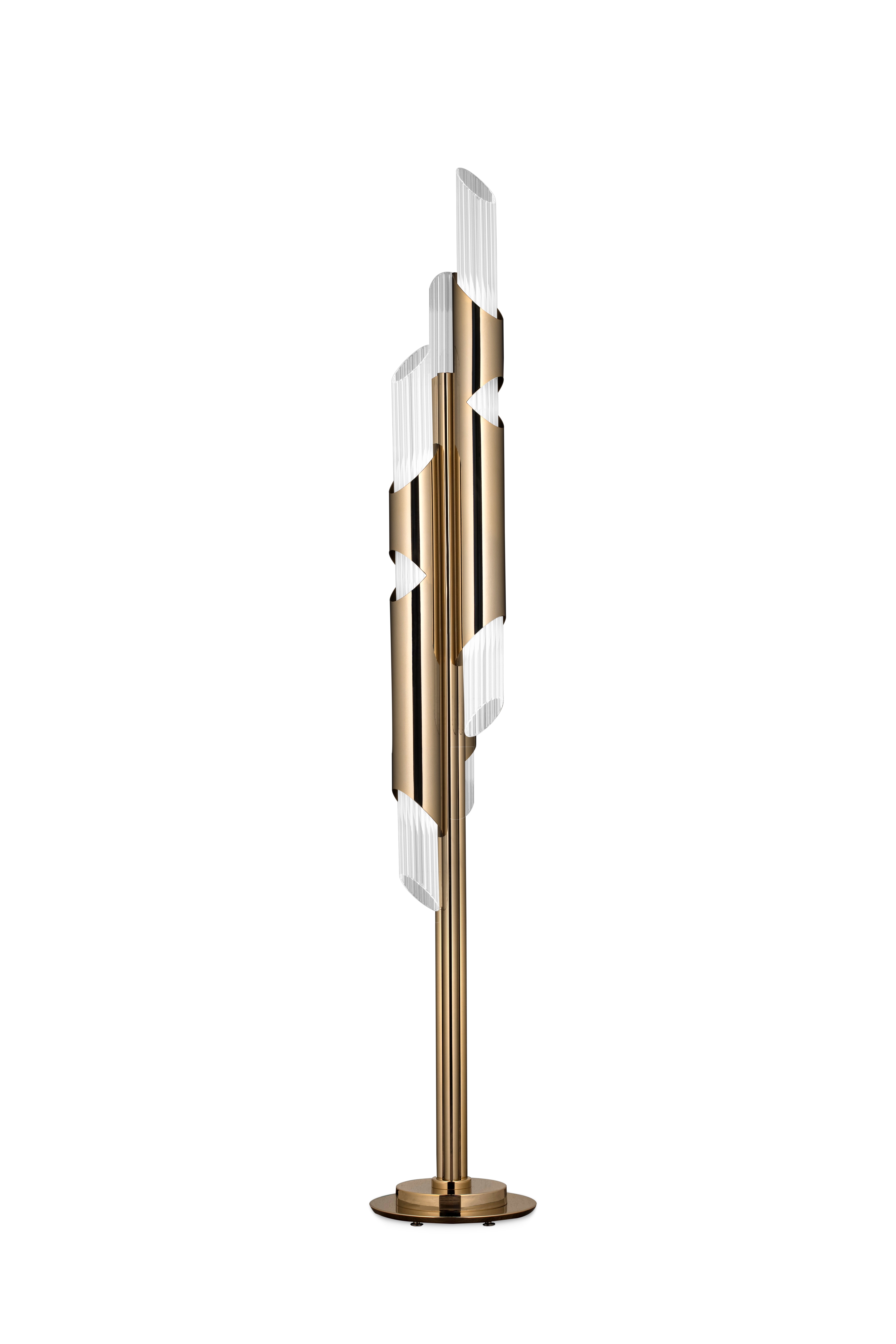 Draycott takes a different posture to create an elegant standing gold plated brass item with subtle lines, complemented by delicate crystals tubes like the original inspiration. Sober and exquisite, transmitting elegance and purity to every space, this floor lighting was designed to bring the most luxurious pleasure to any contemporary ambiance.