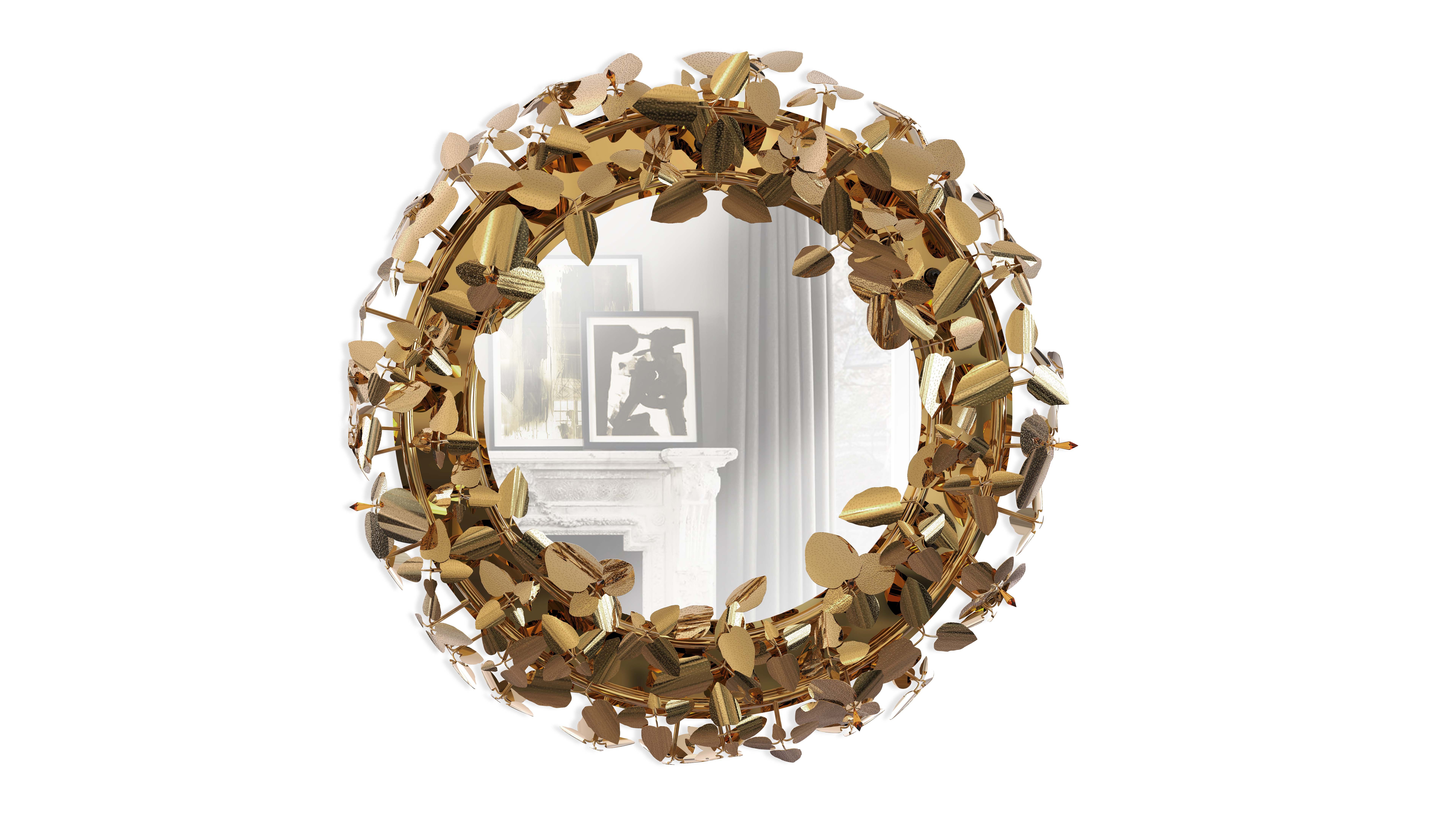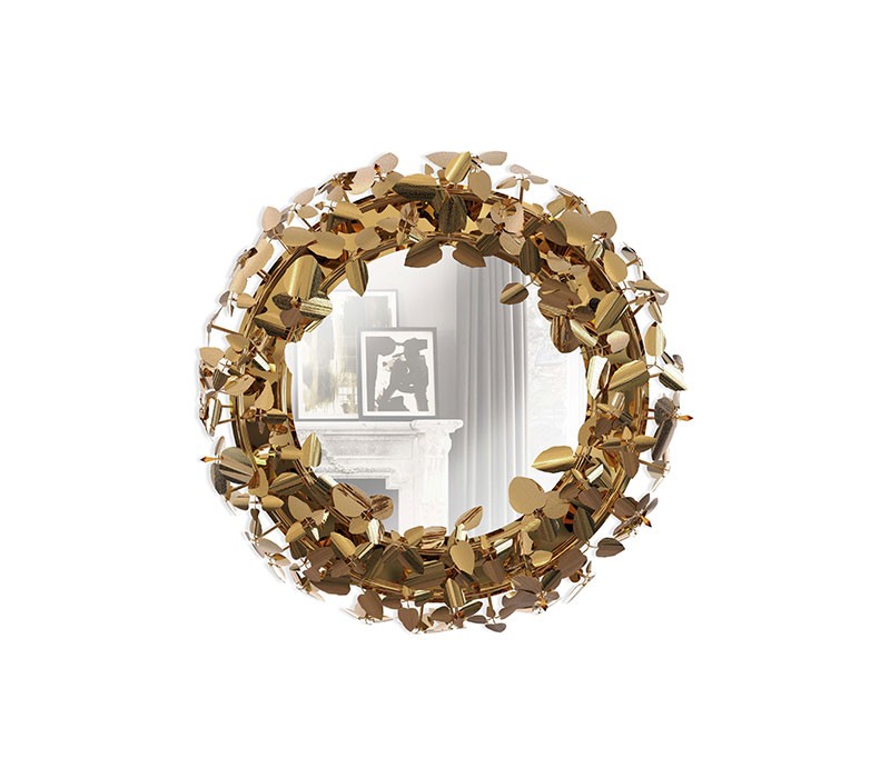 A meticulously designed beauty object. The approach to the epitome of contemporary luxury is kept in the tradition of the jewelry artisans. Like a savage beauty, this elegant mirror brings the powerful evocation of the sublime. The magnificent foliage is made of hammered brass with the gold-plated finish and a rhythmic luminosity of the crystals.