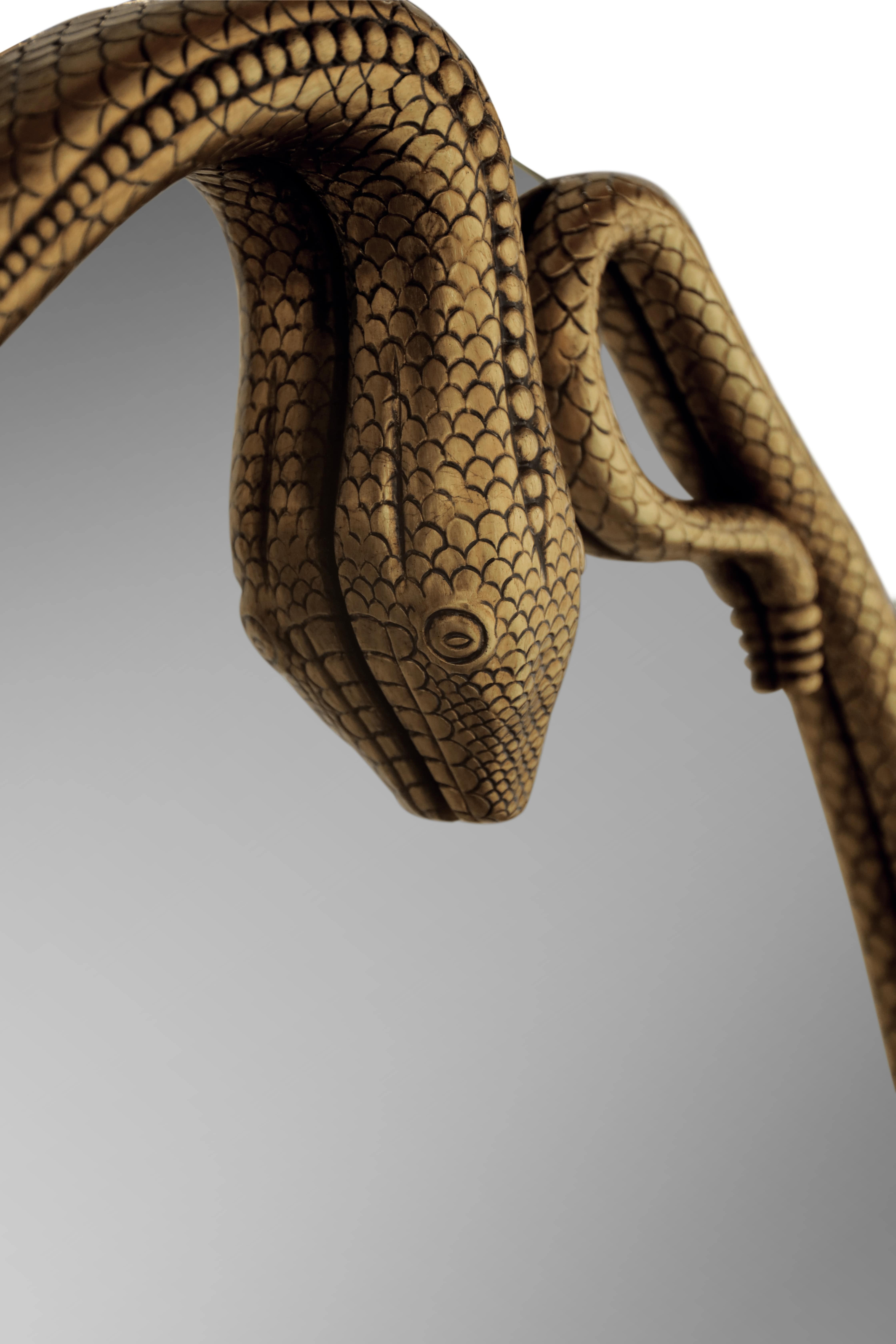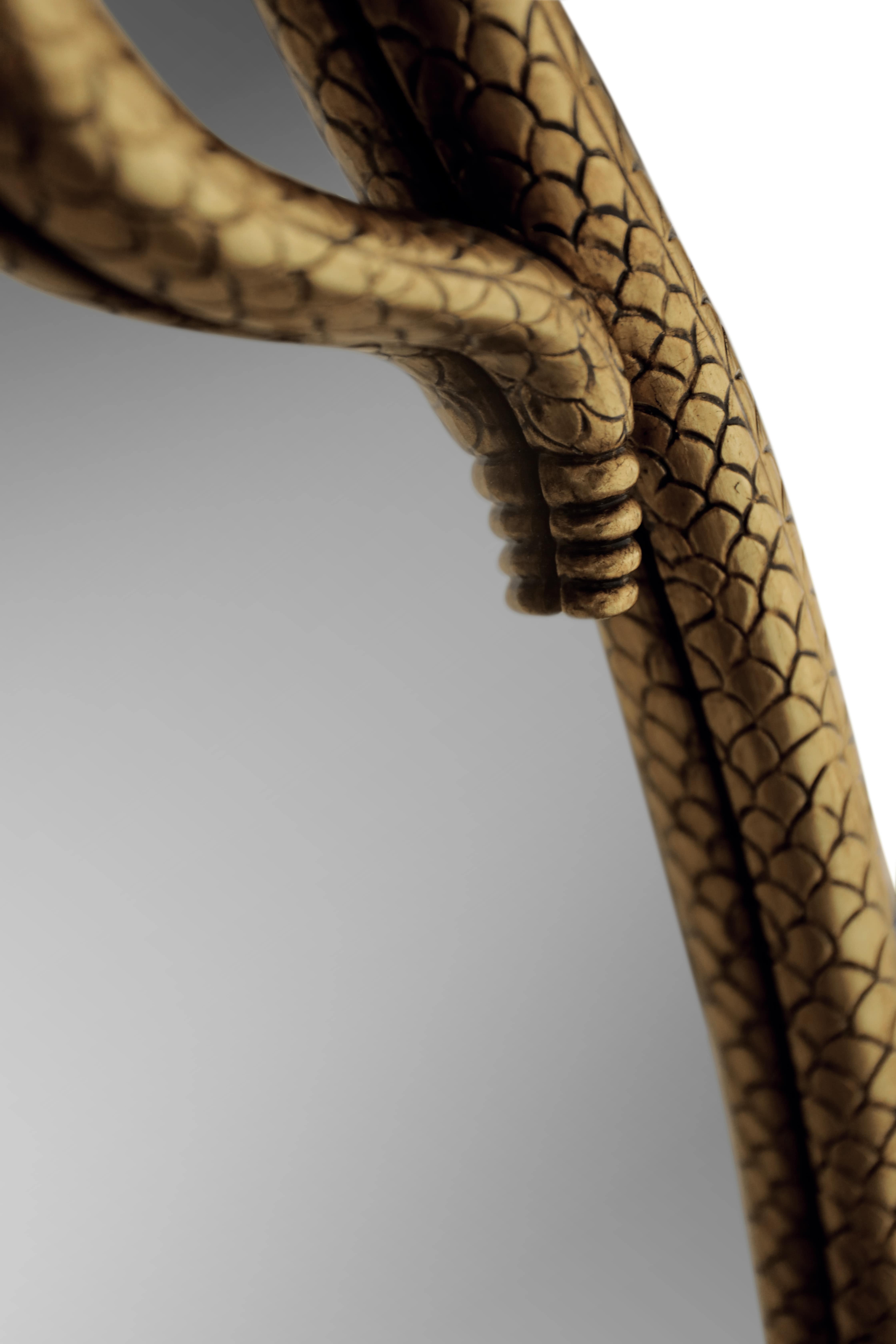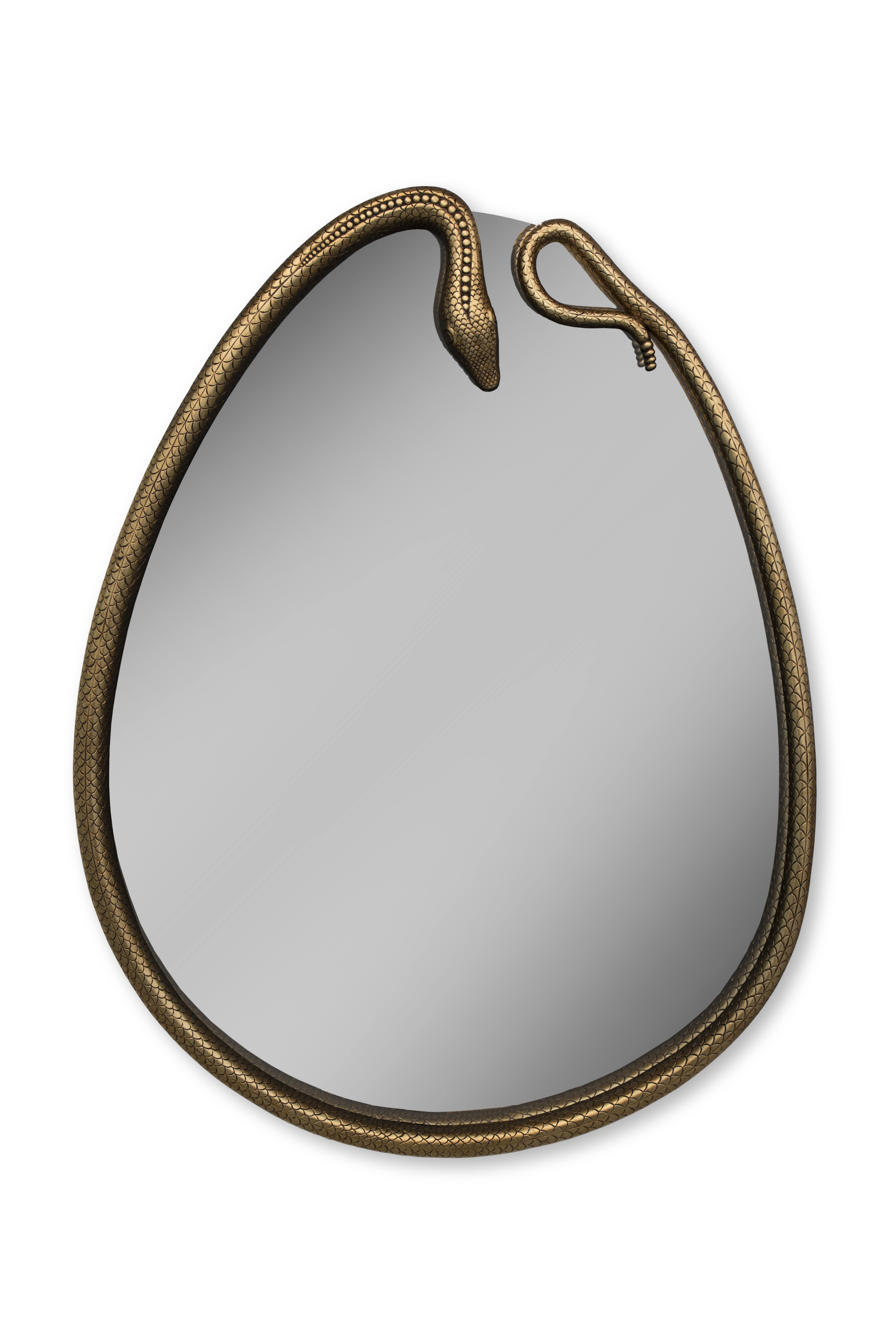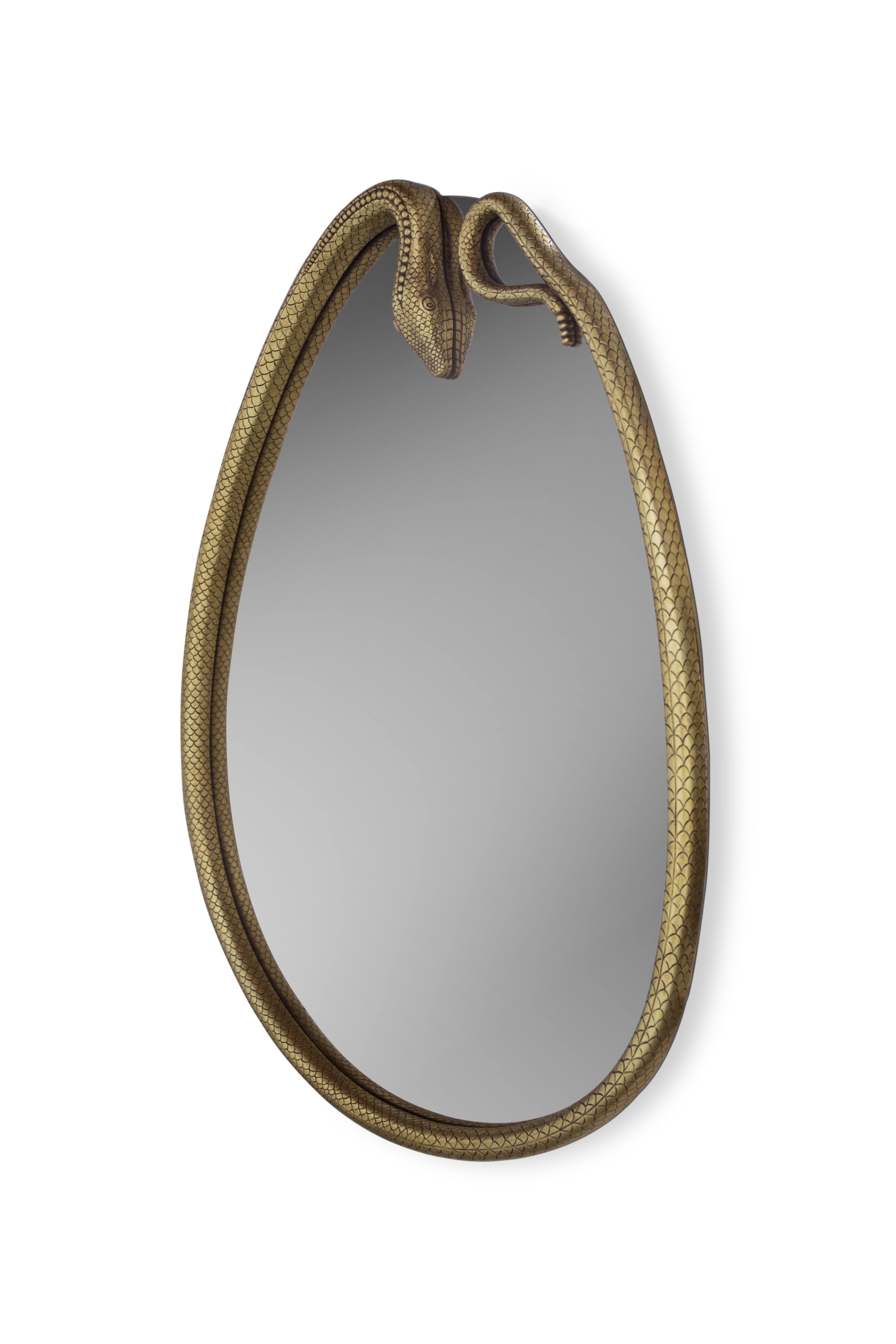 Be transformed as you gaze into the Serpentine's pear-shaped mirror. Framed in a coiled serpent form made of hand-carved wood, this mirror is the perfect way to add a touch of exoticism to any interior setting.