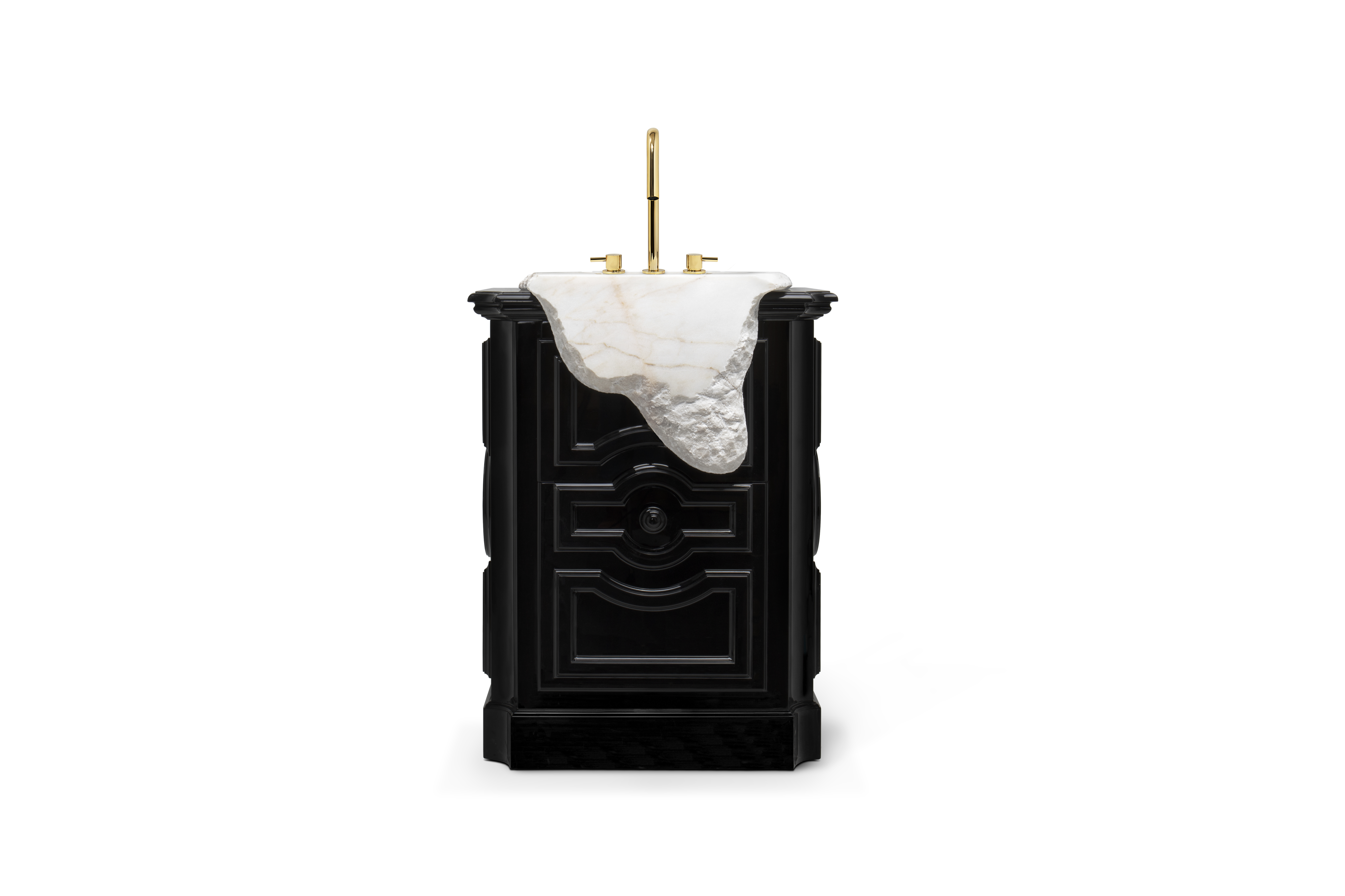 The melted marble look of the Petra Modern Pedestal Sink was made to look like the City of Petra. This modern freestanding features a high gloss black lacquered wood structure with a spacious and functional drawer on the front. It is finished with a carved melted vessel sink made entirely by one single block of Estremoz Marble, awarding a luxurious glow to a bathroom interior.