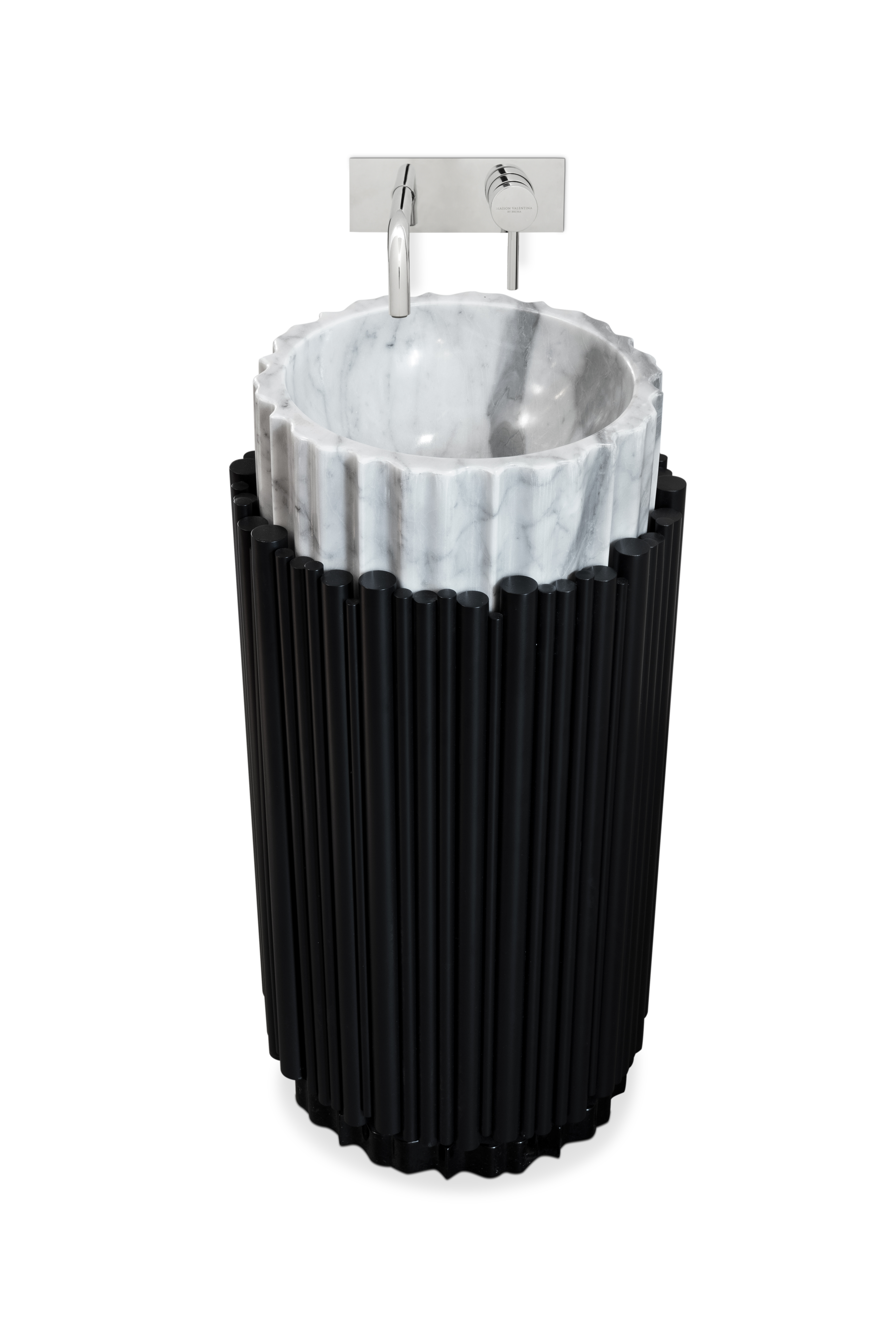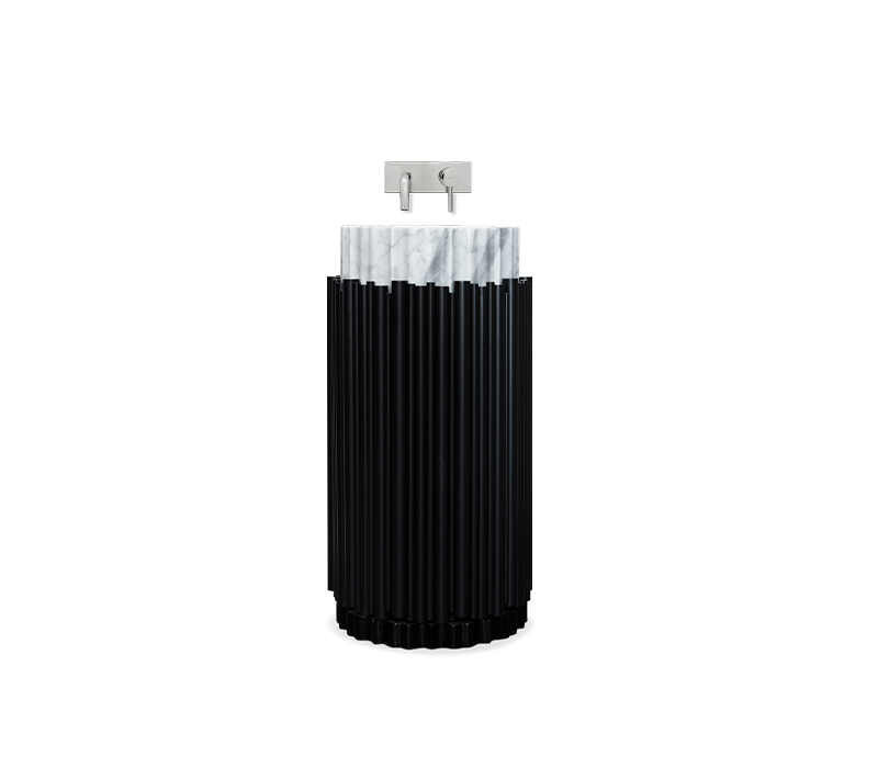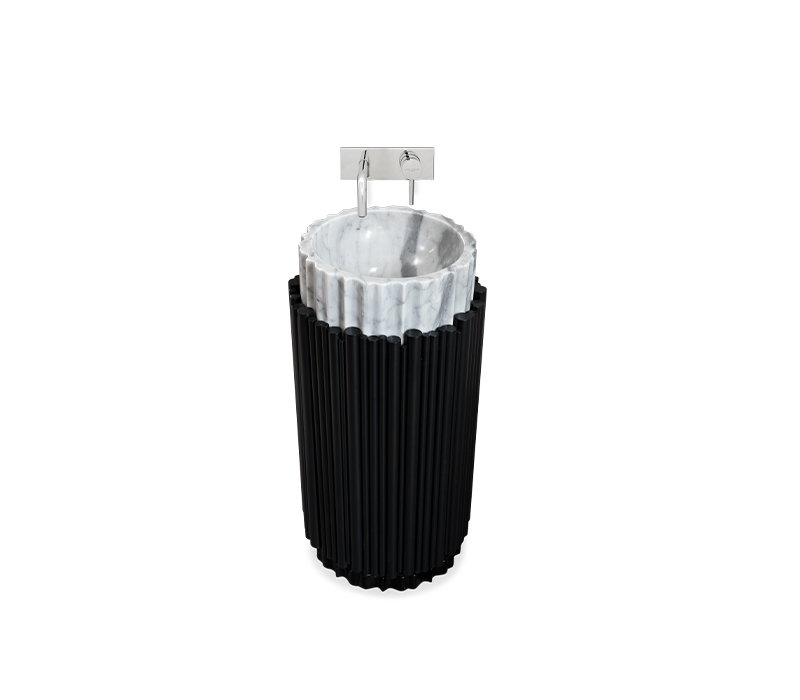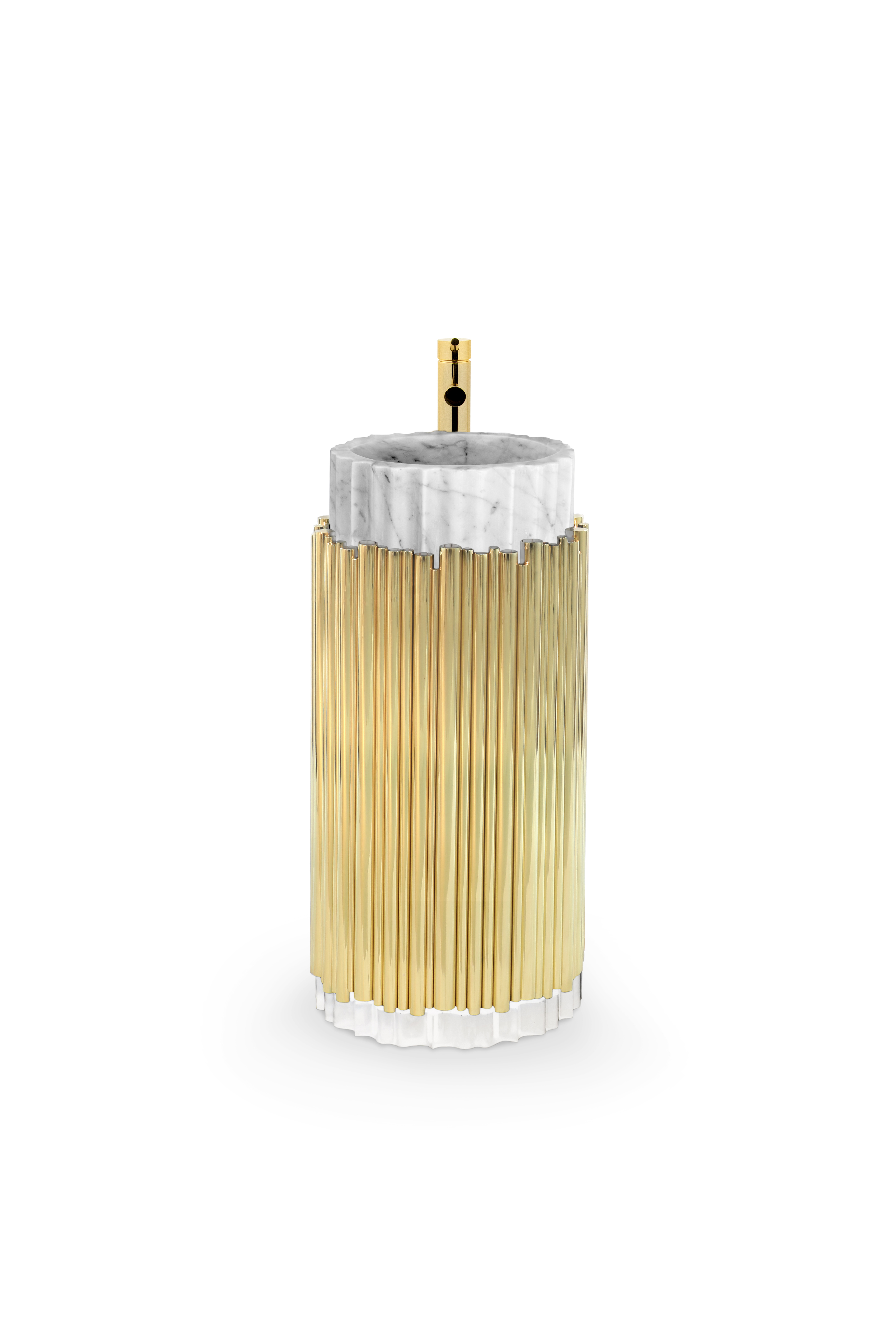 The Symphony Pedestal Sink draws inspiration from church organ tubes, as well as the curves of a violin. This modern freestanding is handmade by experienced craftsmen with different specialties, from metalwork to wood carving. It features a cluster of polished brass tubes that envelopes an exotic wood structure, bringing a lush ambiance to your bathroom set.