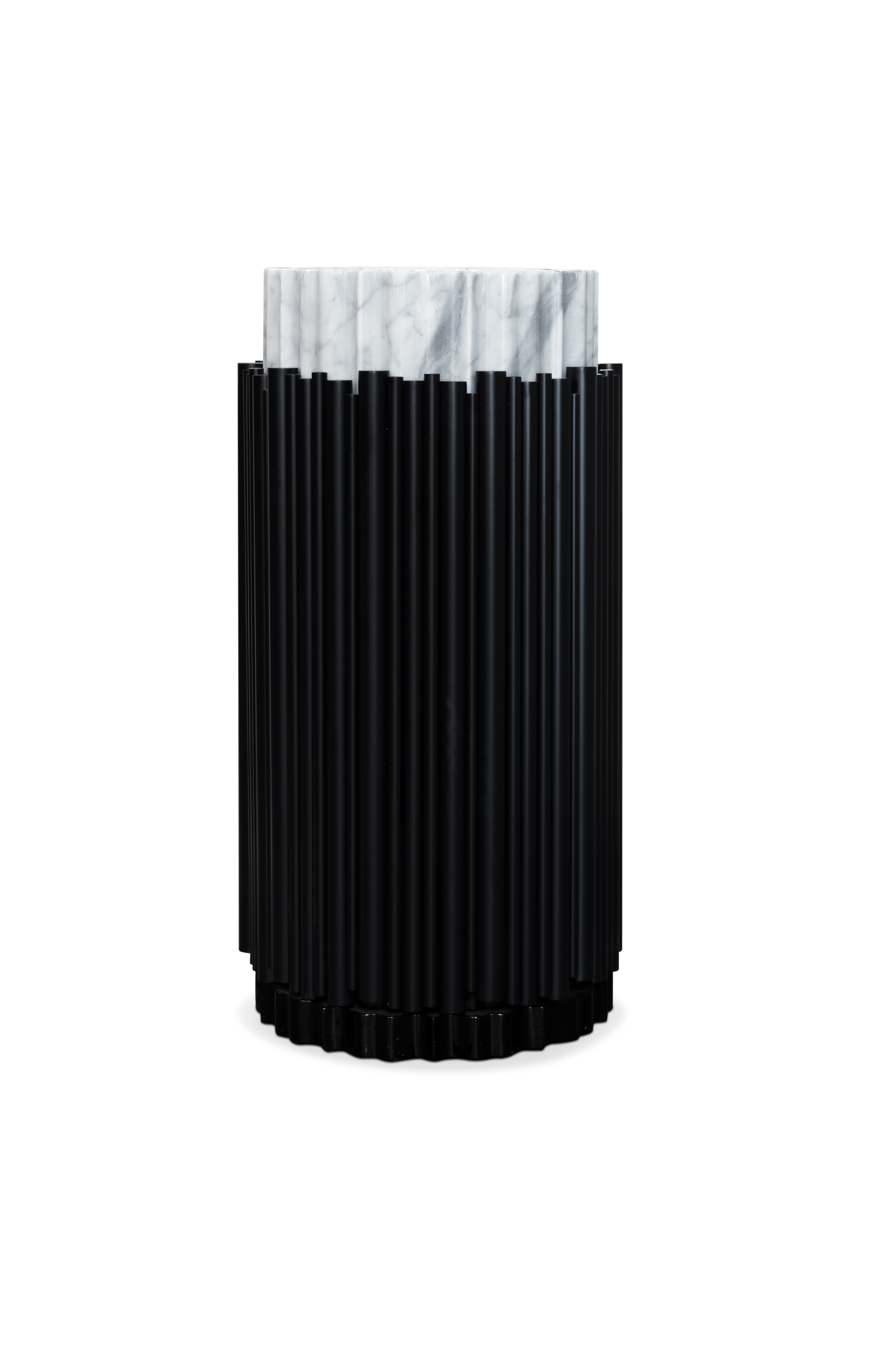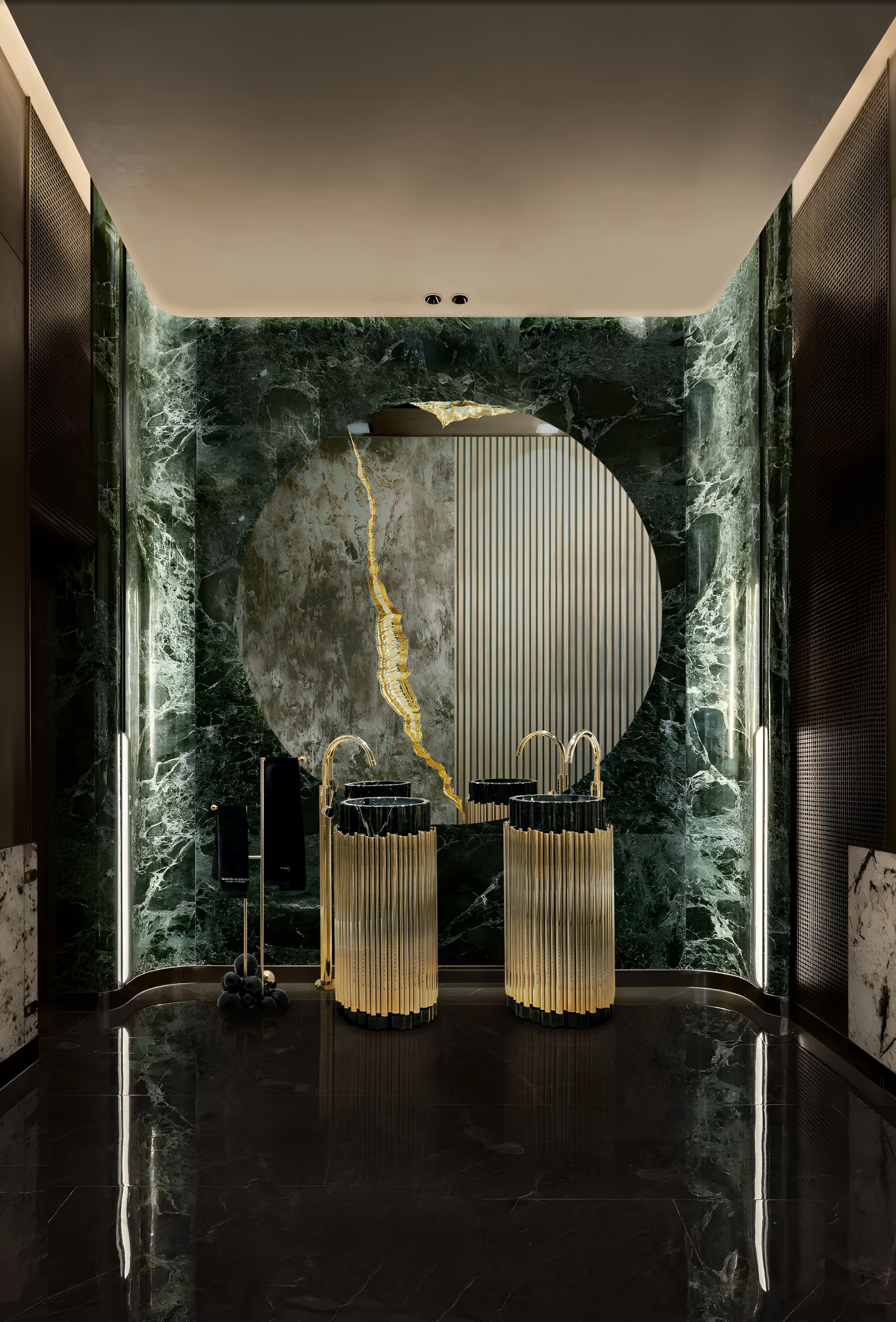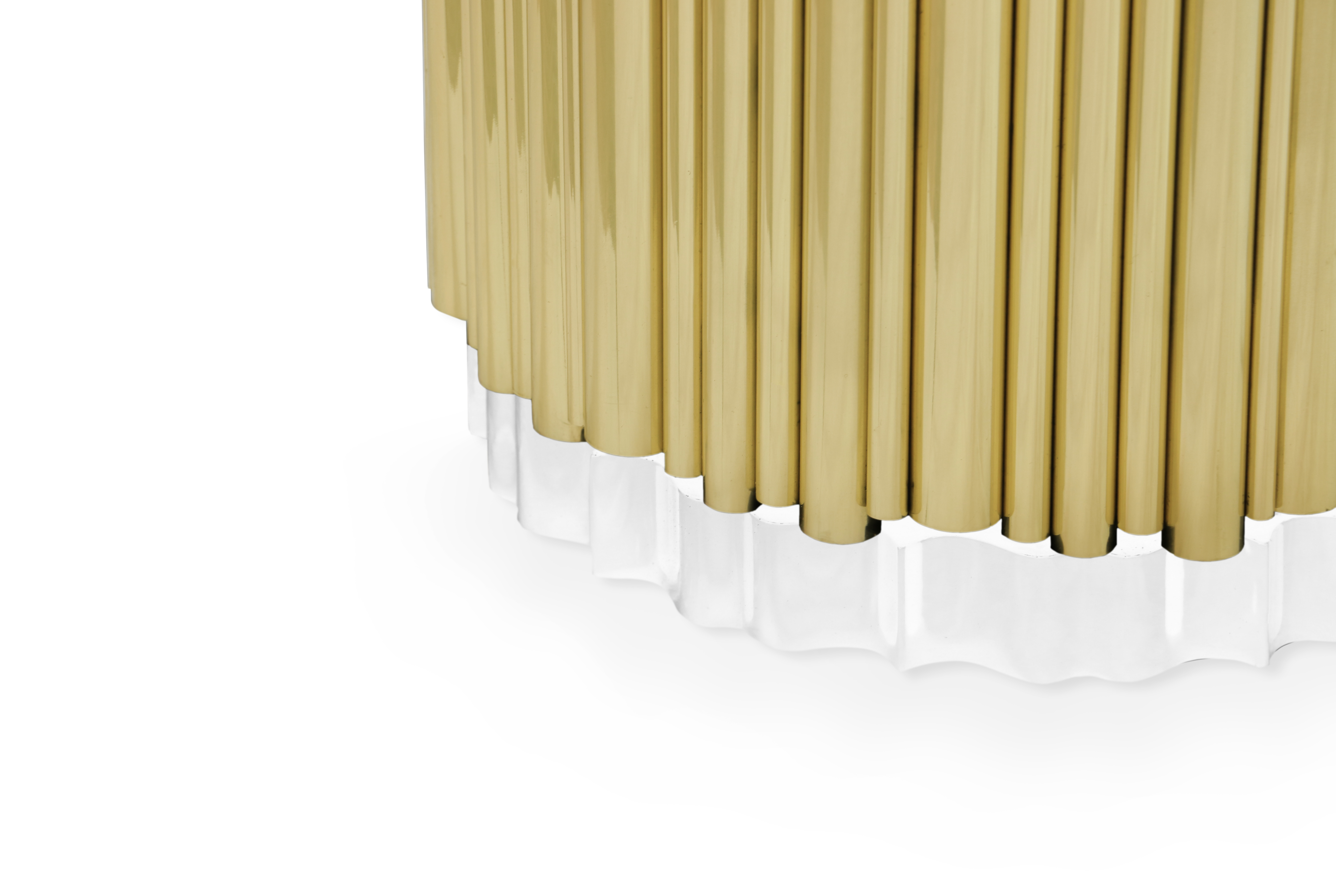 The Symphony Pedestal Sink draws inspiration from church organ tubes, as well as the curves of a violin. This modern freestanding is handmade by experienced craftsmen with different specialties, from metalwork to wood carving. It features a cluster of polished brass tubes that envelopes an exotic wood structure, bringing a lush ambiance to your bathroom set.