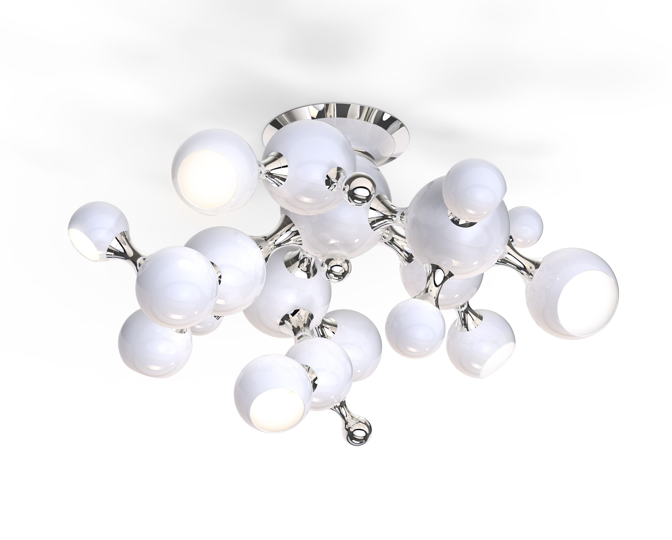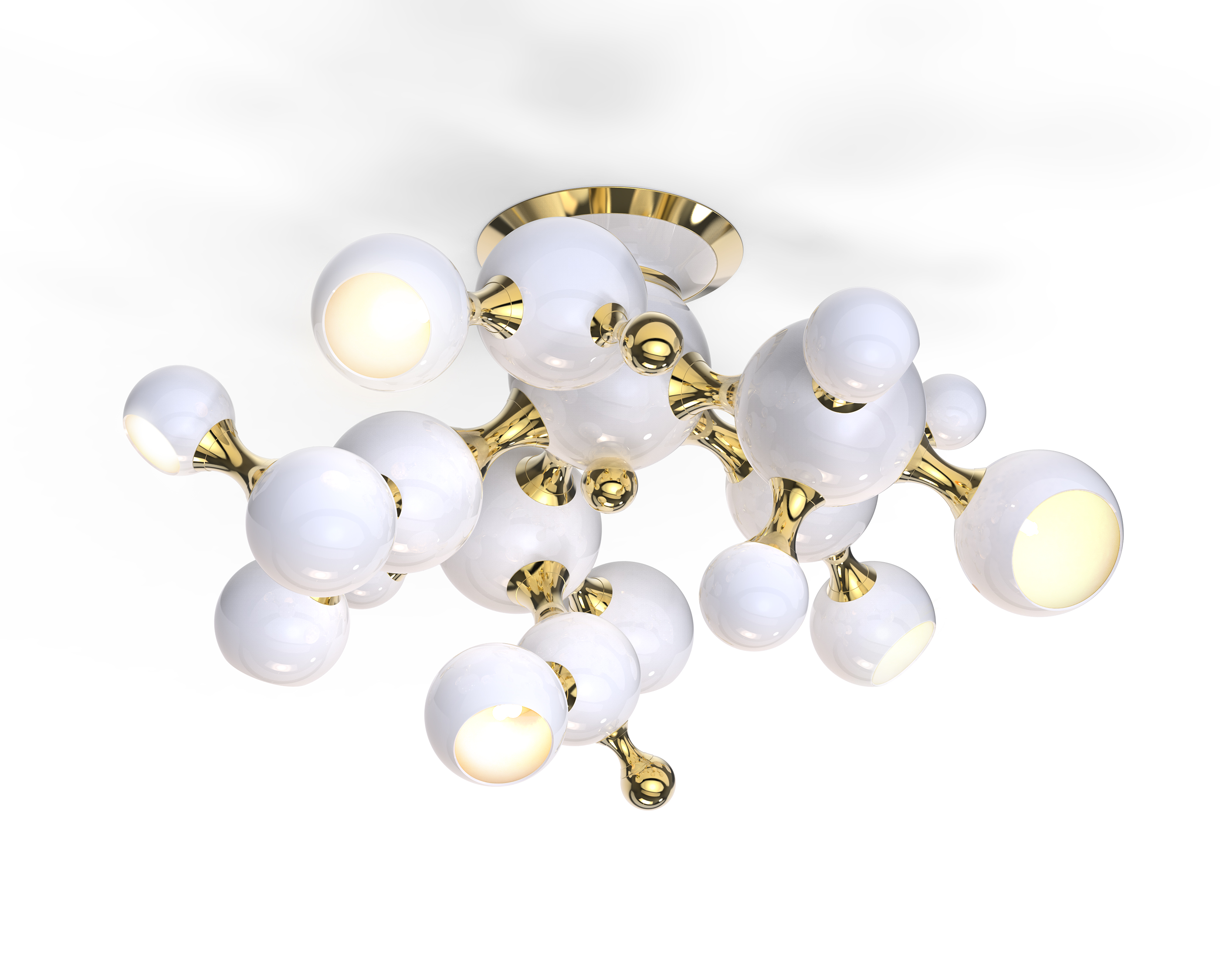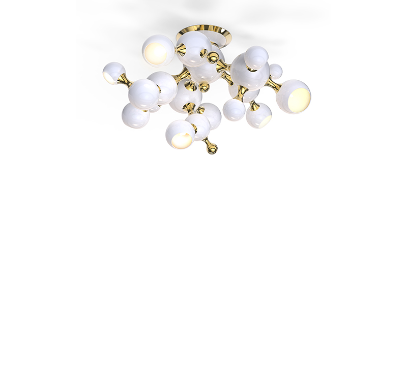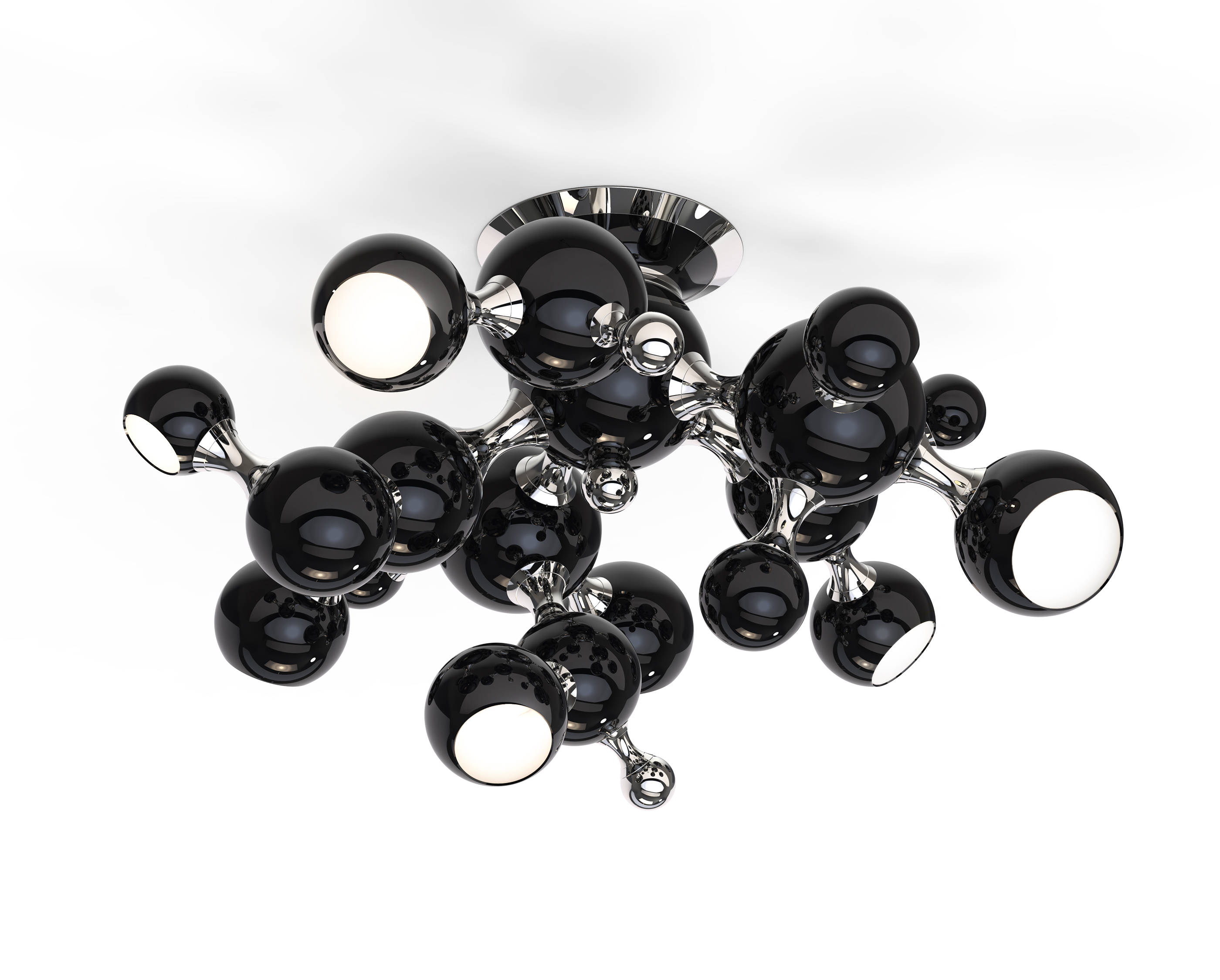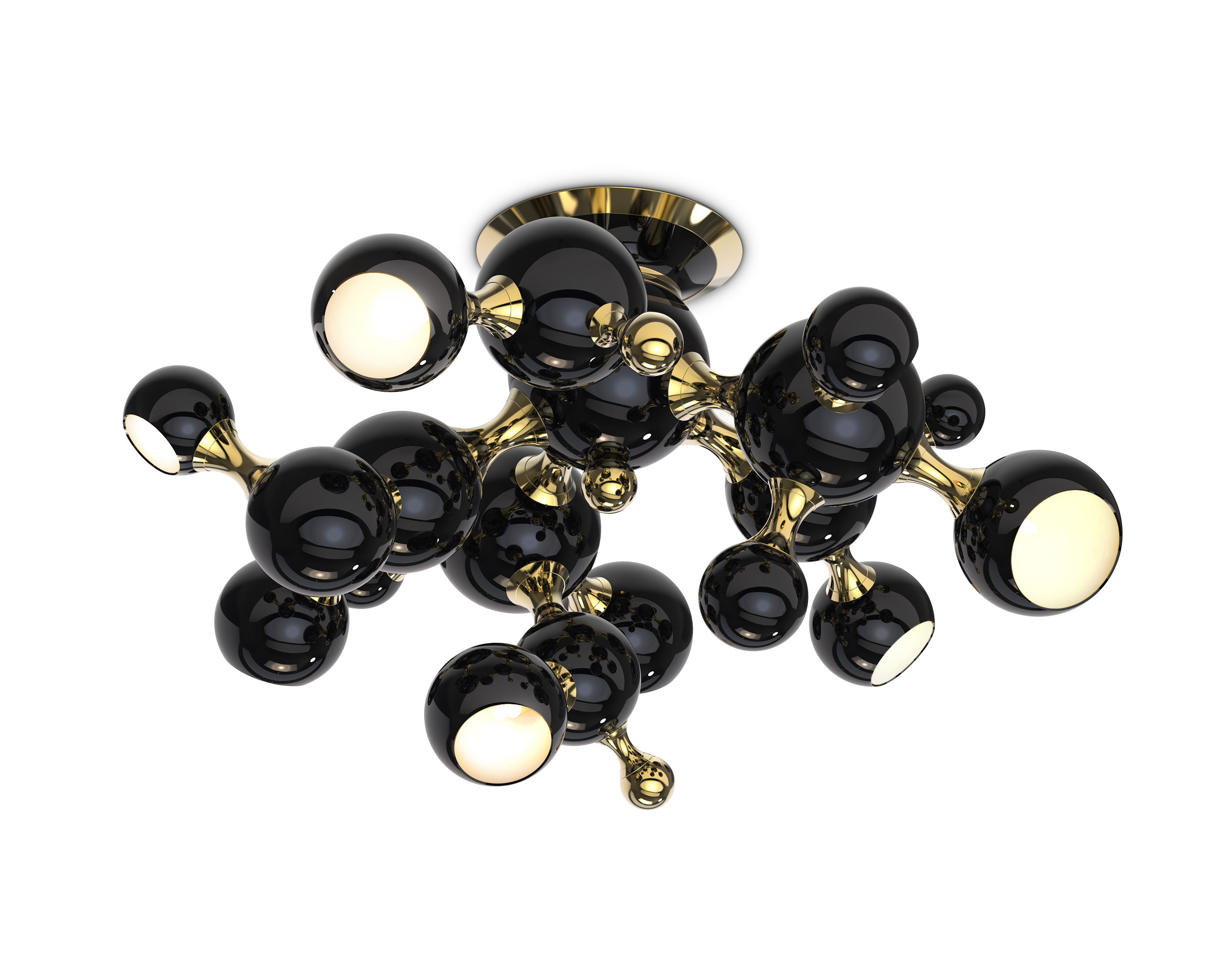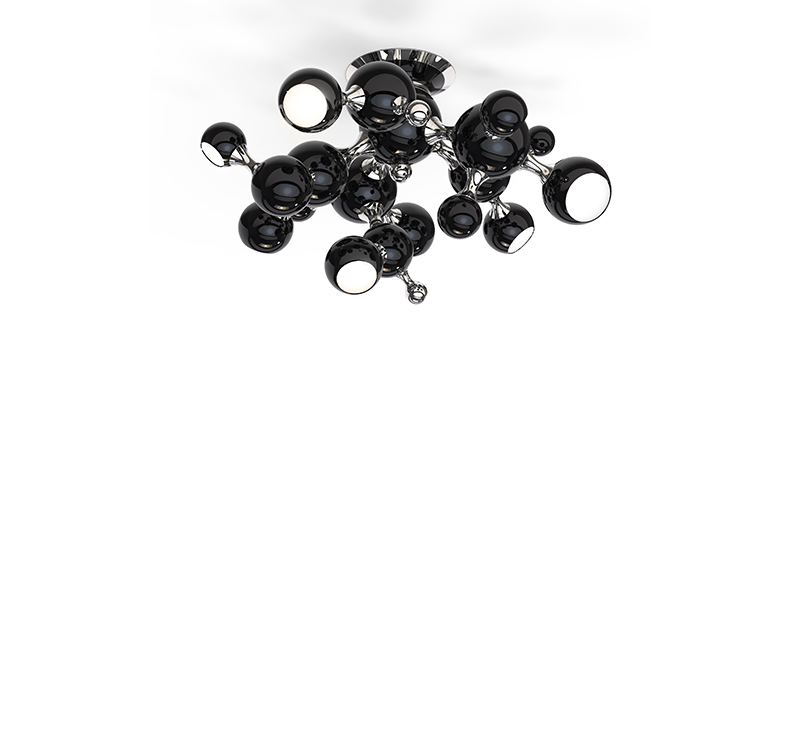 A contemporary descendant of retro sphere lighting, Atomic suspension lamp is a spot-on interpretation of the atomic age design. A set of glossy black and gold plated round shades, aligned by an asymmetric composition to enhance non-conventional molecular forms. As each shade evokes a petrifying effect, it’s ideal to be placed in a modern living room to surprise your guests, as well as in a modern lobby. A breathtaking design inspired in 50’s legacy.