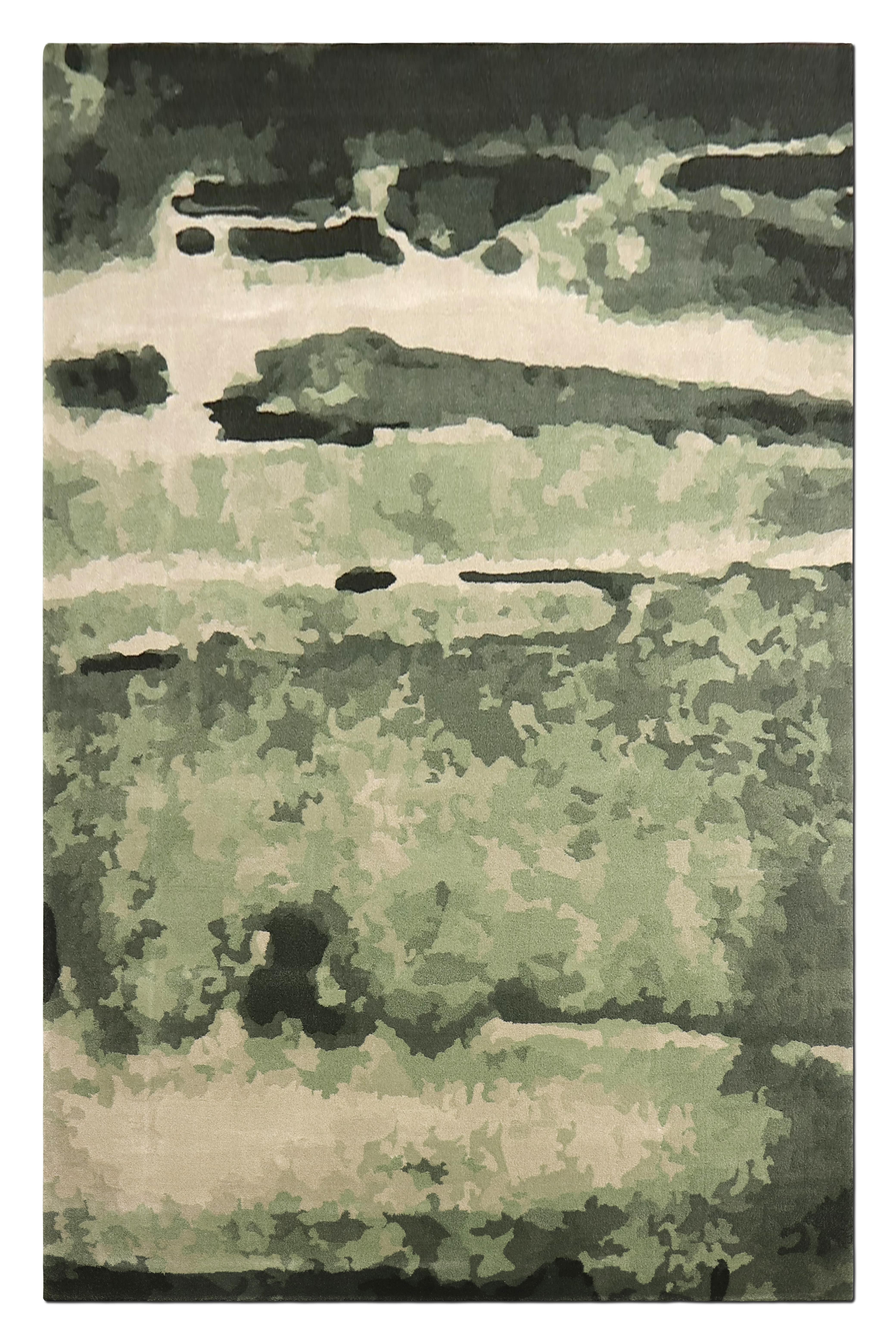 Möos is a vibrant, modern rug designed to create a serene and calming atmosphere, perfect for unwinding after a stressful day. Named after the German word for swamp or moss, its green tones symbolize balance and harmony. This exquisite rug is 100% handmade by skilled artisans using natural wool and botanical silk, combining craftsmanship with contemporary design.