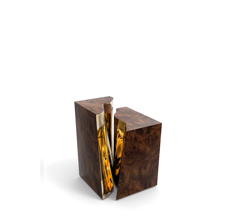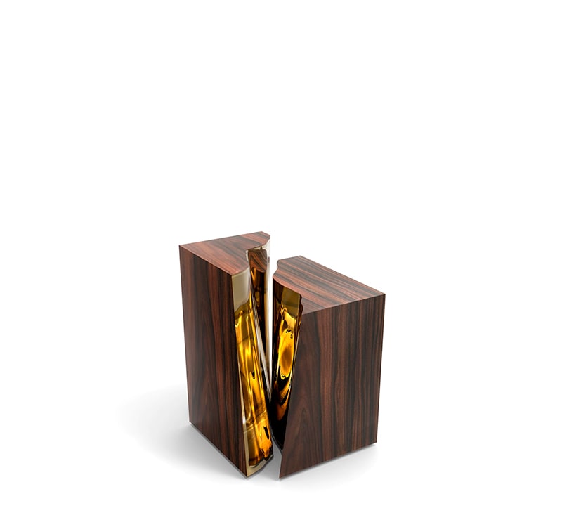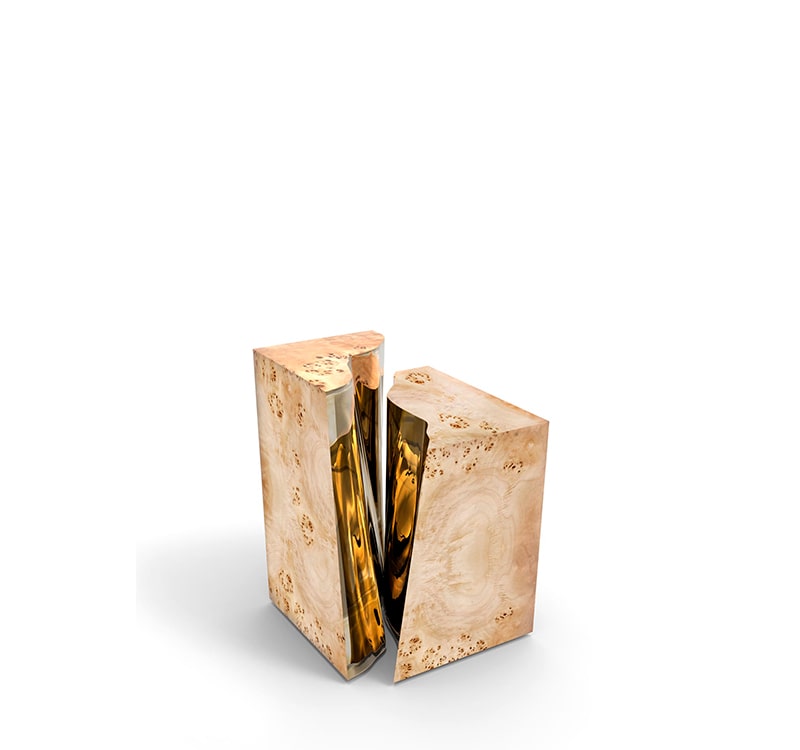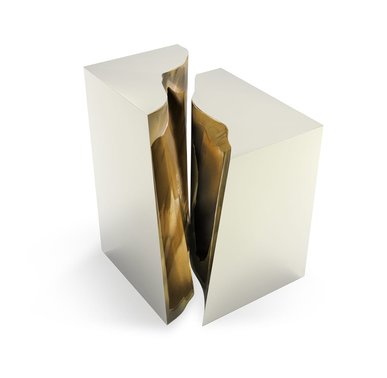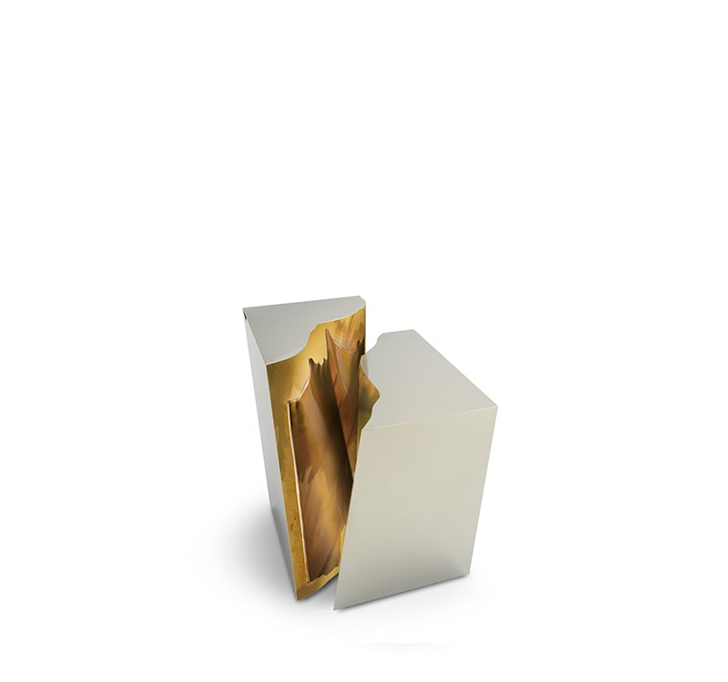 The Lapiaz side table is a true luxury furniture piece, one that is both elegant and beautiful. Lapiaz features a minimalistic geometric exterior surface, which by contrast is met with an organic and rich interior. Its reflective surface, made from clean-cut mirror and brass sheets guarantees an intoxicating attraction, which fills any bathroom interior design with energy.