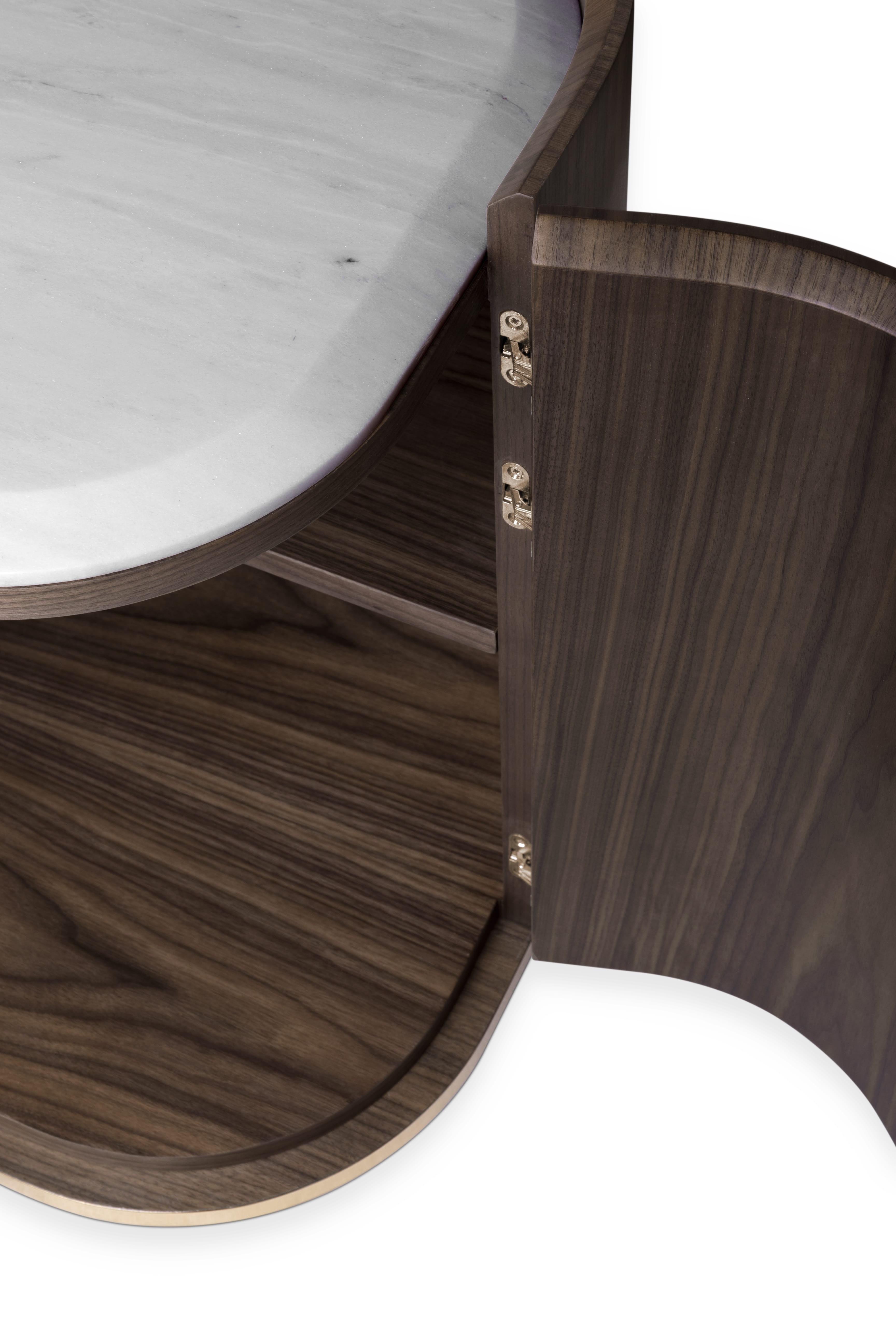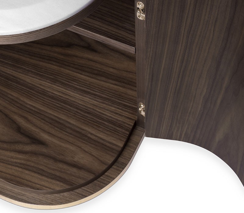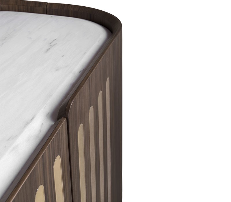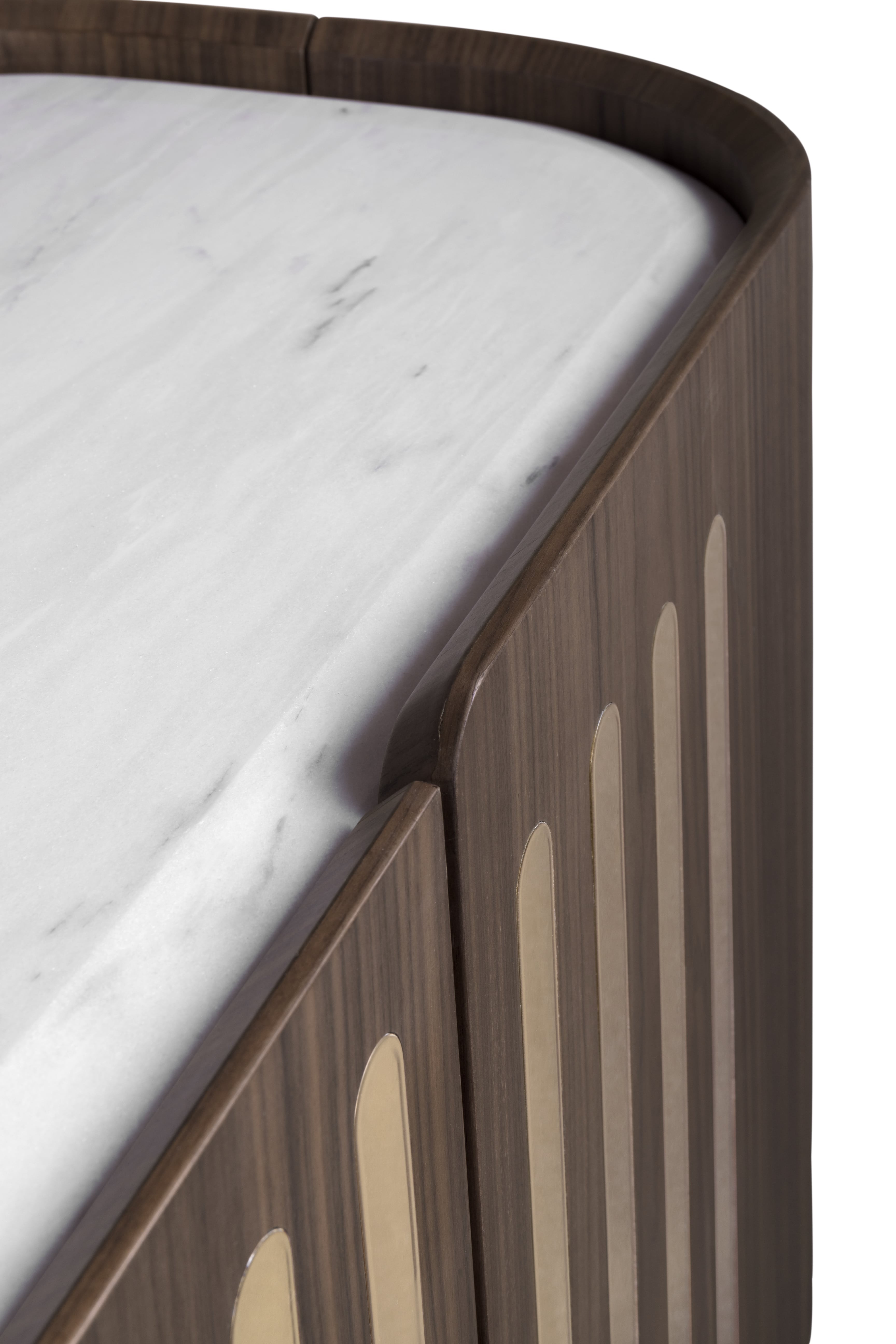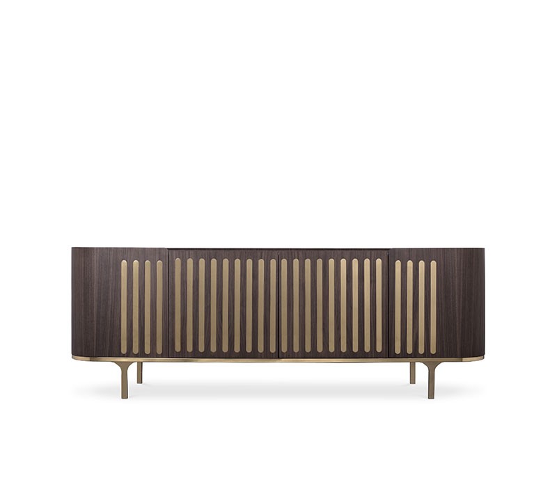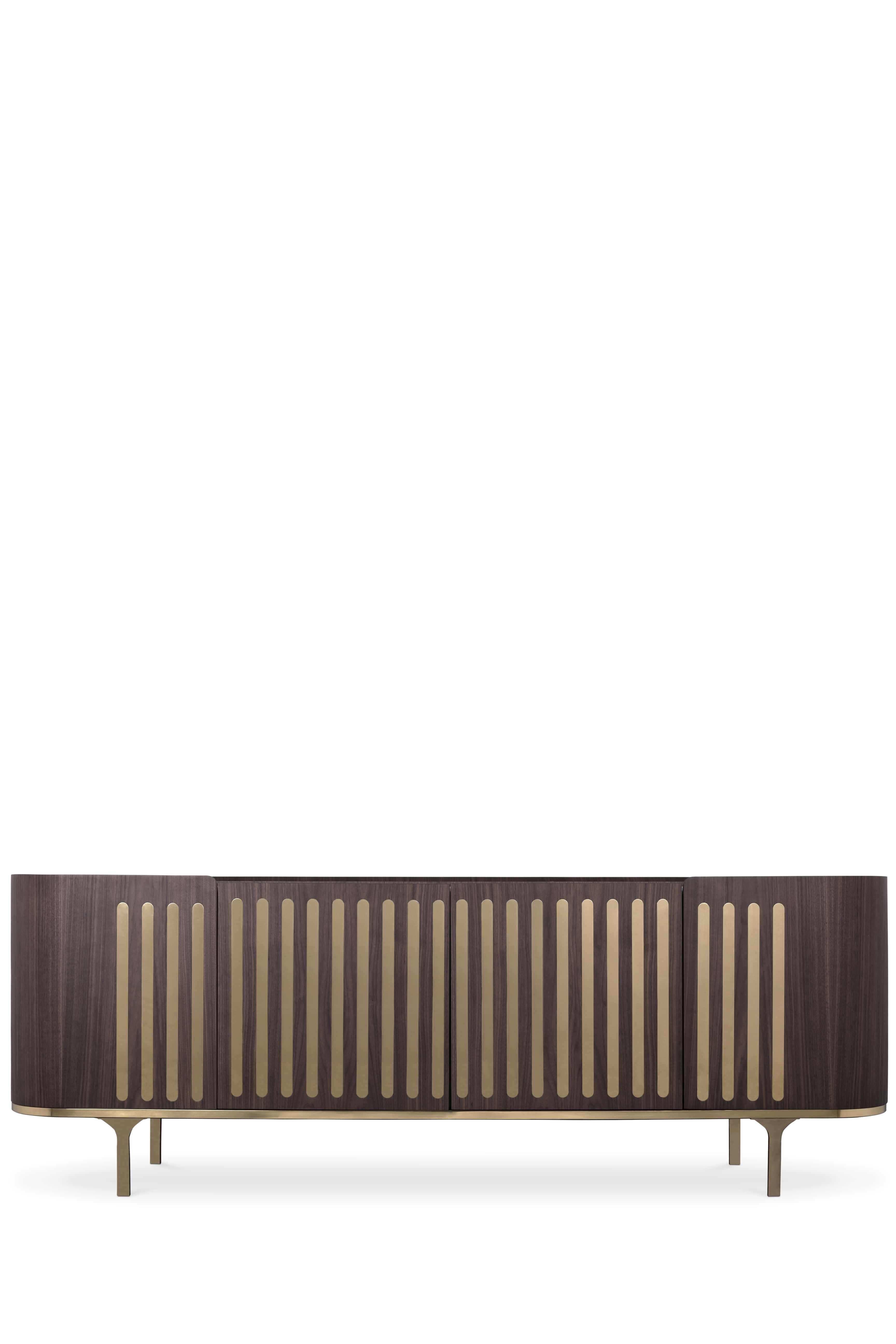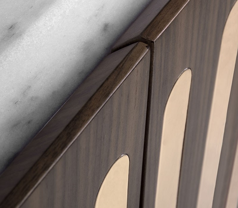 The Anthony Sideboard is perfectly stylish for any house design. Produced in solid walnut wood, topped by white polished marble and supported by brass square feet. This modern sideboard brings a playful geometric pattern on its doors, accented by the brass trim all over the body. It’s an inspiring sideboard that barely needs an introduction.