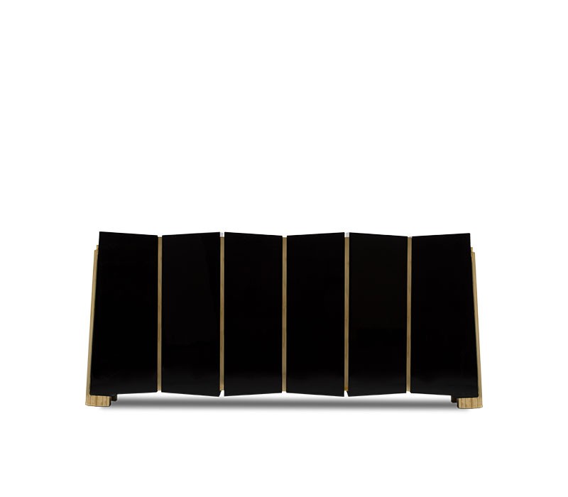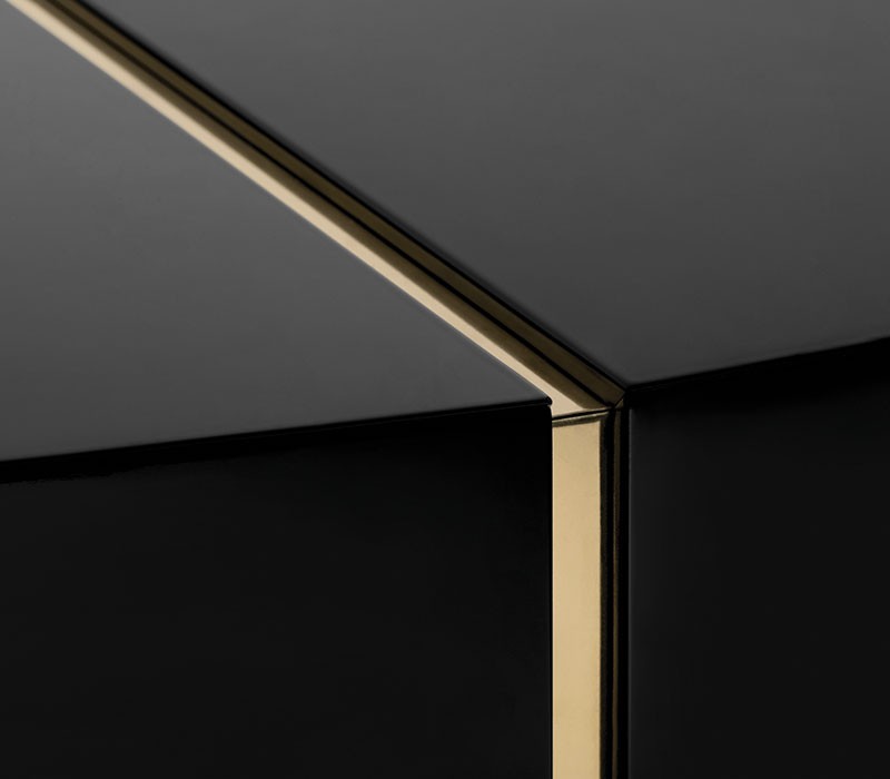 The Darian sideboard draws inspiration from the power of the shield and sphere of protection. A precise knowledge of production techniques and materials, each with different specialties, from metalwork to wood carving. It features a cluster of gold plated brass asymmetrical bars envelope a wood structure in black lacquer that results in a blend of artful and personality.
