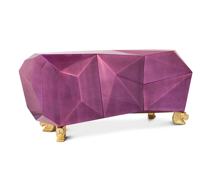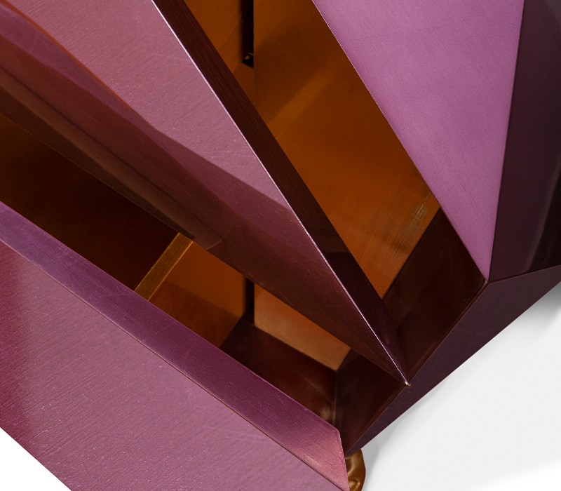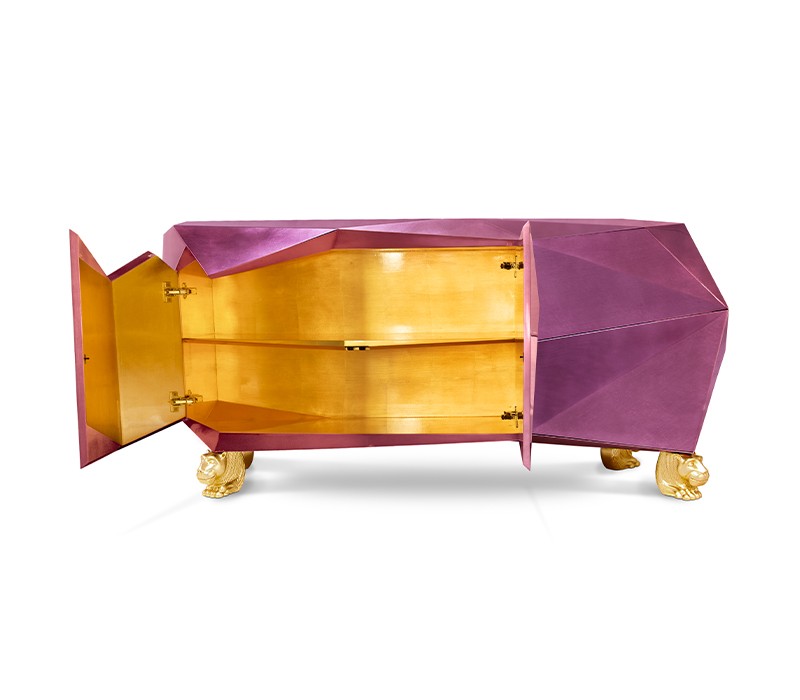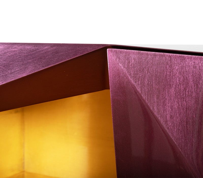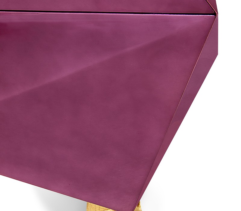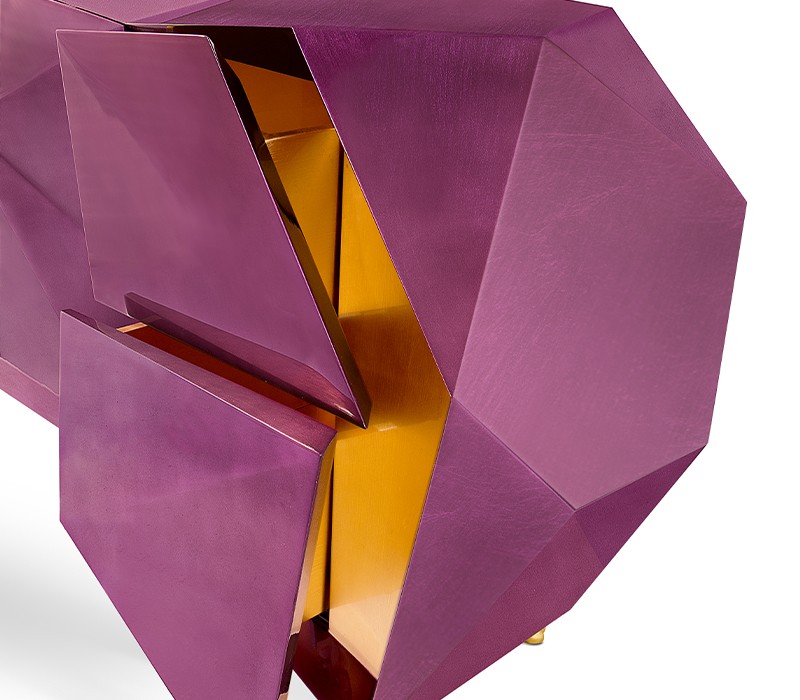 Time-honored masterpiece, the Diamond Sideboard is born as a precious jewel with cutting-edge lines to challenge the boundaries of form. This modern sideboard is sensuously sharp yet with alluring details of 19th century Romanticism that inspire and ignites excitement and wonder in the surroundings. Covered by gold leaf finished with a distinct translucent shade of amethyst and high gloss varnish on top. Layer by layer, leaf gilding is one of the techniques of the most treasurable and richest craft. An unexpected way to give a timeless touch and carry the legacy of those who built it.