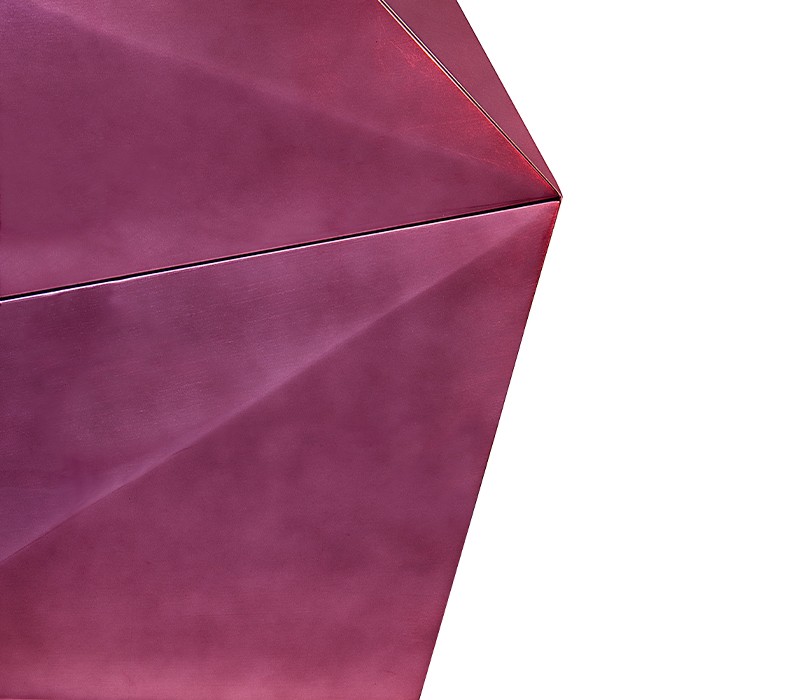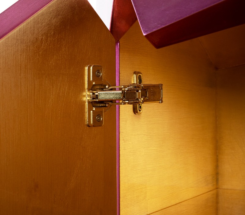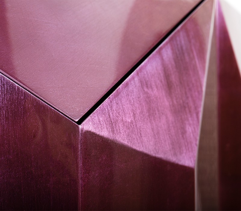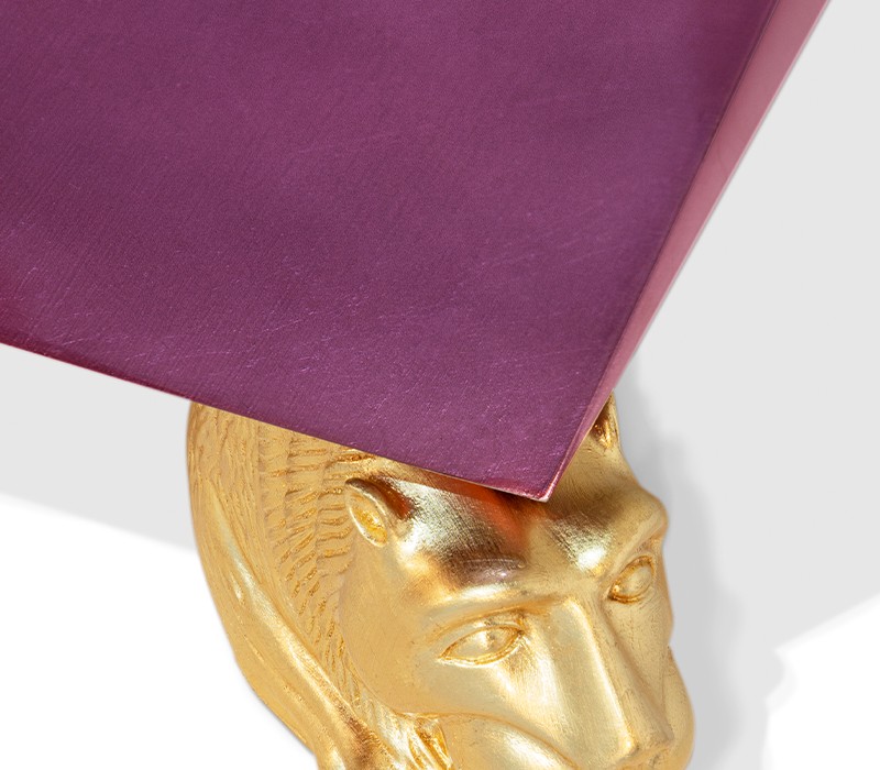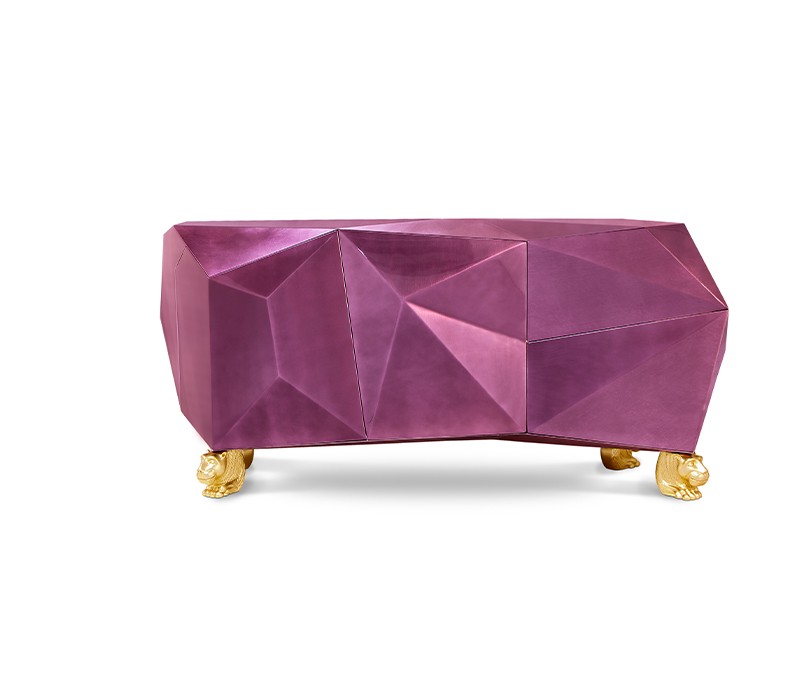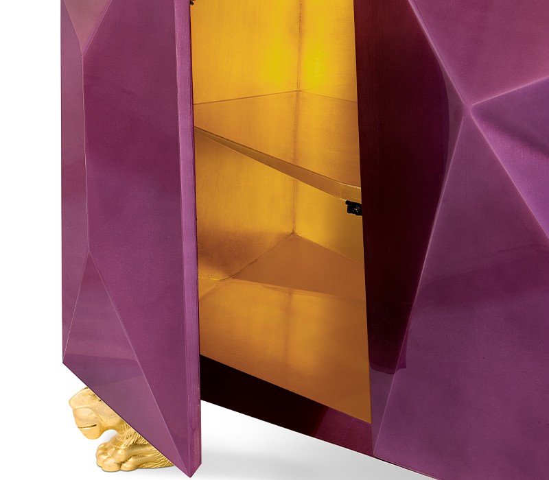 Time-honored masterpiece, the Diamond Sideboard is born as a precious jewel with cutting-edge lines to challenge the boundaries of form. This modern sideboard is sensuously sharp yet with alluring details of 19th century Romanticism that inspire and ignites excitement and wonder in the surroundings. Covered by gold leaf finished with a distinct translucent shade of amethyst and high gloss varnish on top. Layer by layer, leaf gilding is one of the techniques of the most treasurable and richest craft. An unexpected way to give a timeless touch and carry the legacy of those who built it.