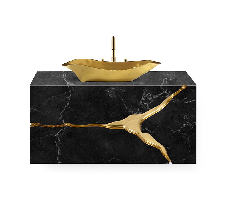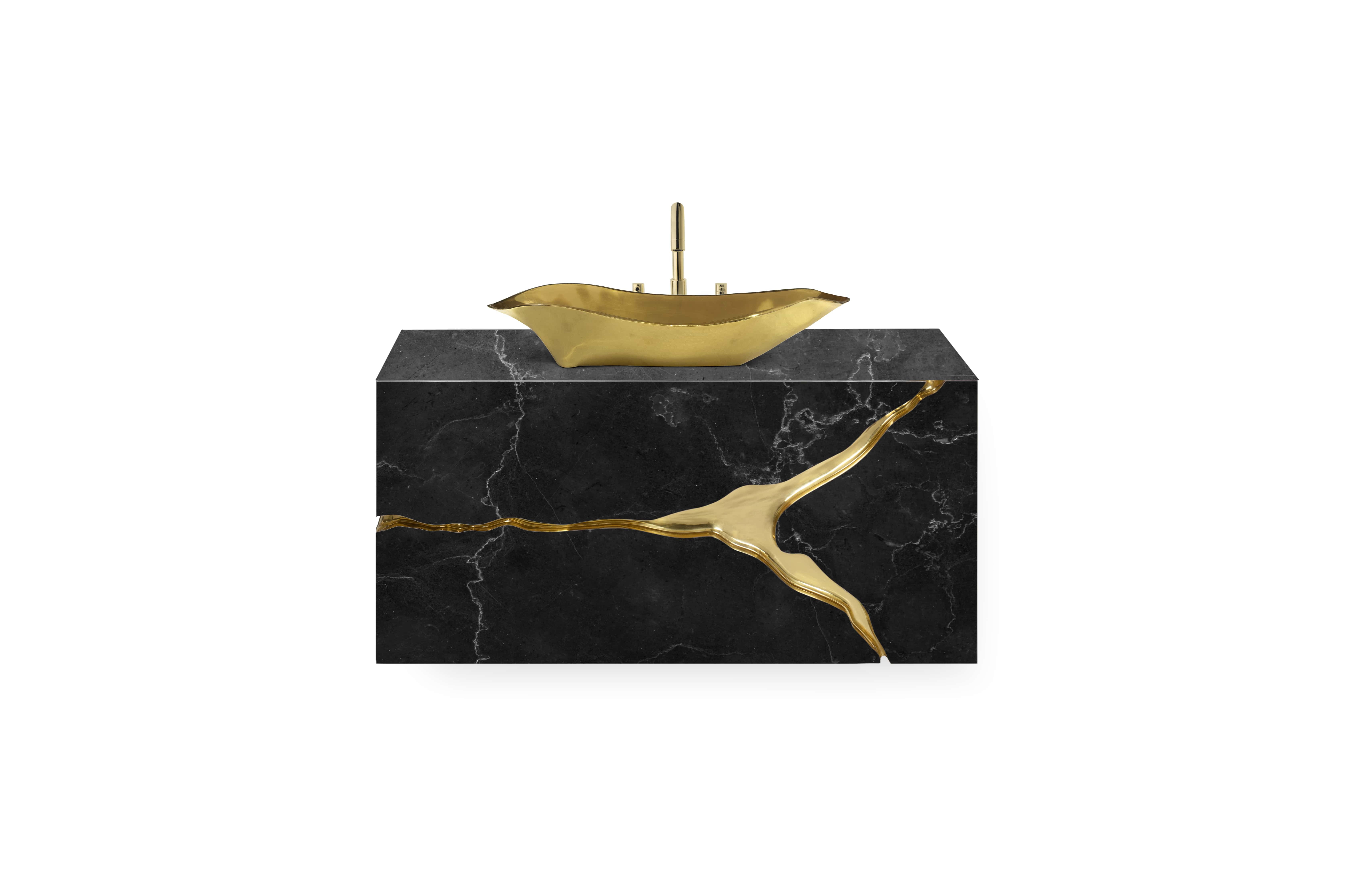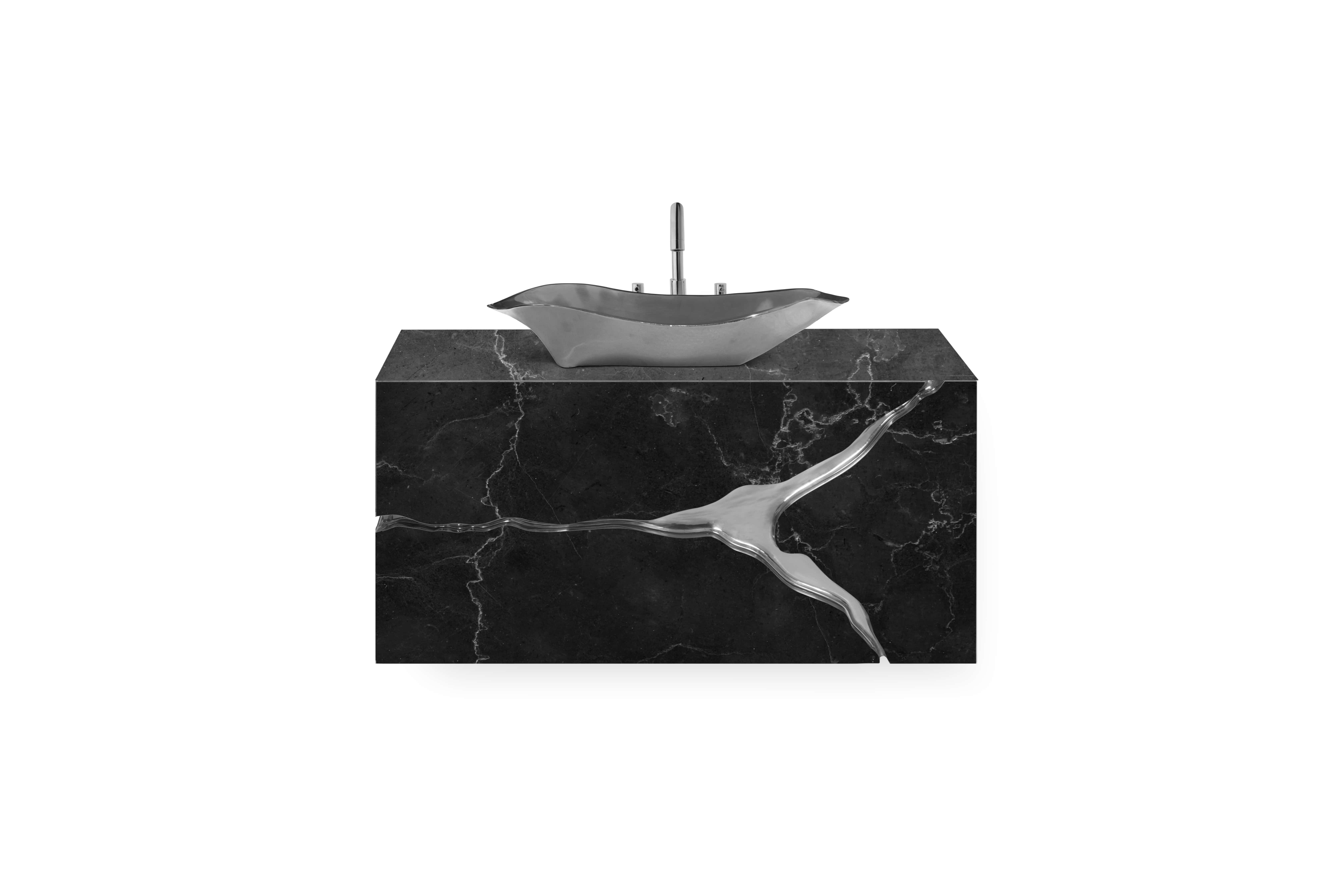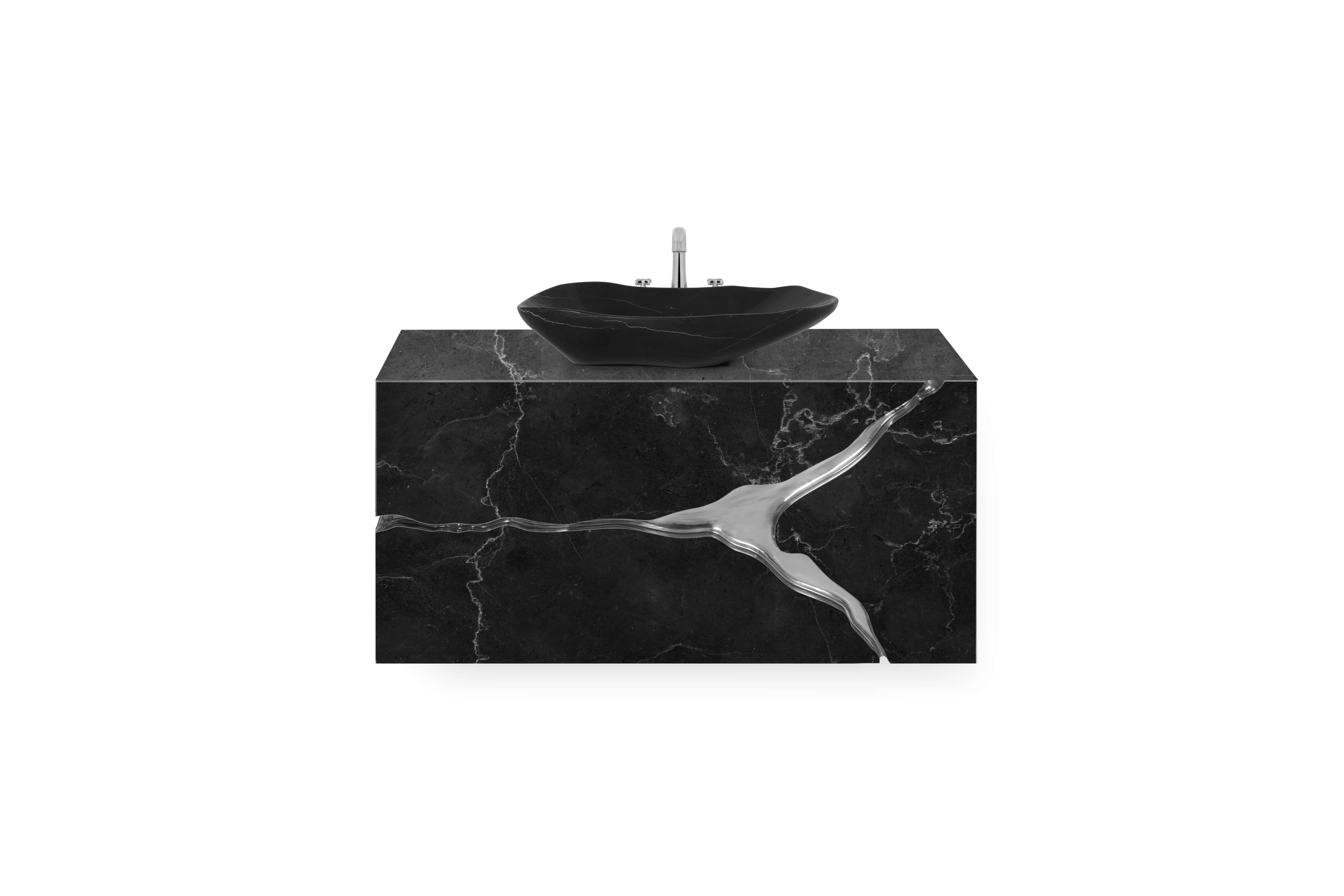 Inspired by the natural beauty of karst formations created by the dissolution of limestone, the Lapiaz Marble Suspension Cabinet is a striking statement piece that elevates any bathroom interior with timeless elegance. Its polished brass tear accentuates the luxurious marble surface, while a set of three drawers finished in poplar root veneer adds a distinctive and unique touch to its design.
