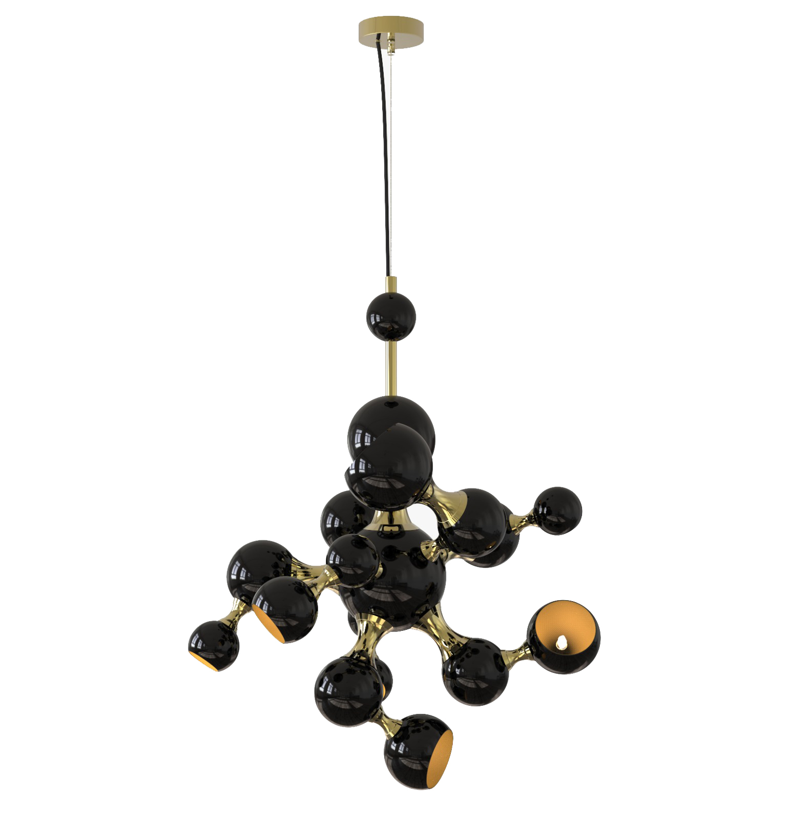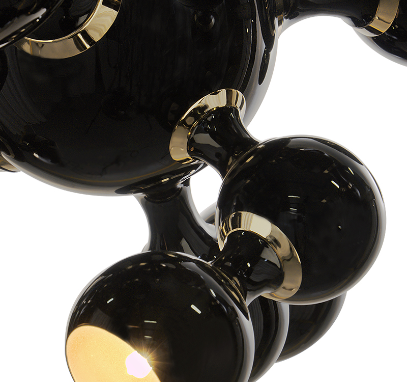 Atomic light pendant by DelightFULL is a modern design interpretation of the atomic age, inspired by the composition of the atom. Building this unique lighting design using materials such as brass, steel and aluminum, DelightFULL’s skilled artisans arranged it in an abstract composition, very similar to the non-conventional molecular forms. Both a glossy black and a gold-plated finish were used for the body, while glossy black and gold powder paint were the chosen finish of the shades.