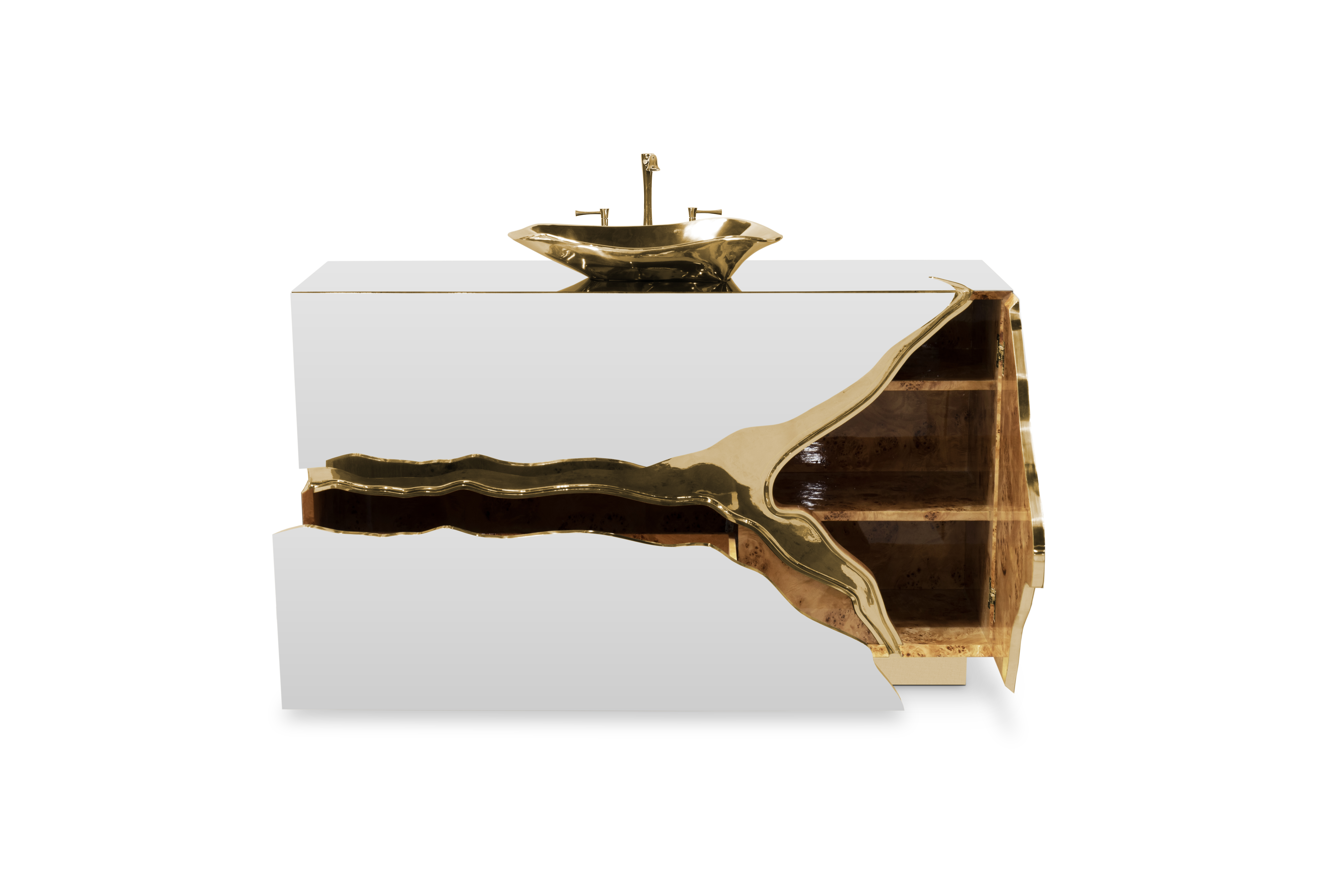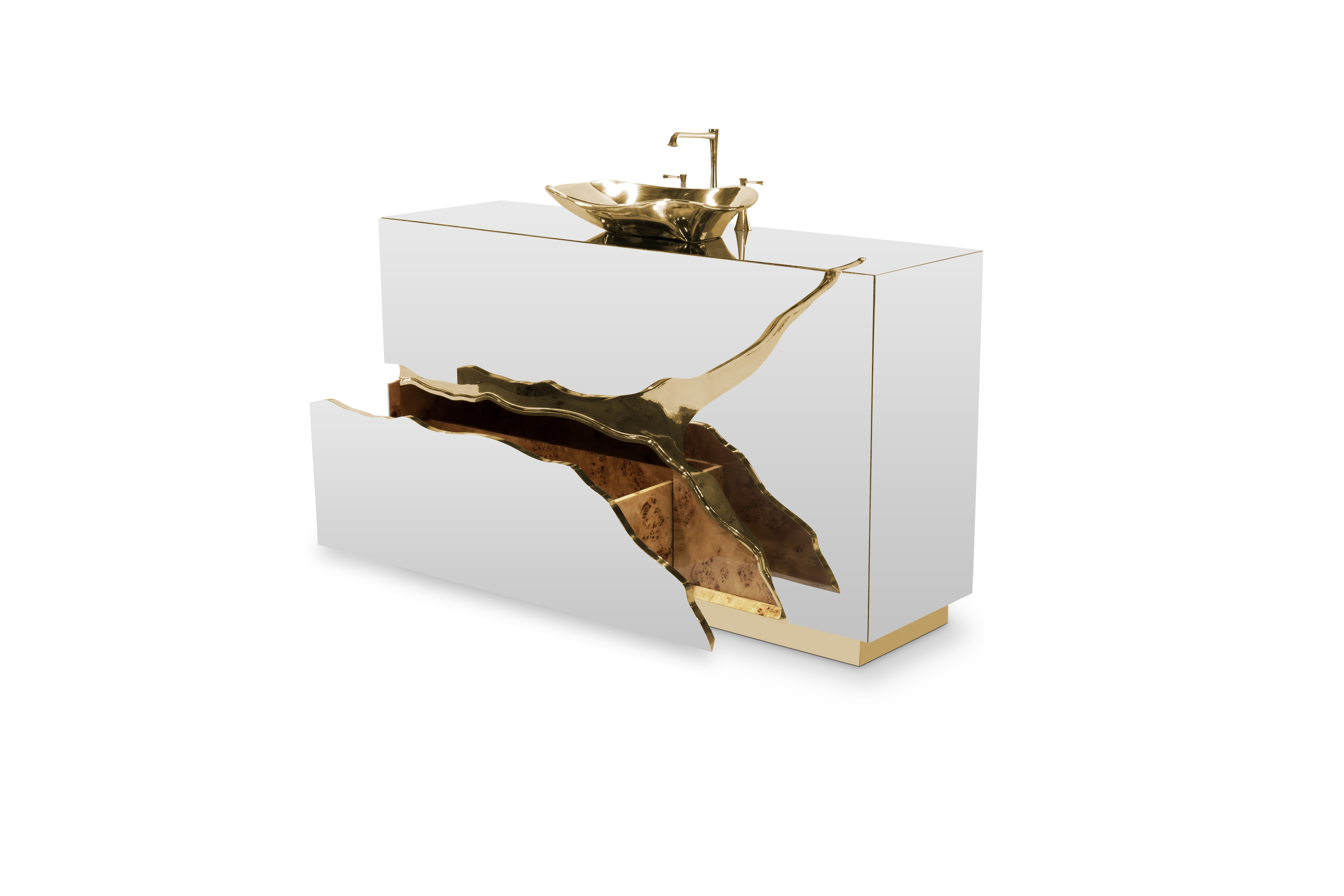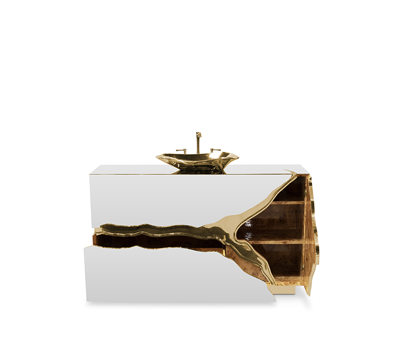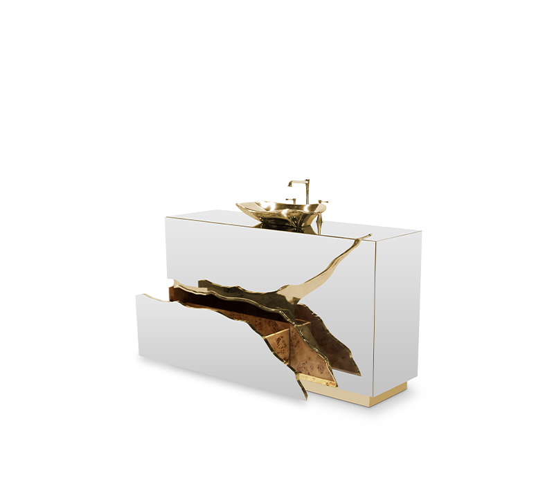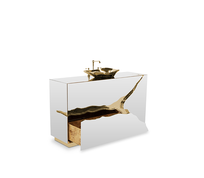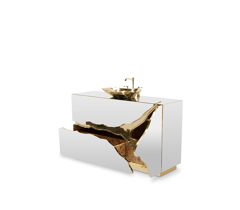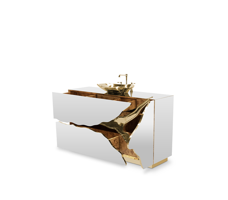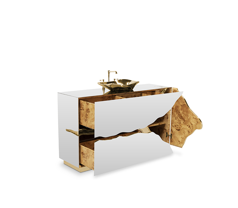 Lapiaz was inspired by the typical karst formations produced by the dissolution of limestone rocks. With a polished brass tear enhanced by its rich aesthetic as well as a set of one door and two drawers finished in poplar root veneer, this Lapiaz Single Vanity Cabinet is such a statement that stands out in your bathroom interior design.
