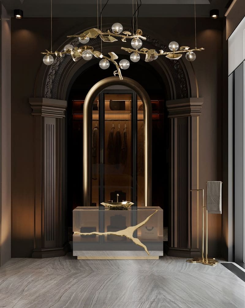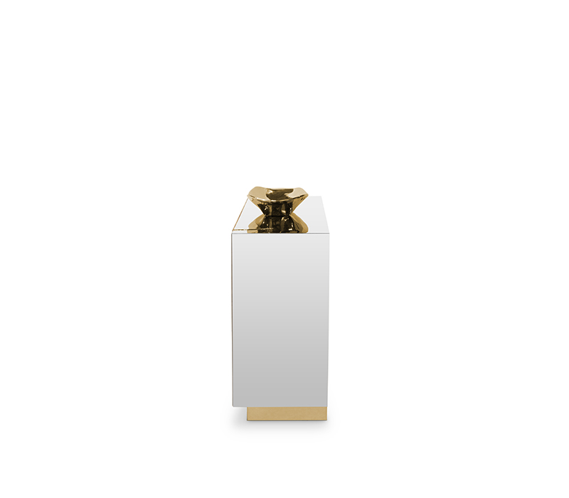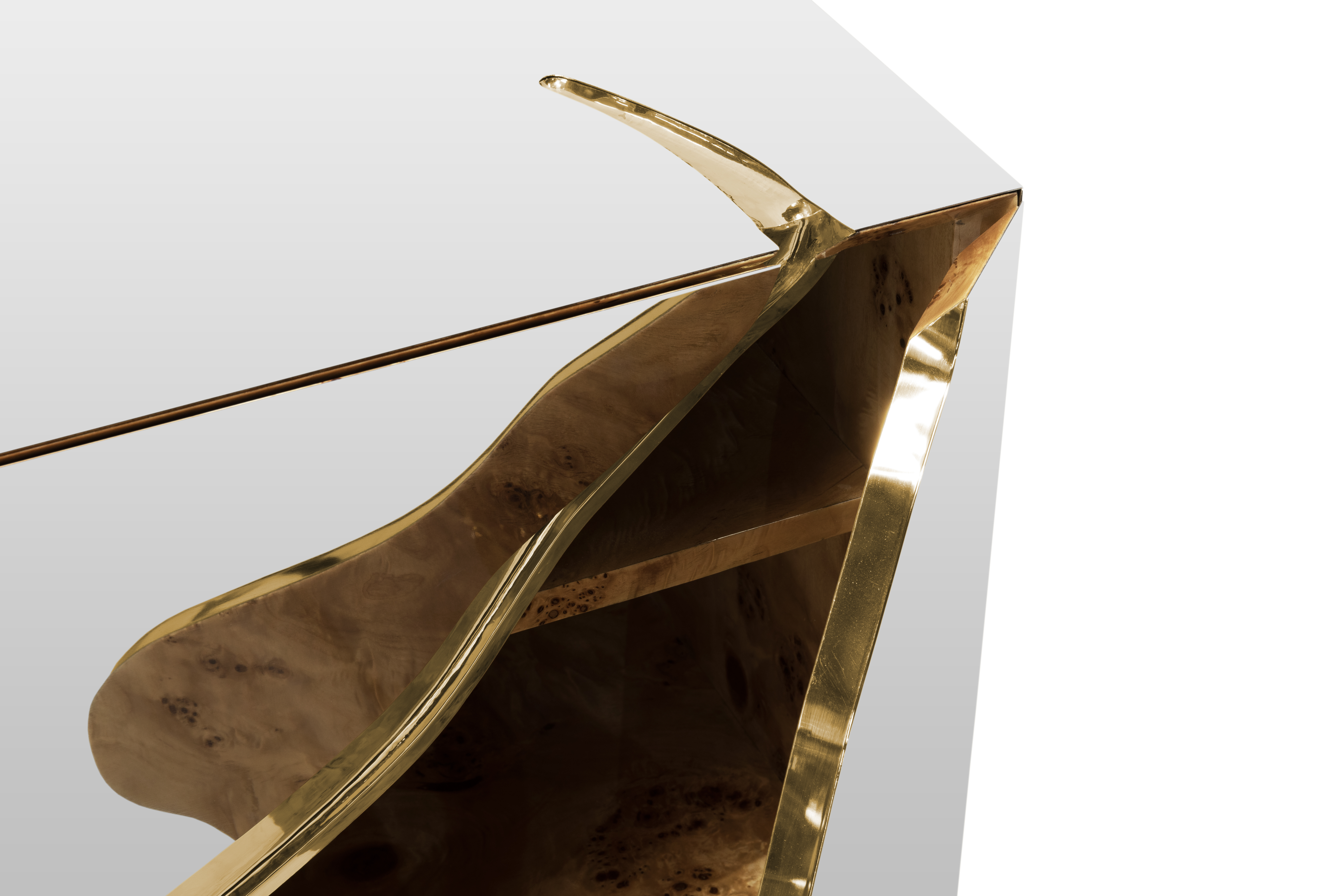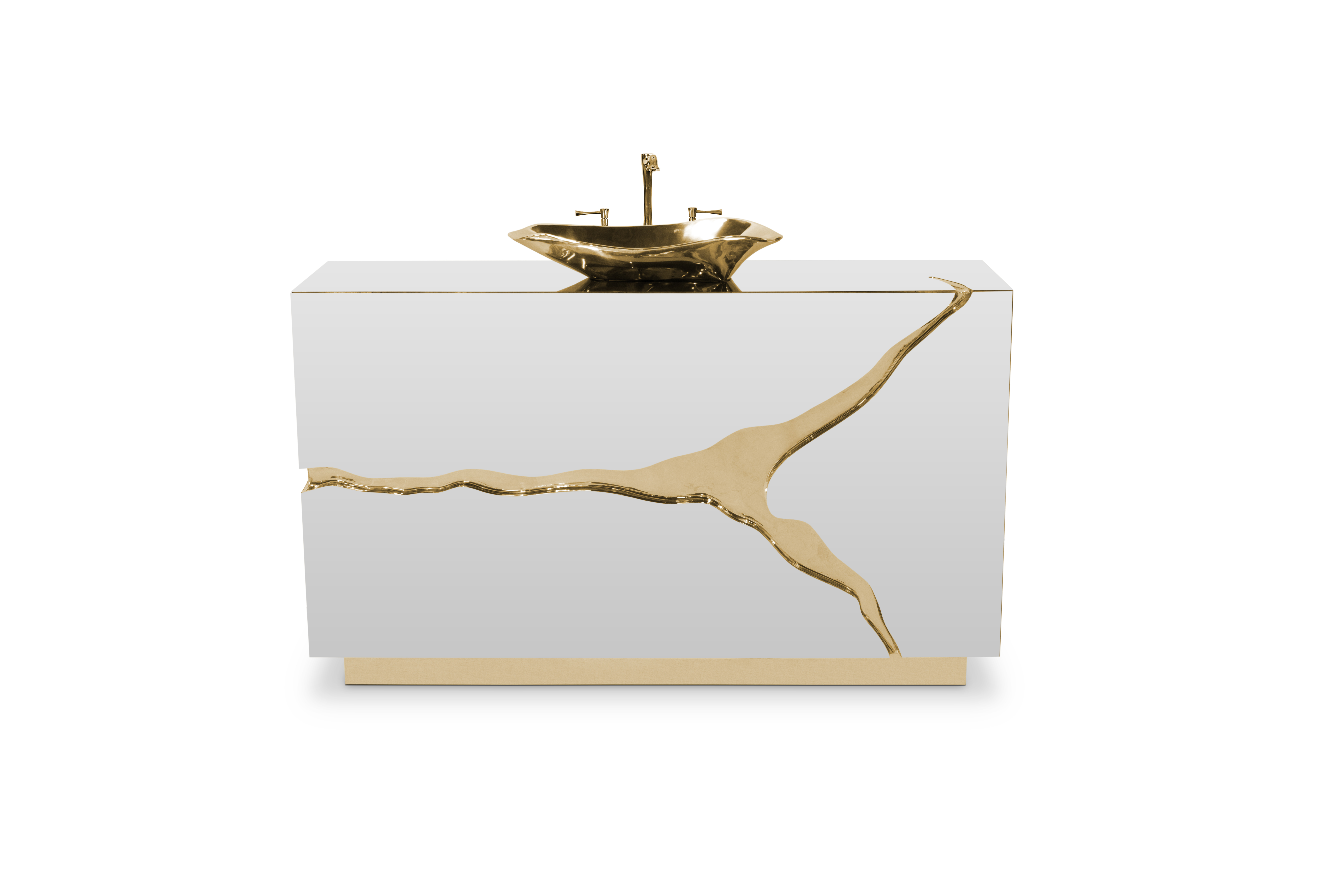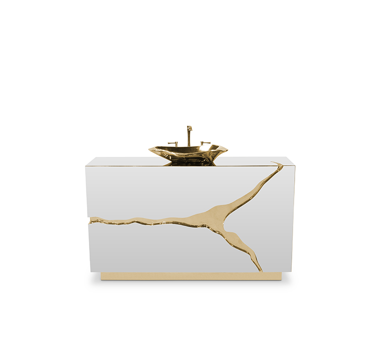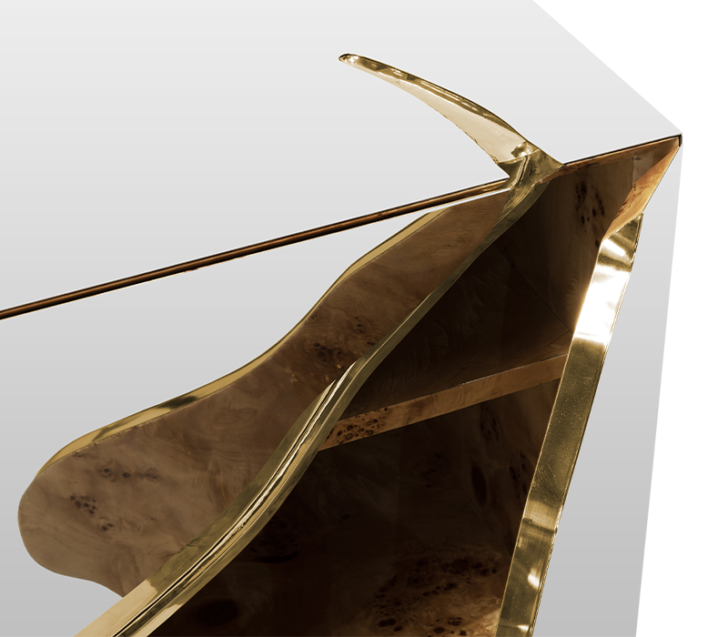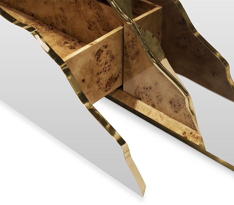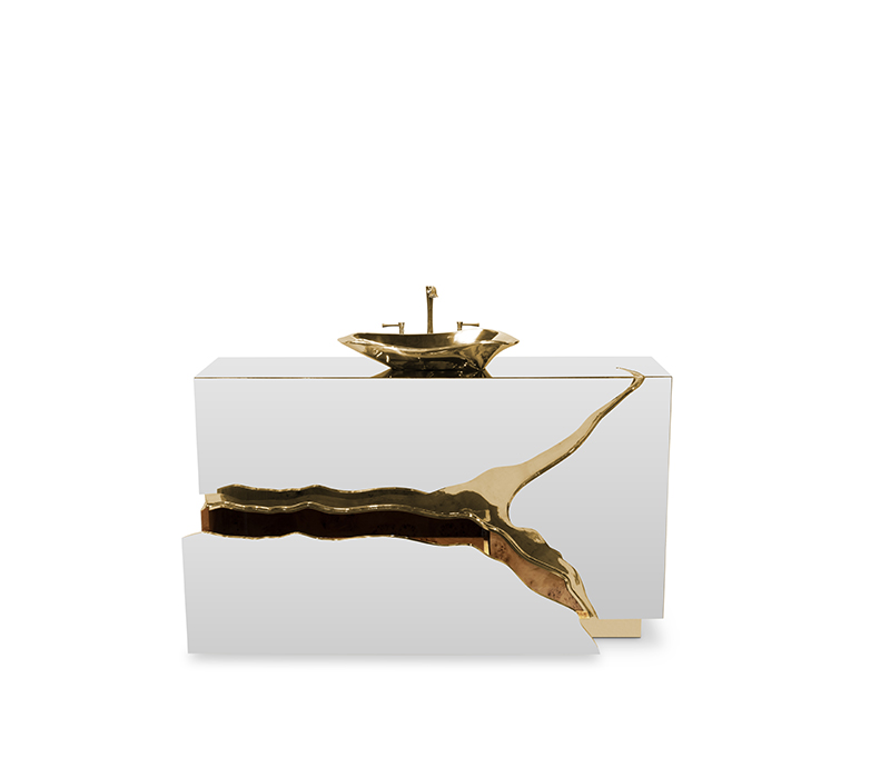 Lapiaz was inspired by the typical karst formations produced by the dissolution of limestone rocks. With a polished brass tear enhanced by its rich aesthetic as well as a set of one door and two drawers finished in poplar root veneer, this Lapiaz Single Vanity Cabinet is such a statement that stands out in your bathroom interior design.