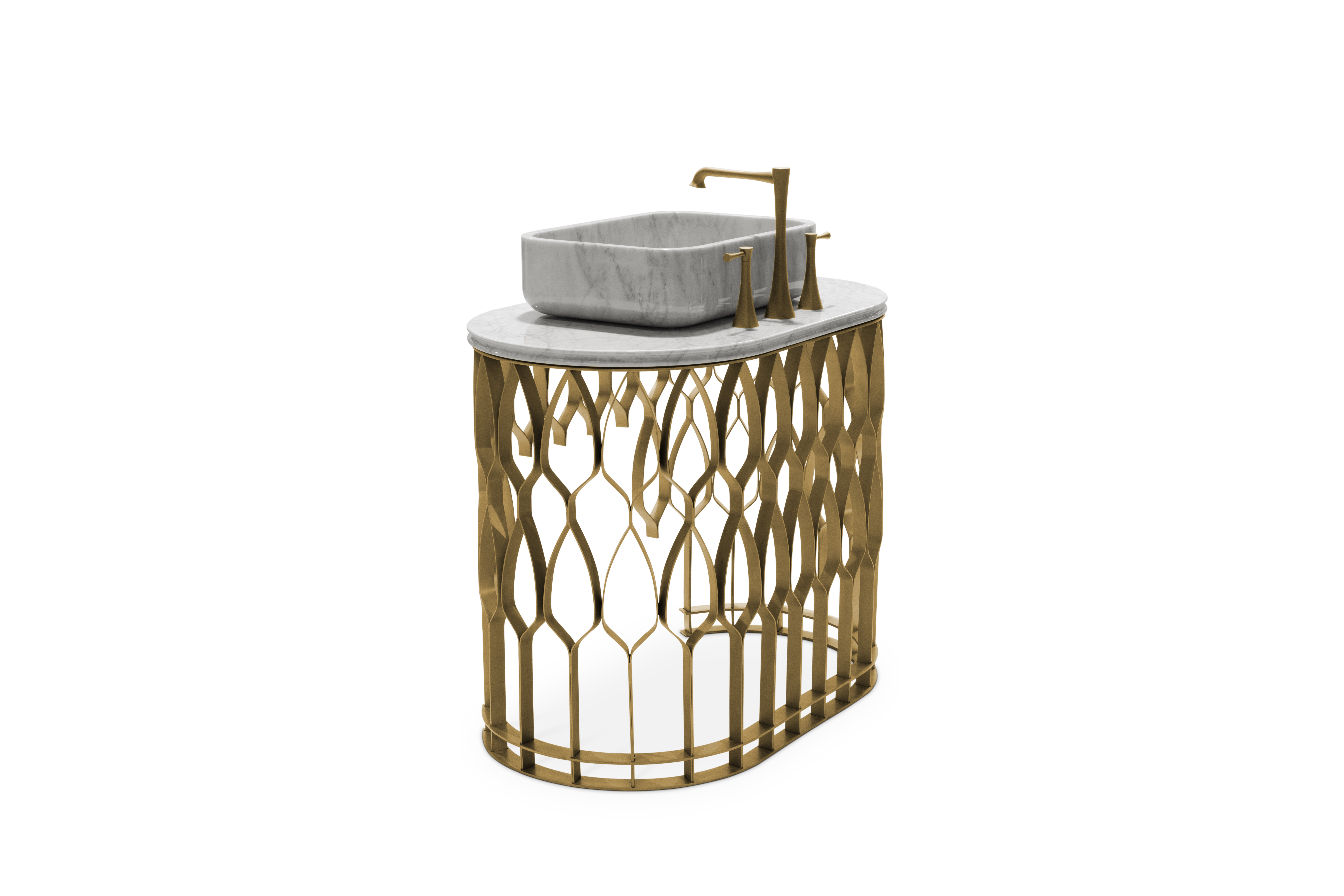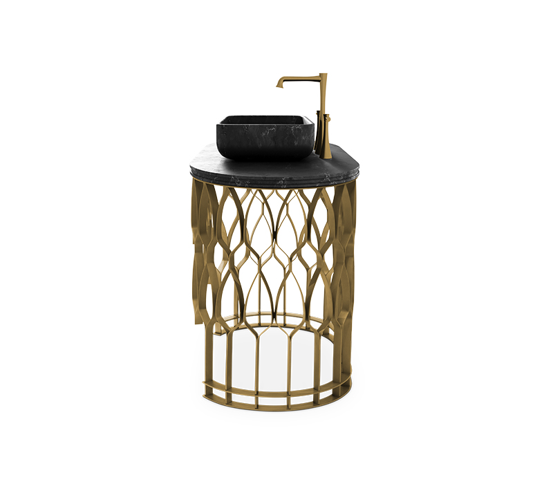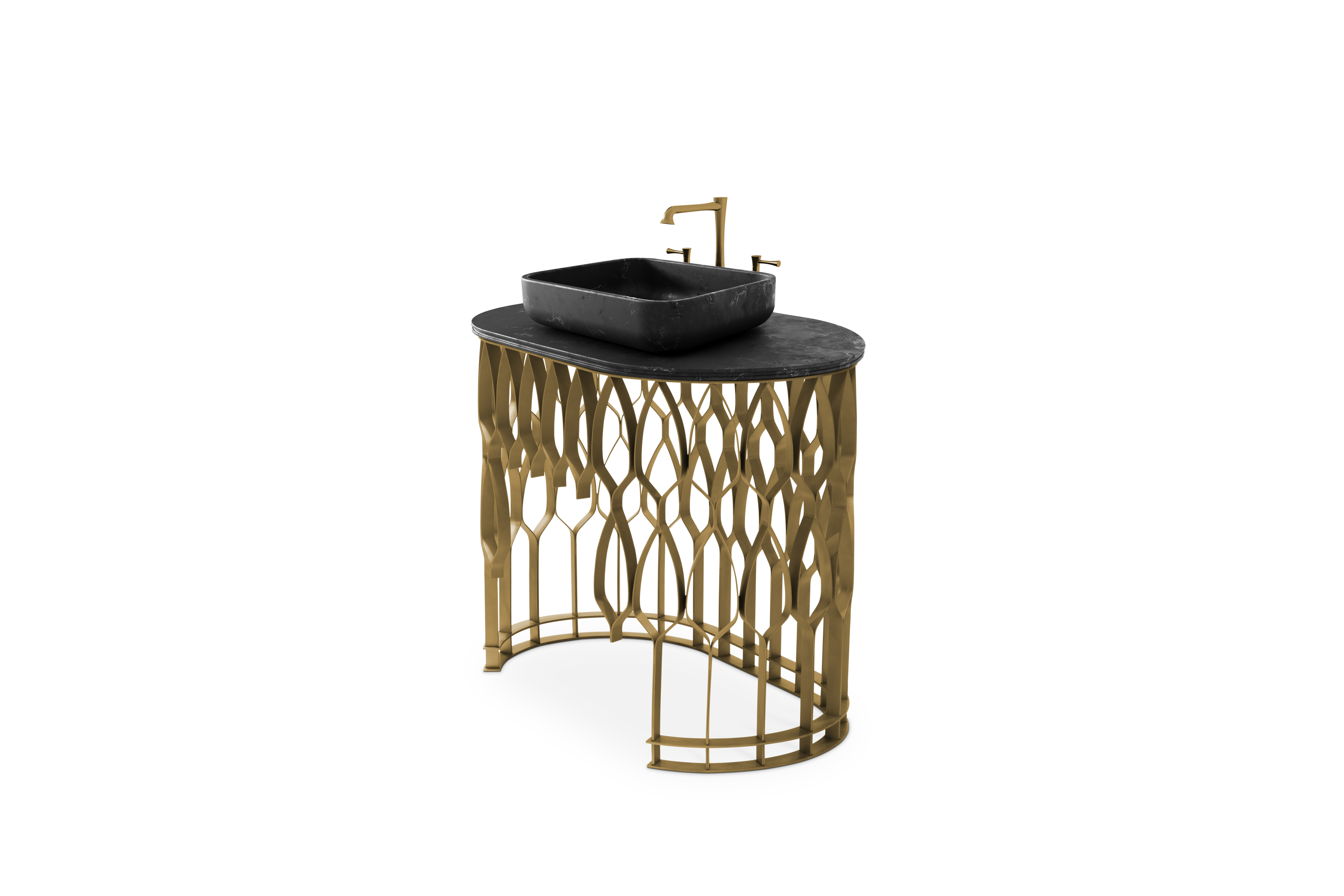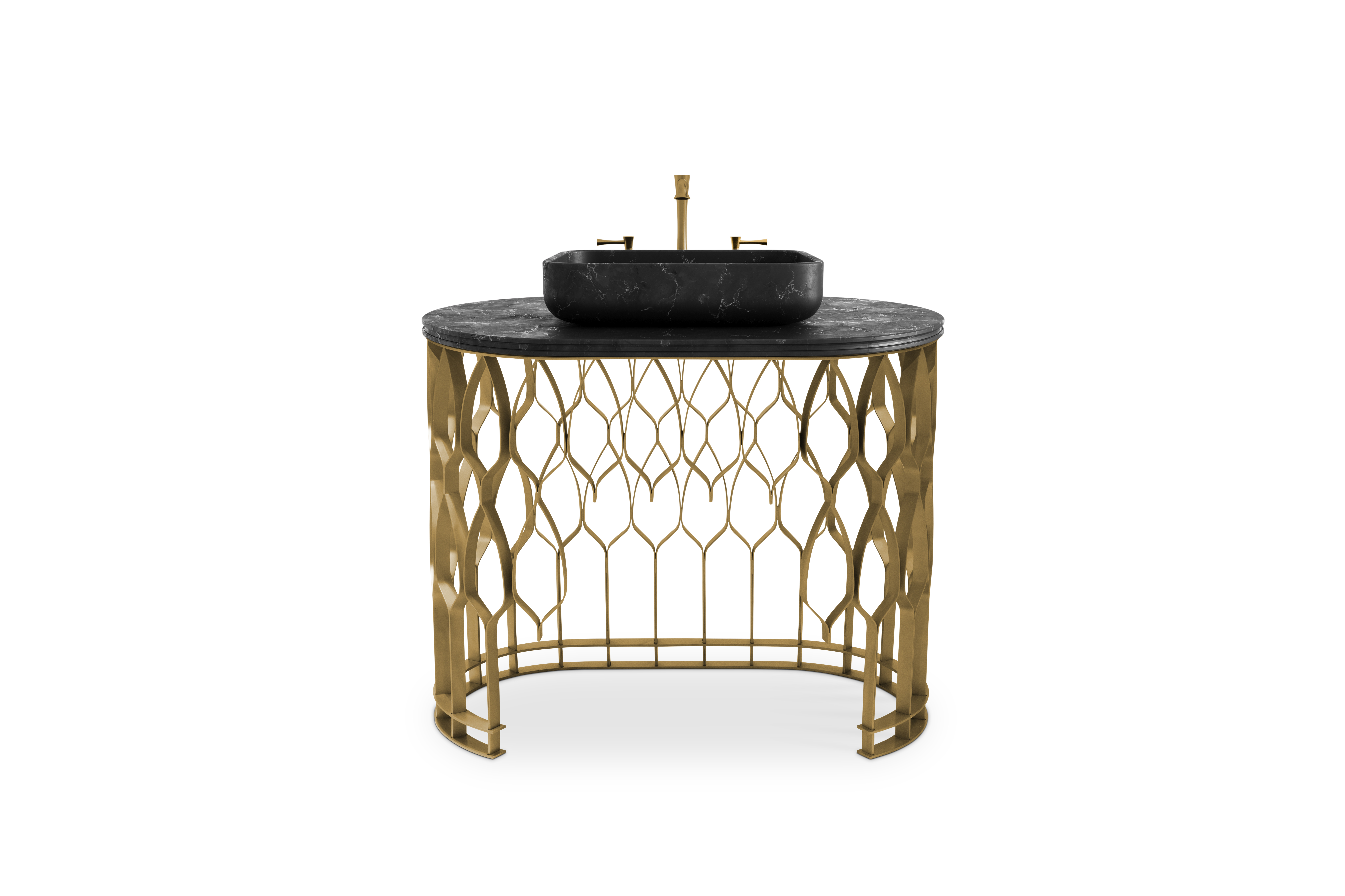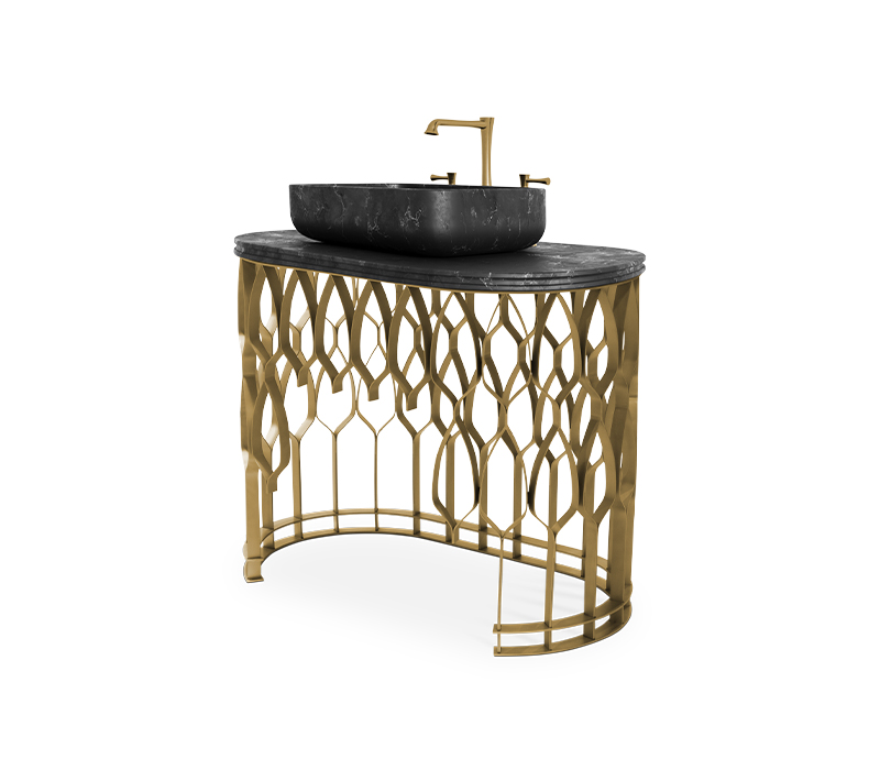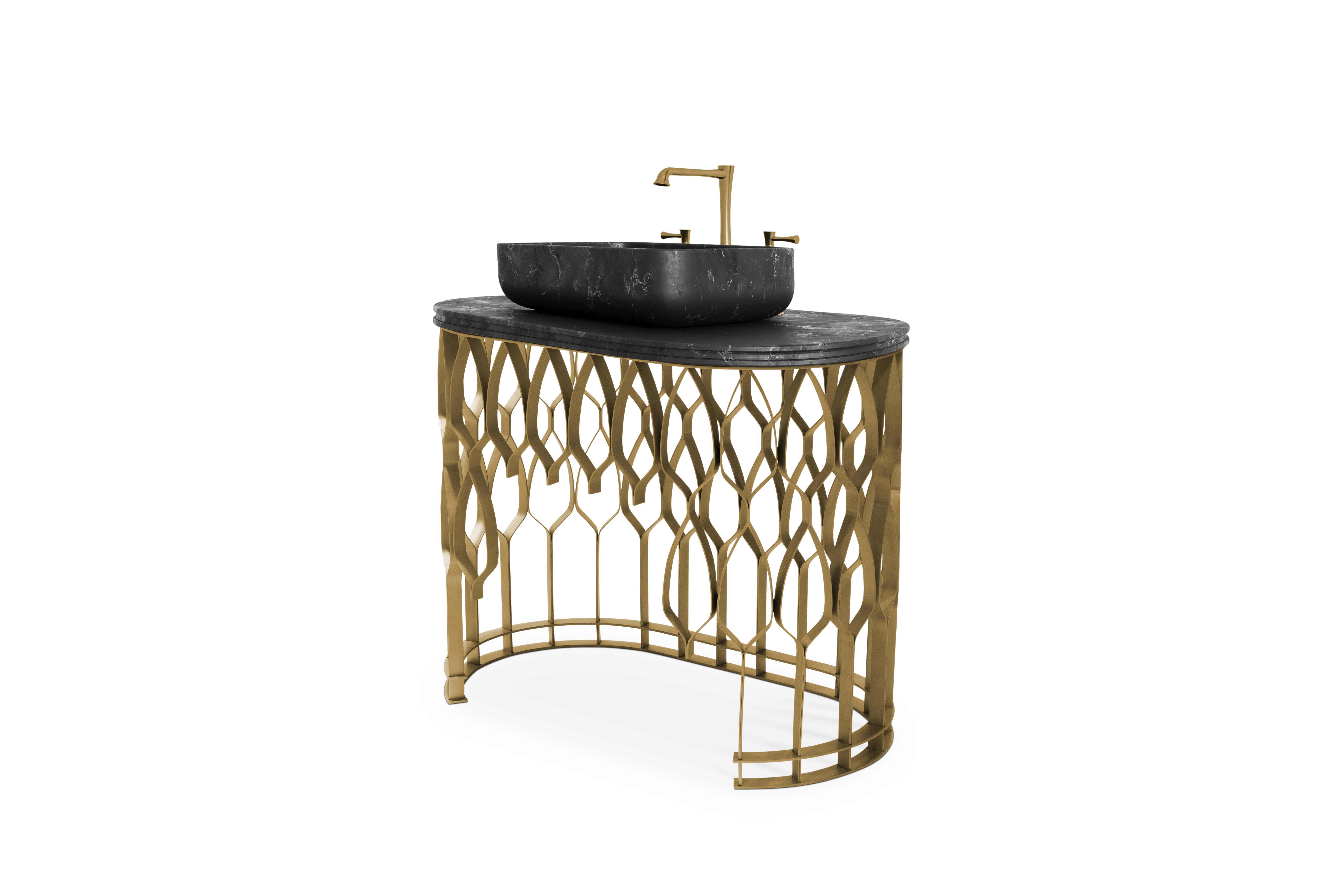 Beyond mere places of worship, mosques stand as magnificent feats of architecture. Drawing inspiration from their splendor, the Mecca Vanity Cabinet is a testament to this grandeur. With meticulous craftsmanship, it features brushed brass matte columns reminiscent of mosque architecture. The marriage of this intricate gold framework with the opulent Nero Marquina marble top and sink forms a stunning visual harmony, blending tradition with modern style. More than just a piece of furniture, the Mecca Vanity Cabinet embodies refined elegance, elevating any space into a luxurious sanctuary of luxury.