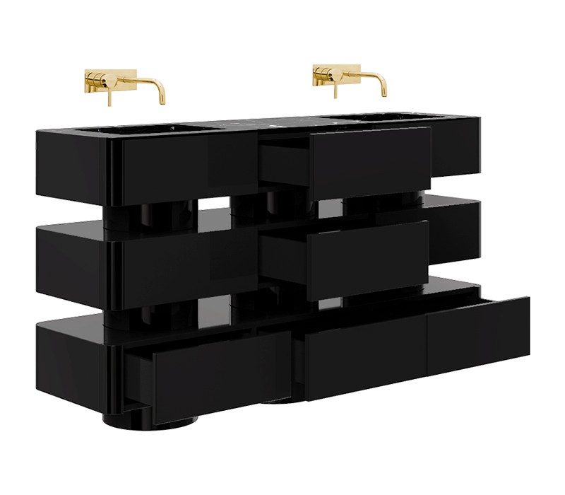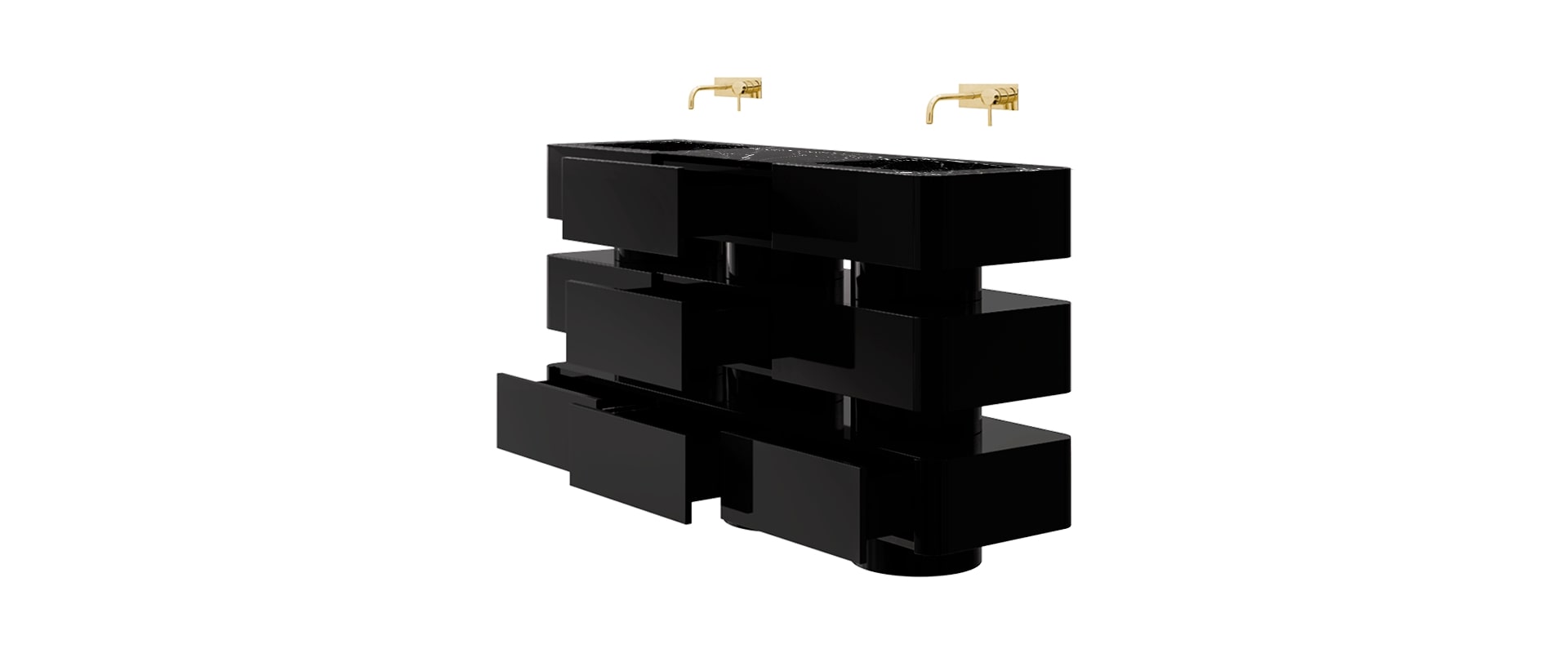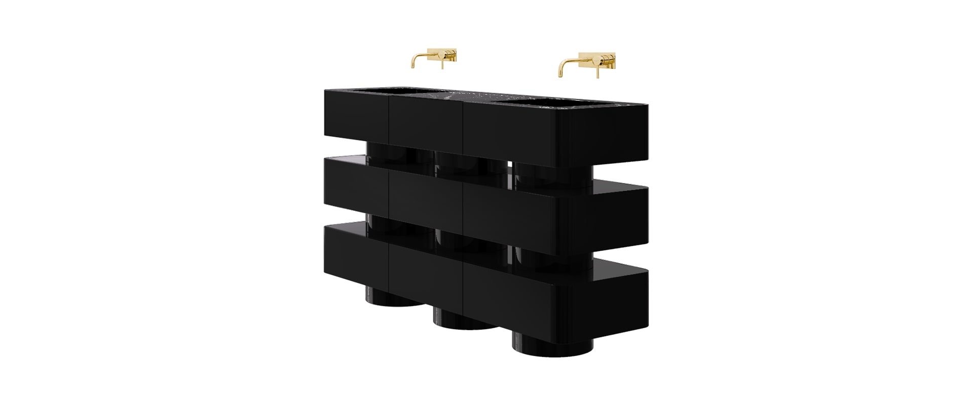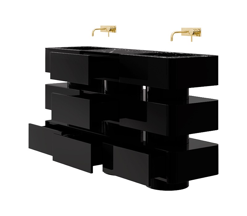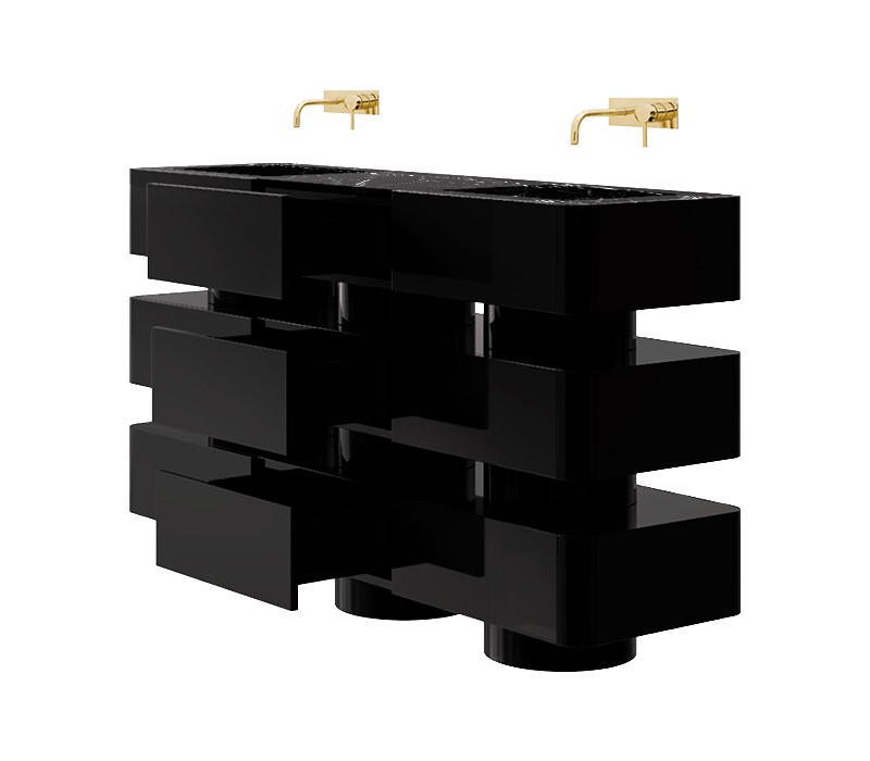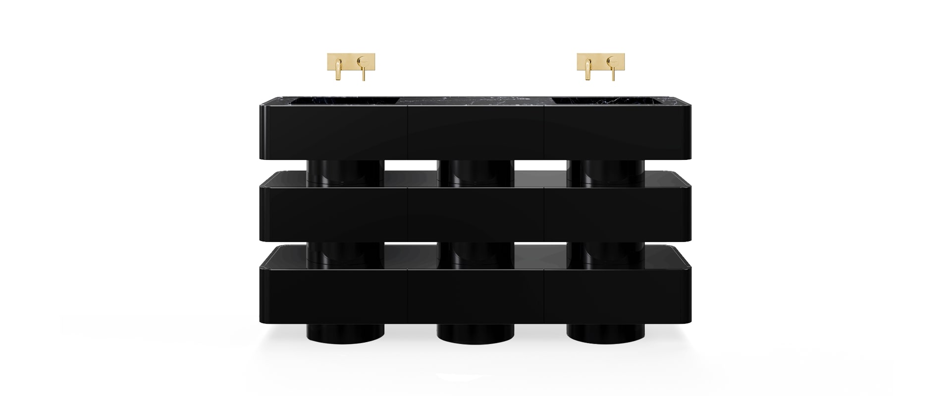 Shinto shrines are places of reverence, and the abodes of the 'kami' Gods, where sacred objects are stored in the innermost chamber of the altar, not seen by anybody. The Shinto Vanity Cabinet was designed with a gloss black lacquered structure and Nero Marquina marble sinks to add a grand luxurious glamour to your bathroom design.