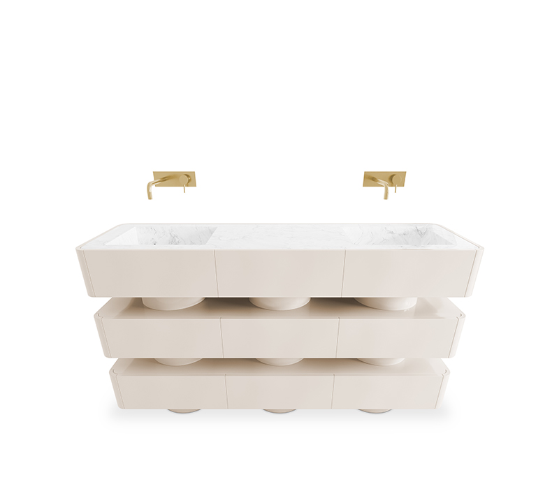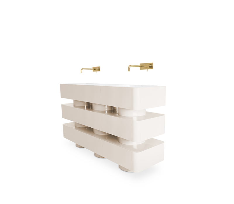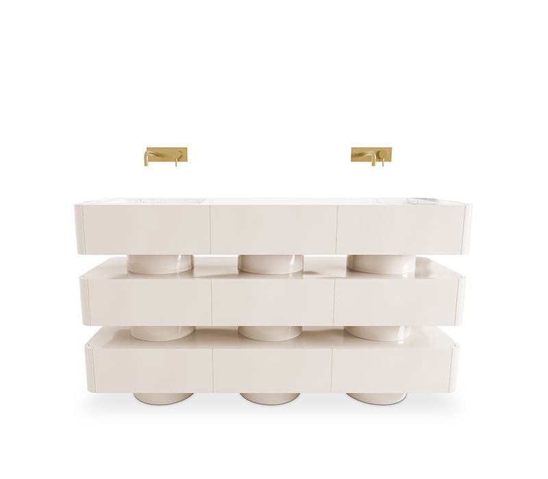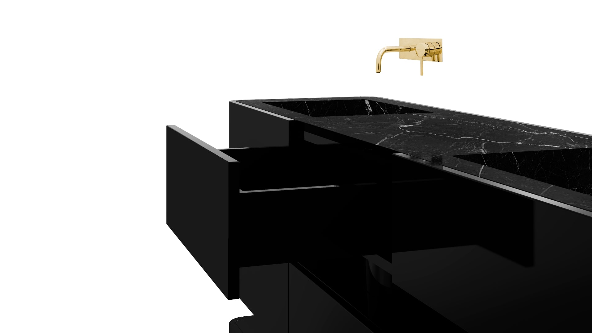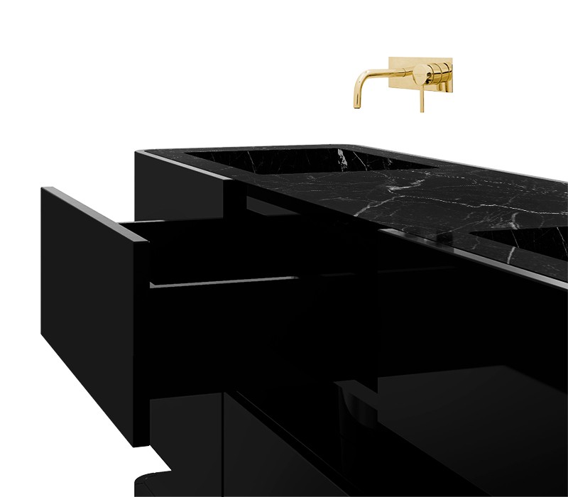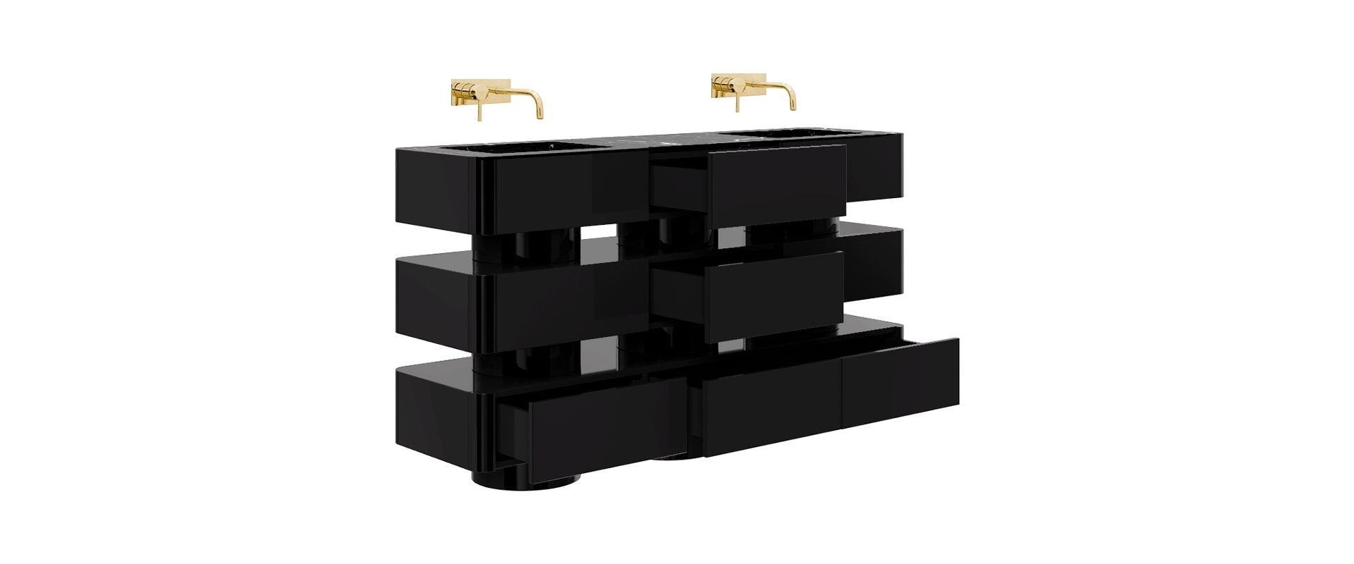 Shinto shrines are places of reverence, and the abodes of the 'kami' Gods, where sacred objects are stored in the innermost chamber of the altar, not seen by anybody. The Shinto Vanity Cabinet was designed with a gloss black lacquered structure and Nero Marquina marble sinks to add a grand luxurious glamour to your bathroom design.
