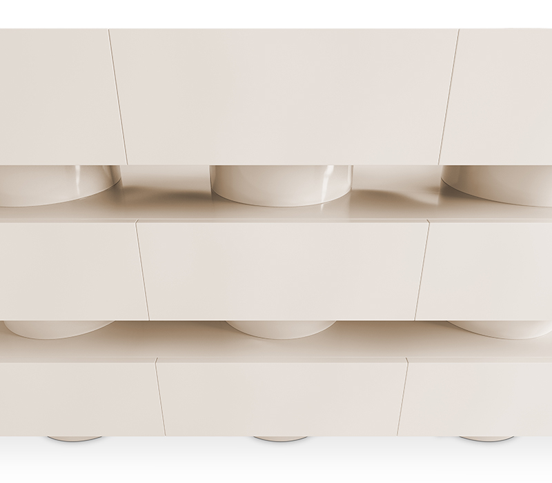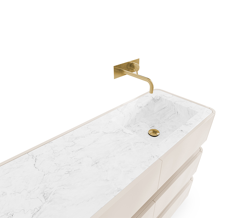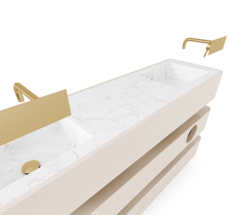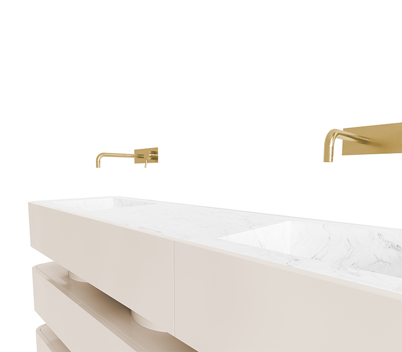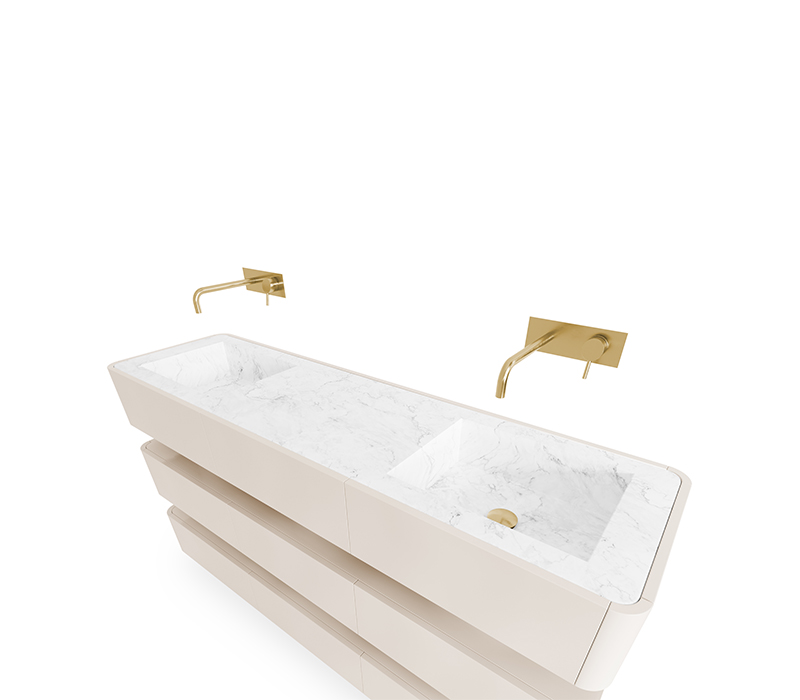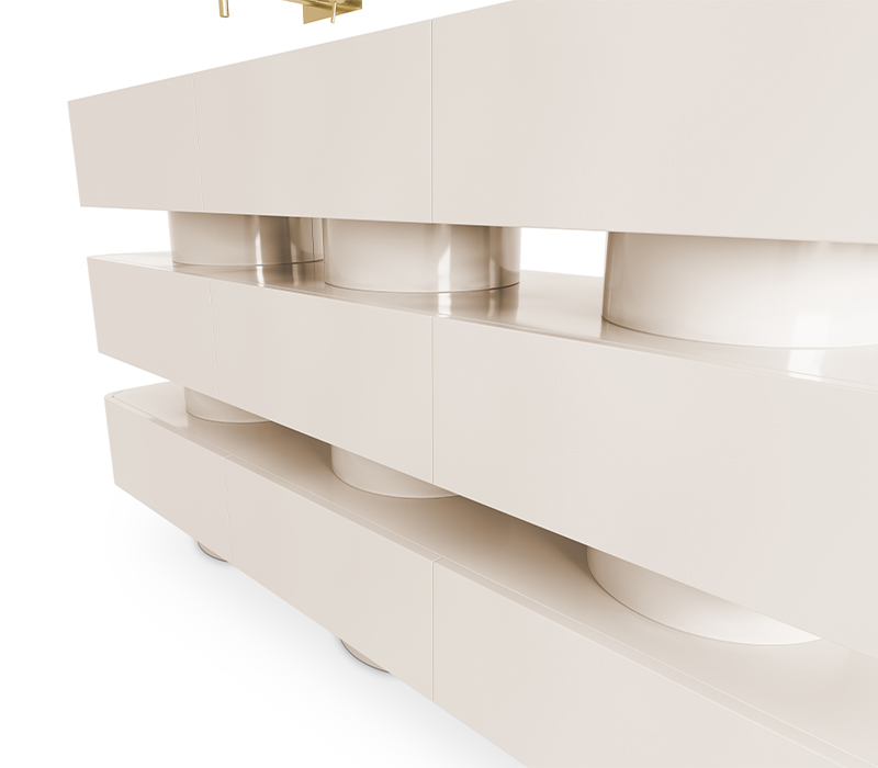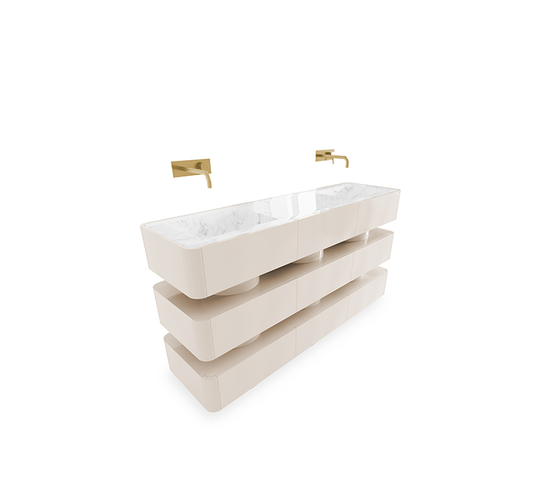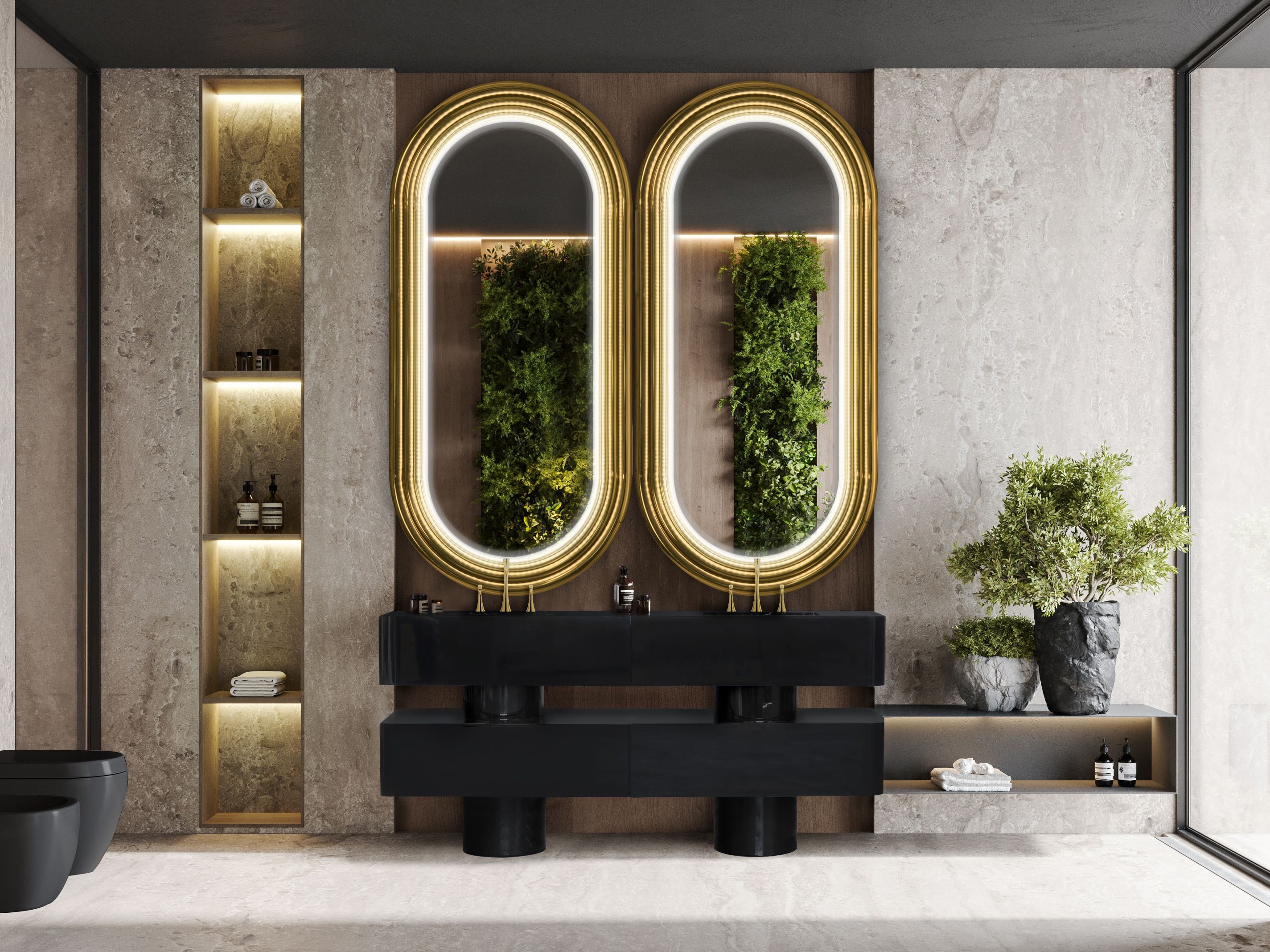 Shinto shrines are places of reverence, and the abodes of the 'kami' Gods, where sacred objects are stored in the innermost chamber of the altar, not seen by anybody. The Shinto Vanity Cabinet was designed with a gloss black lacquered structure and Nero Marquina marble sinks to add a grand luxurious glamour to your bathroom design.