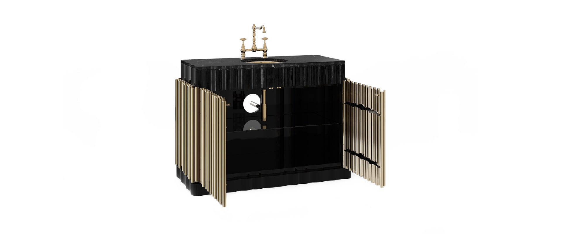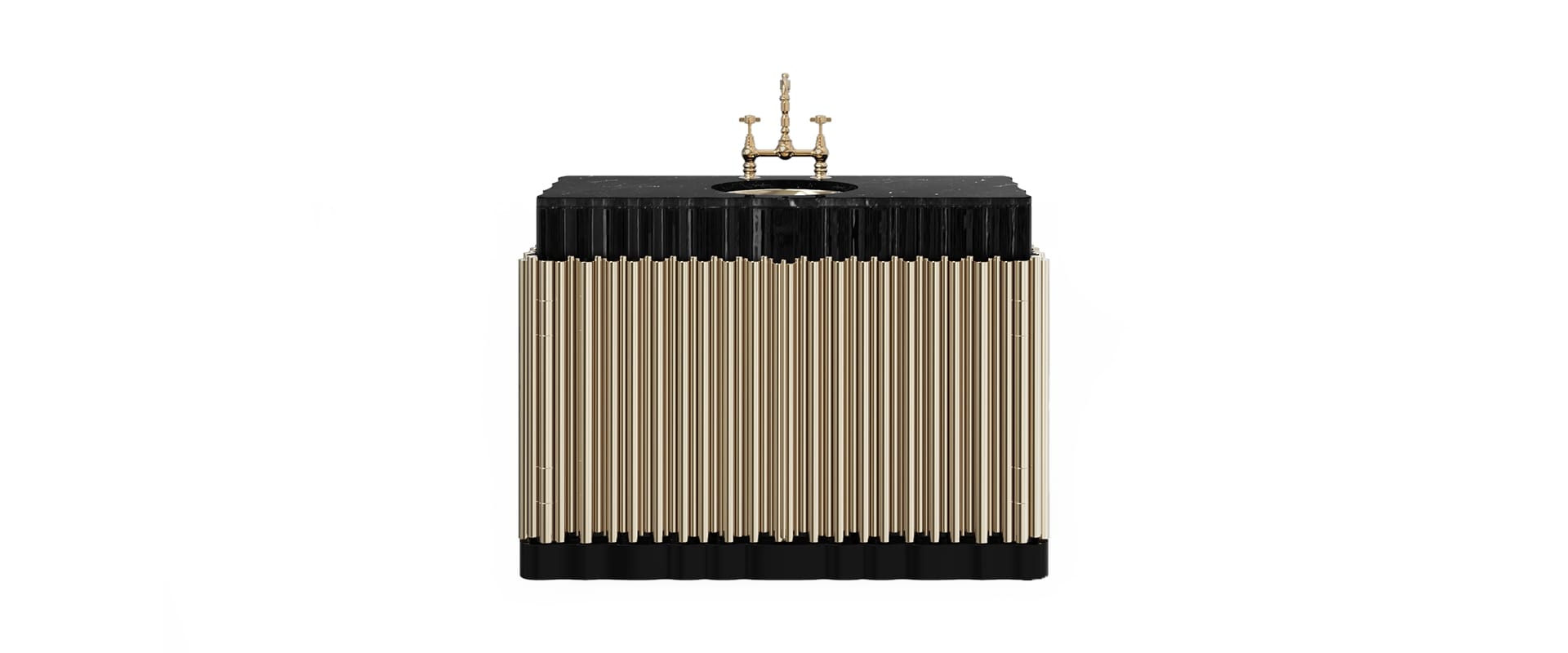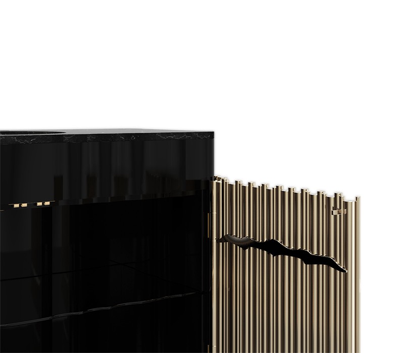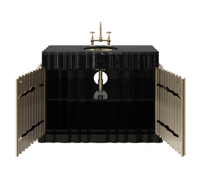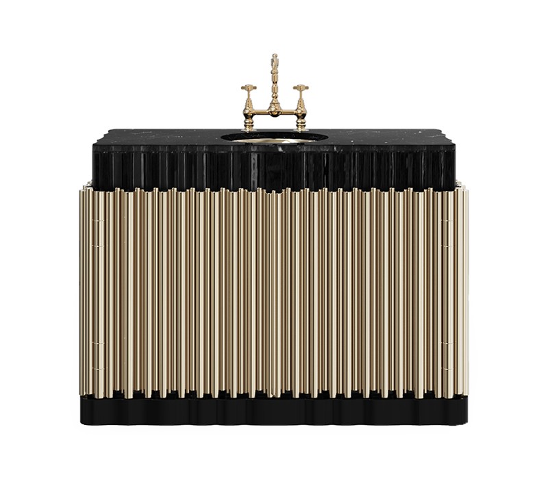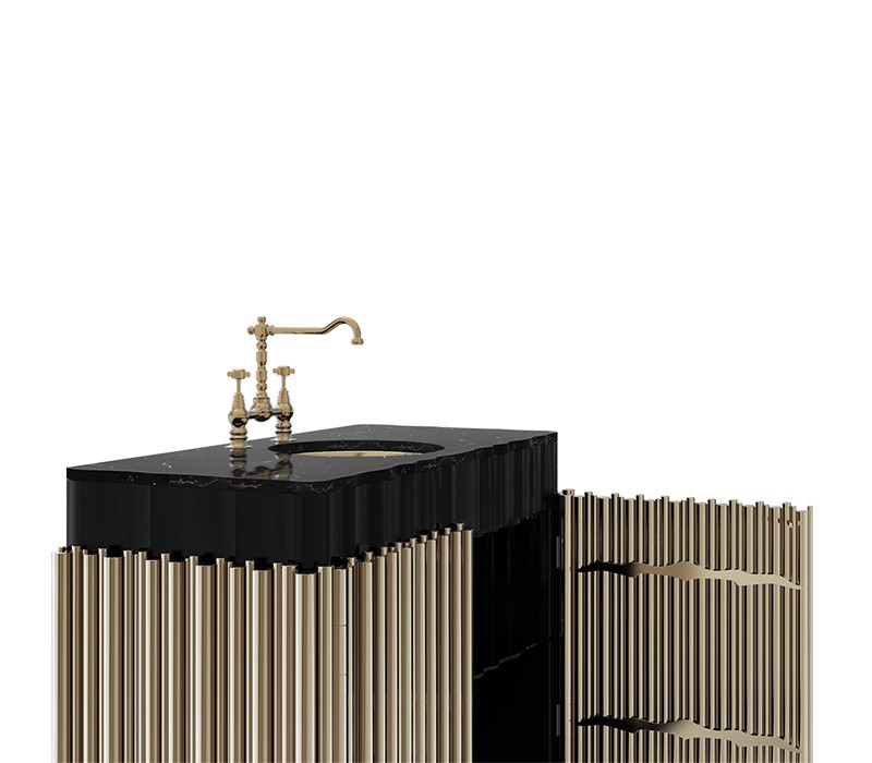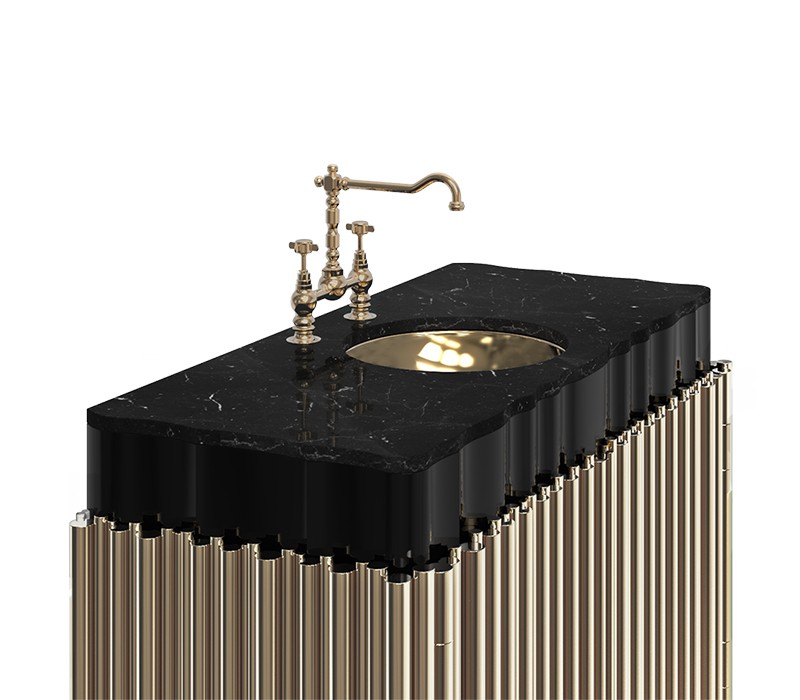 The Symphony Single Vanity Cabinet draws inspiration from church organ tubes, as well as the curves of a violin. Like all of Maison Valentina’s designs, the Symphony Vanity Cabinet is handmade by experienced artisans, each with different specialties, from metalwork to woodcarving. It features a cluster of polished brass tubes that envelopes an exotic wood structure with an interior that contains one large glass shelf and the countertop is all made of Nero Marquina Marble. Apart from this, you still find two magnificent round gold-plated vessel sinks. With this single vanity cabinet, glamour and comfort are guaranteed in a modern bathroom.