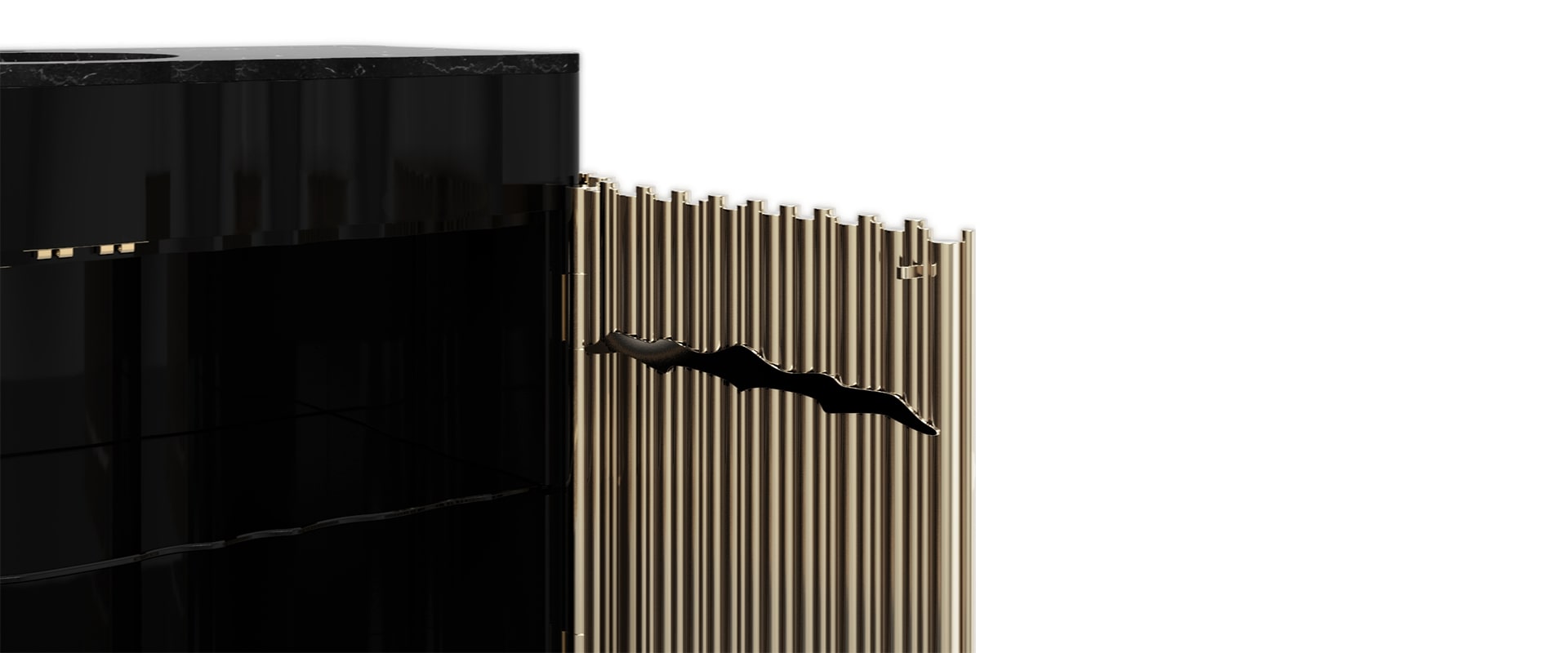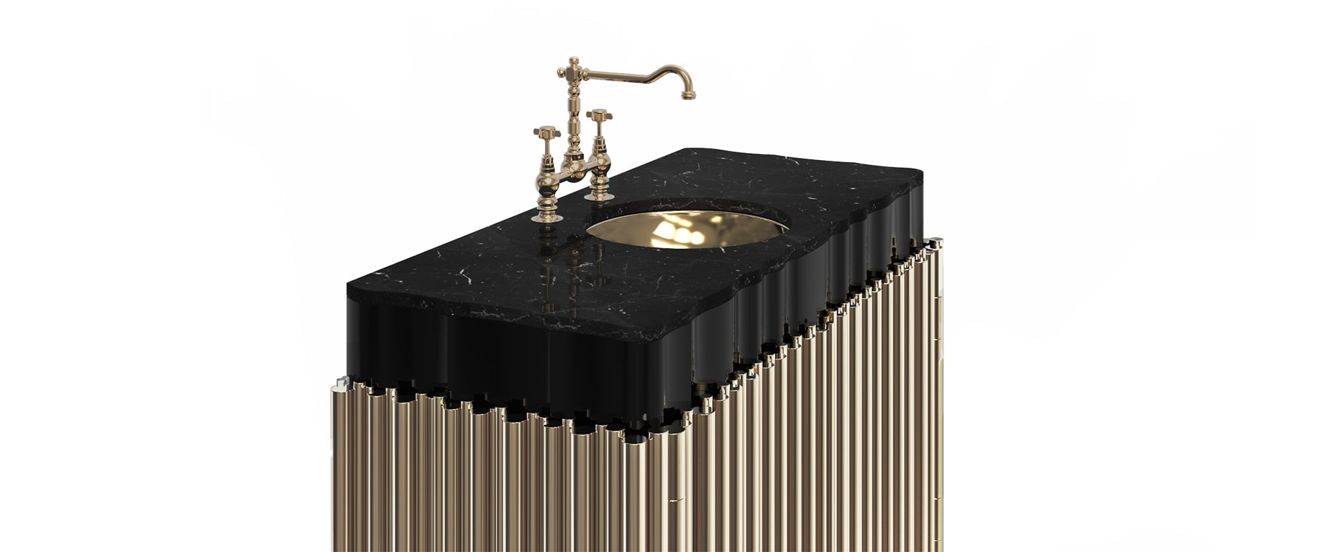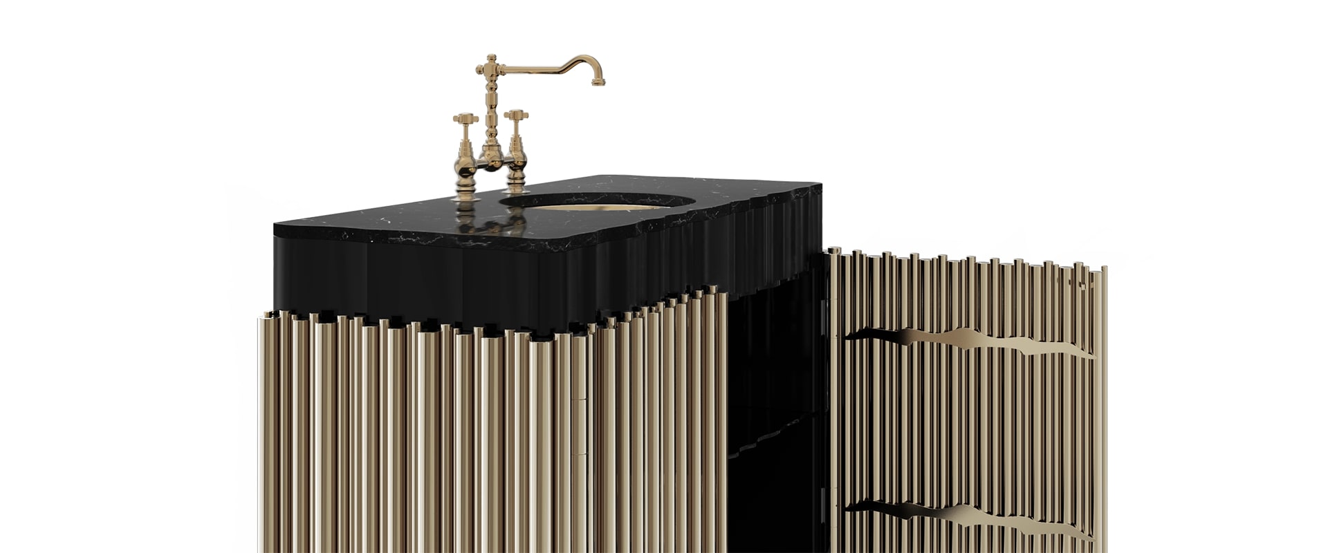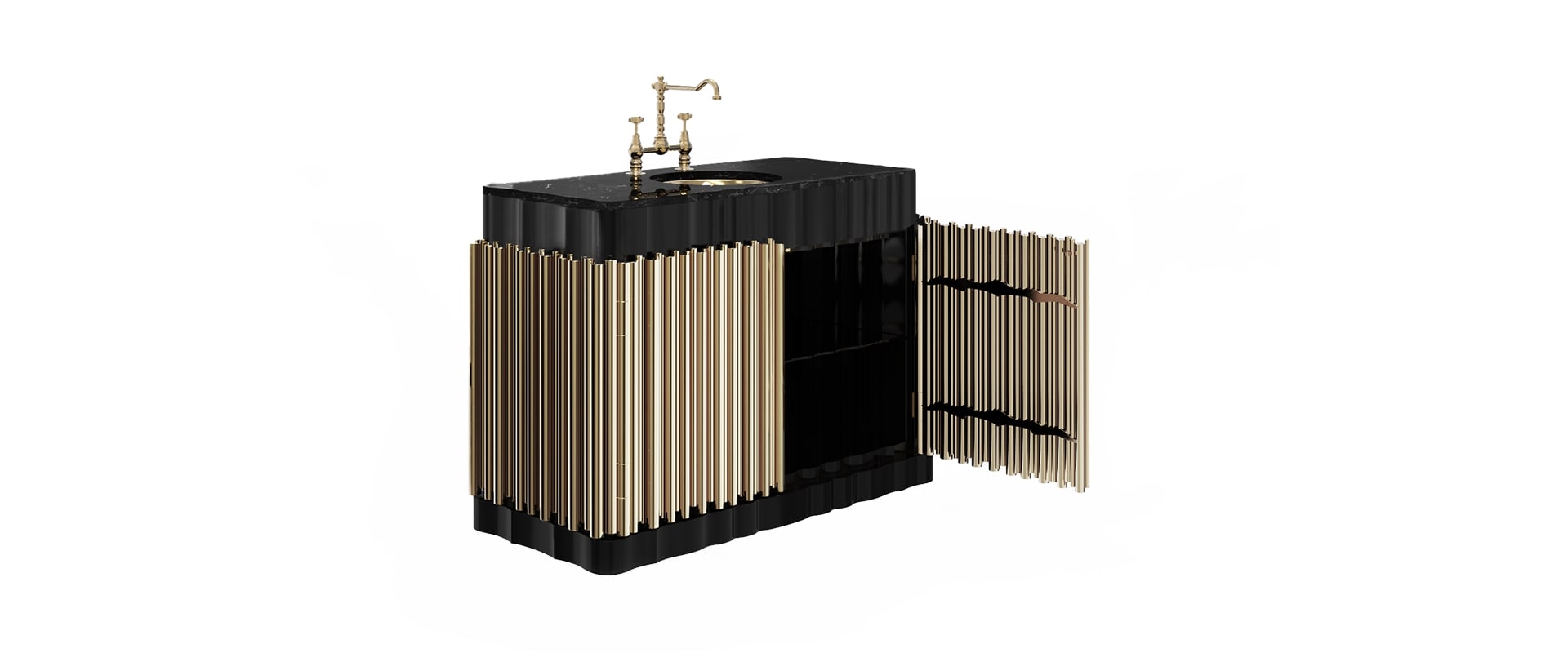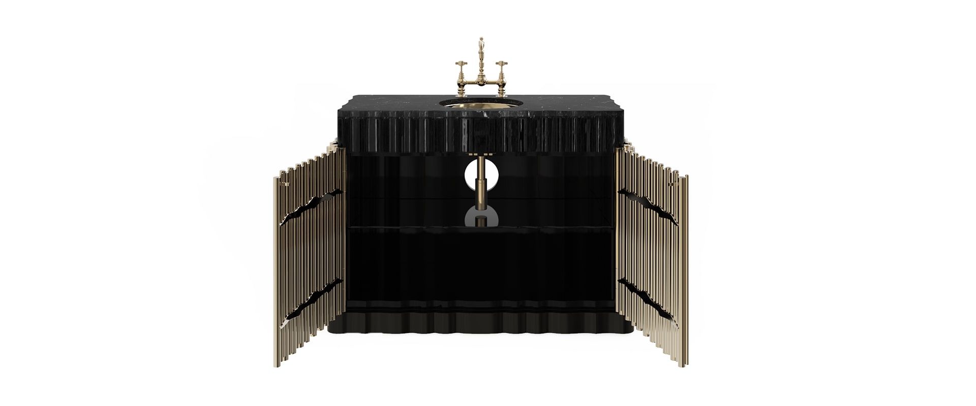 The Symphony Single Vanity Cabinet draws inspiration from church organ tubes, as well as the curves of a violin. Like all of Maison Valentina’s designs, the Symphony Vanity Cabinet is handmade by experienced artisans, each with different specialties, from metalwork to woodcarving. It features a cluster of polished brass tubes that envelopes an exotic wood structure with an interior that contains one large glass shelf and the countertop is all made of Nero Marquina Marble. Apart from this, you still find two magnificent round gold-plated vessel sinks. With this single vanity cabinet, glamour and comfort are guaranteed in a modern bathroom.