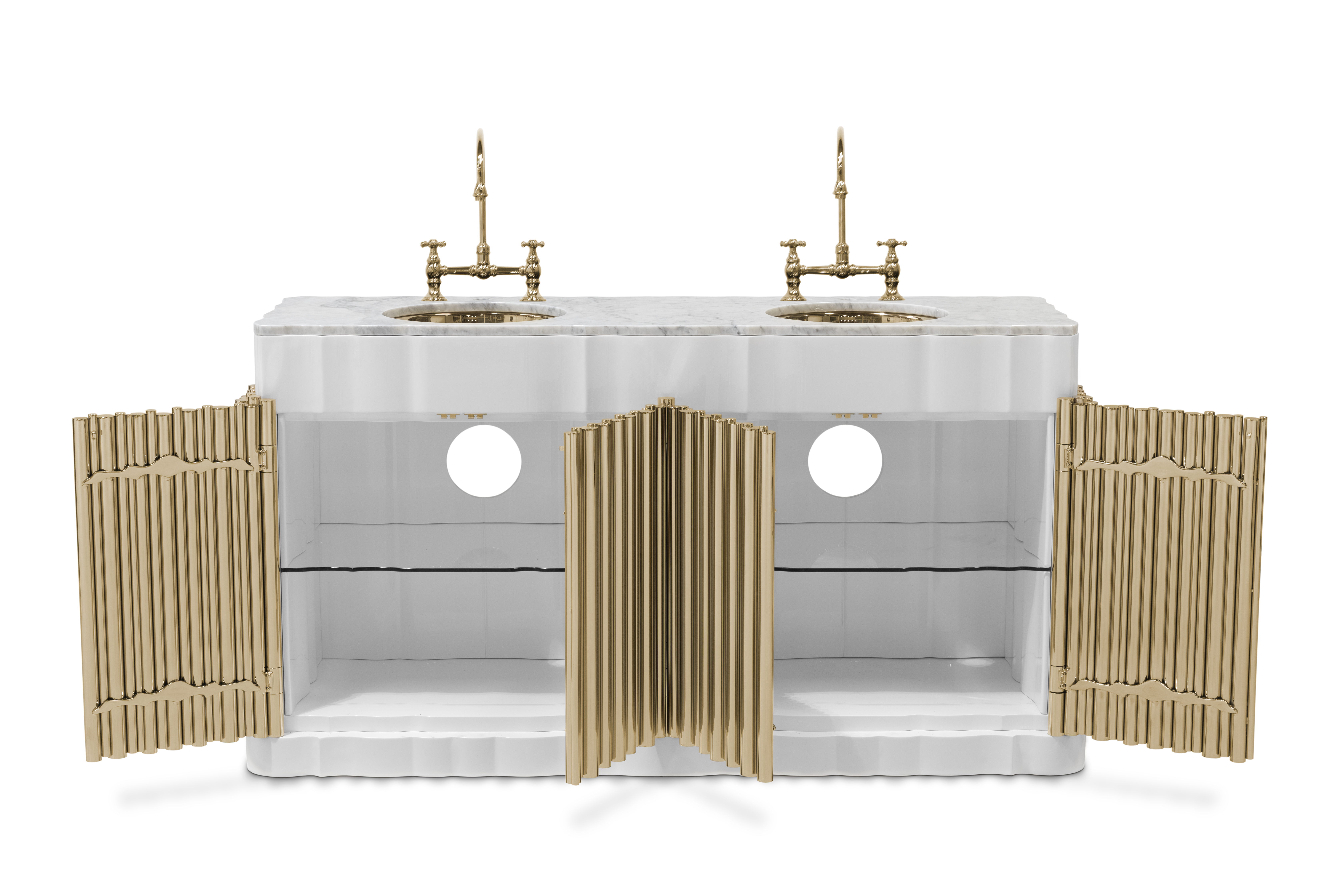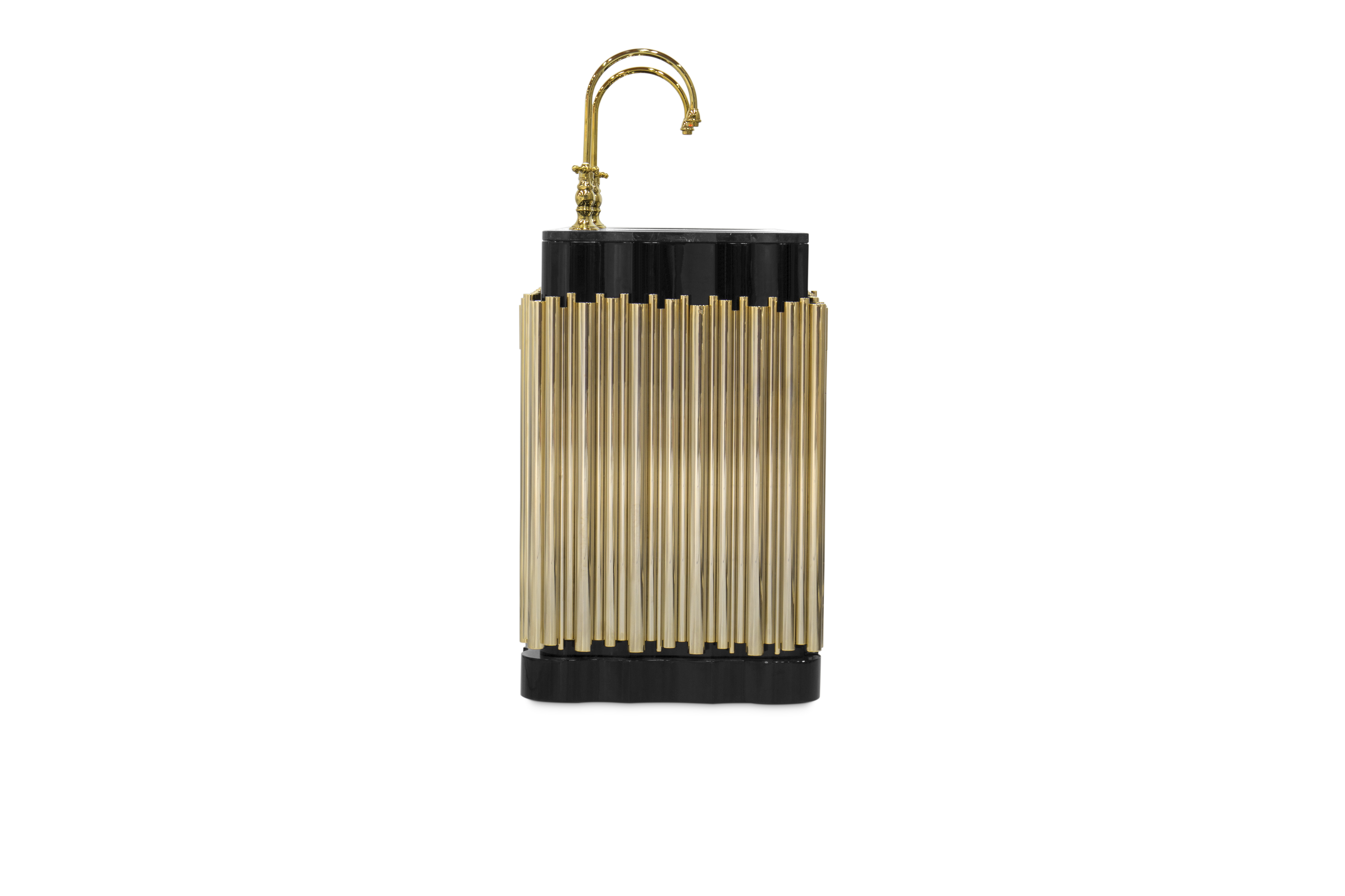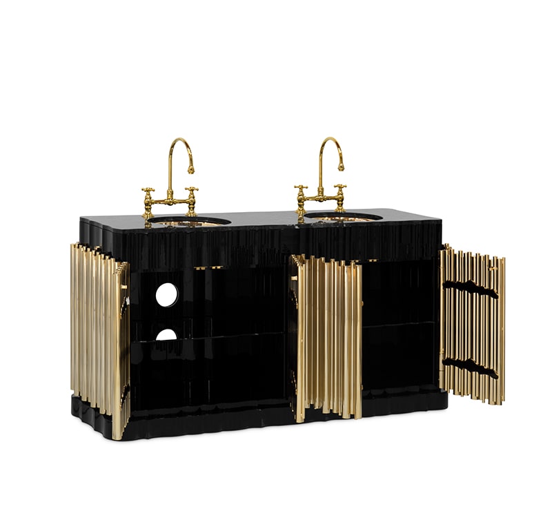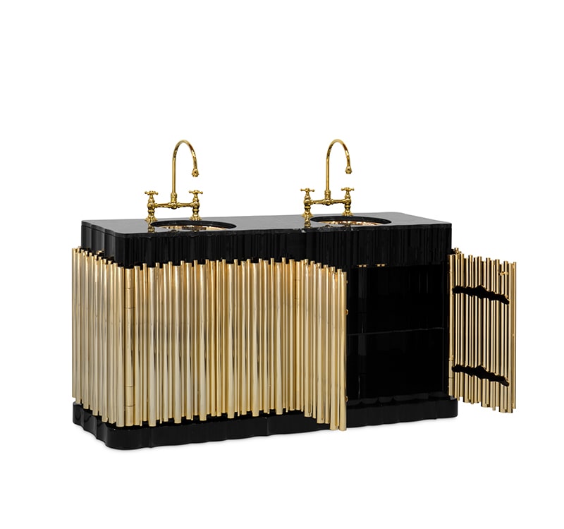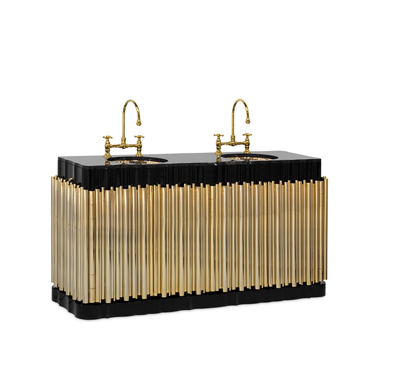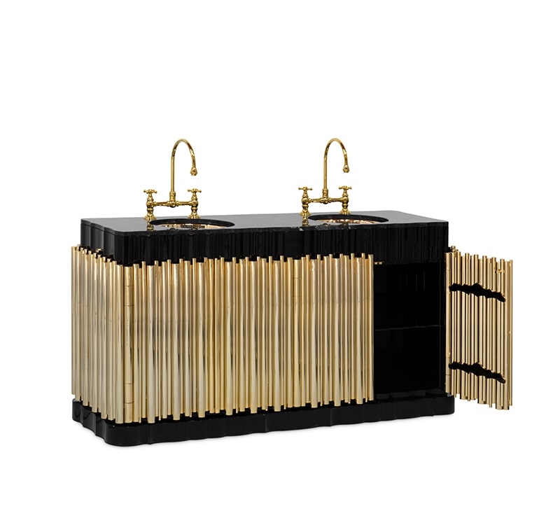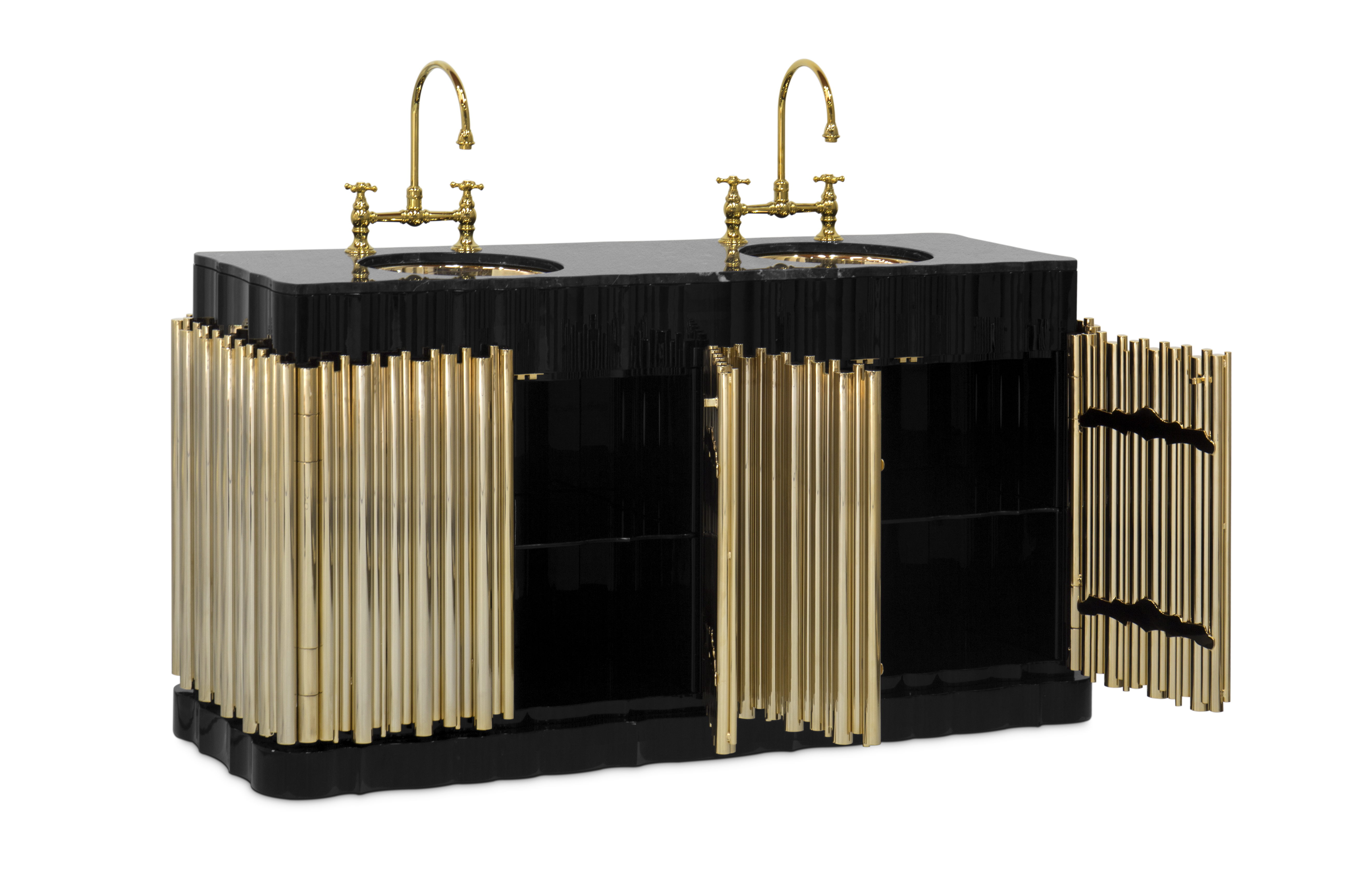 The Symphony Vanity Cabinet draws inspiration from church organ tubes, as well as the curves of a violin. Like all of Maison Valentina’s designs, the Symphony Vanity Cabinet is handmade by experienced artisans, each with different specialties, from metalwork to woodcarving. It features a cluster of polished brass tubes that envelopes an exotic wood structure with an interior that contains one large glass shelf and the countertop is all made of Nero Marquina Marble. Apart from this, you still find two magnificent round gold-plated vessel sinks. With this vanity cabinet, glamour and comfort are guaranteed in a modern bathroom.