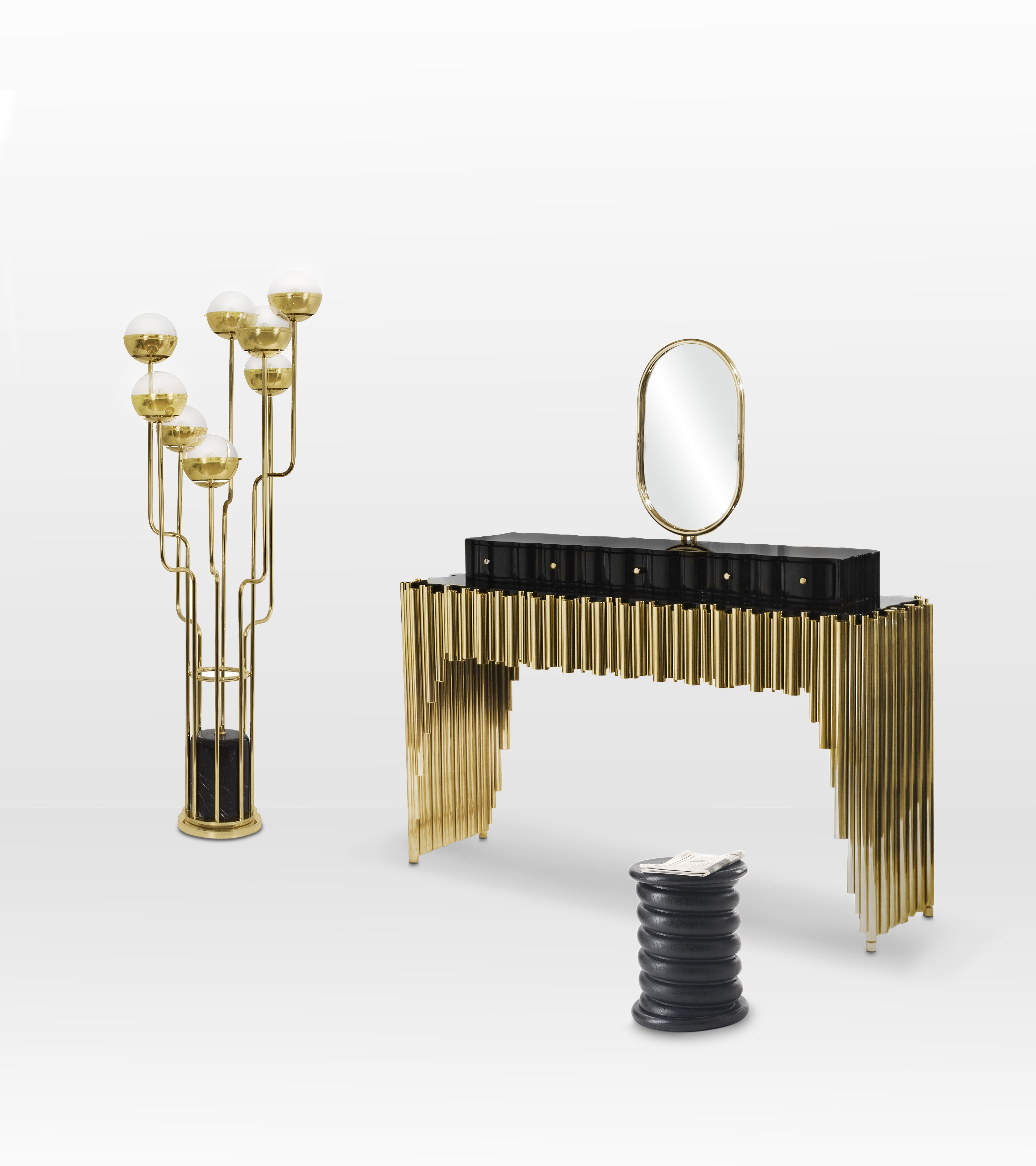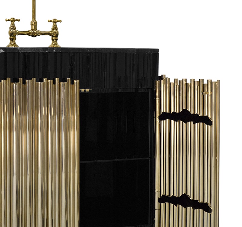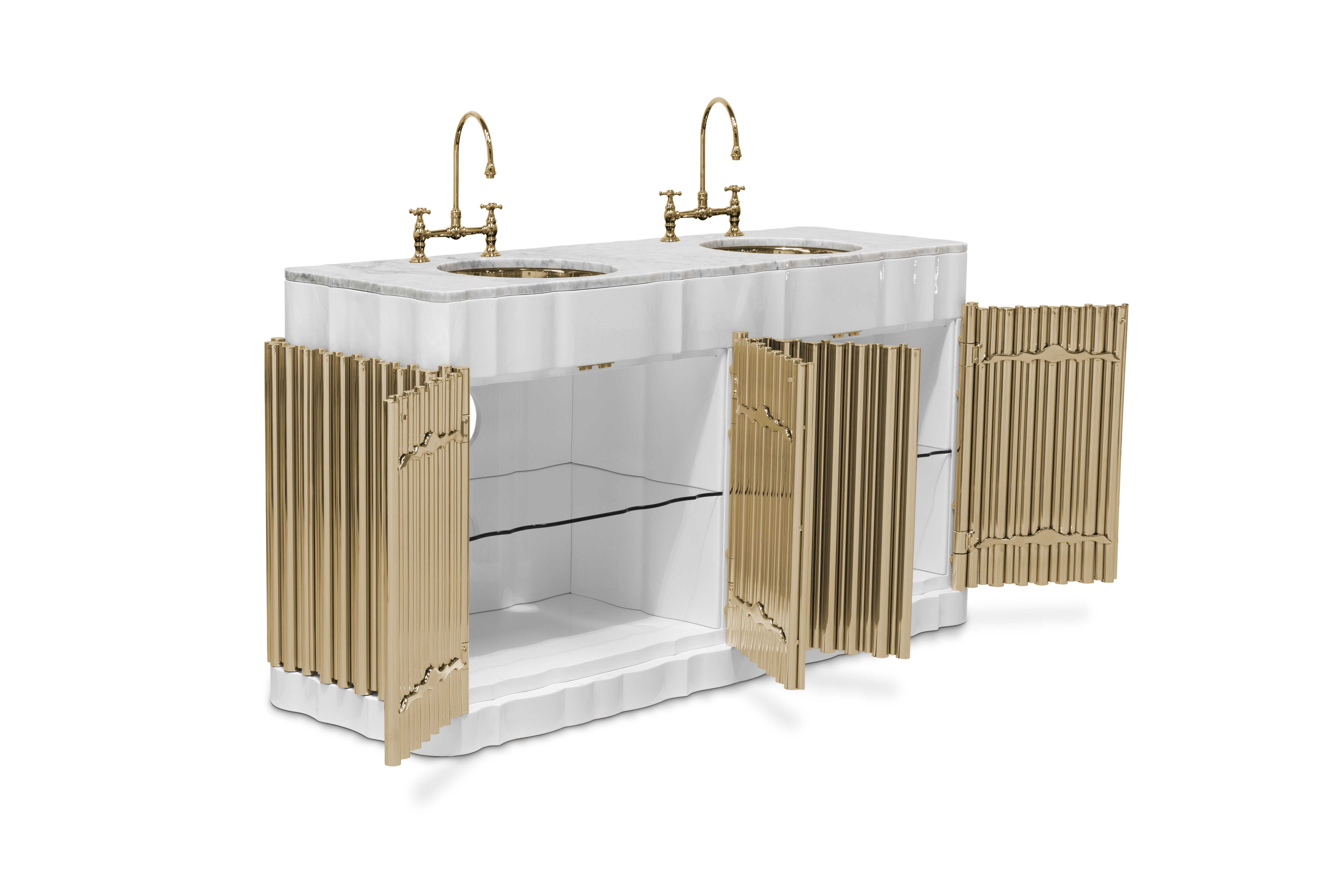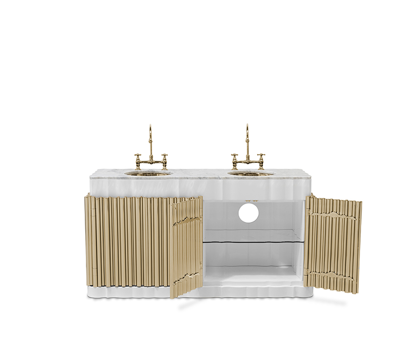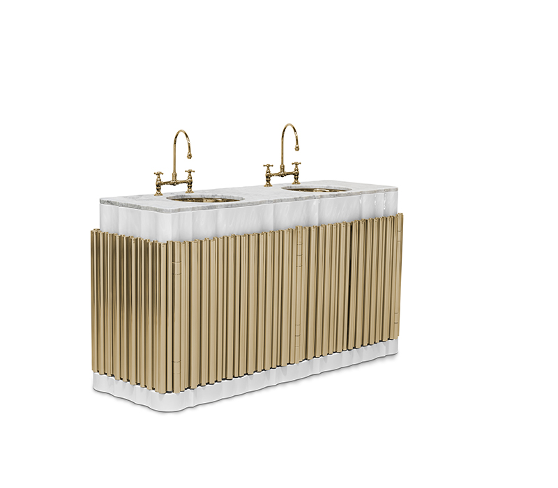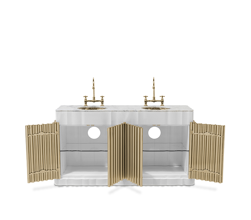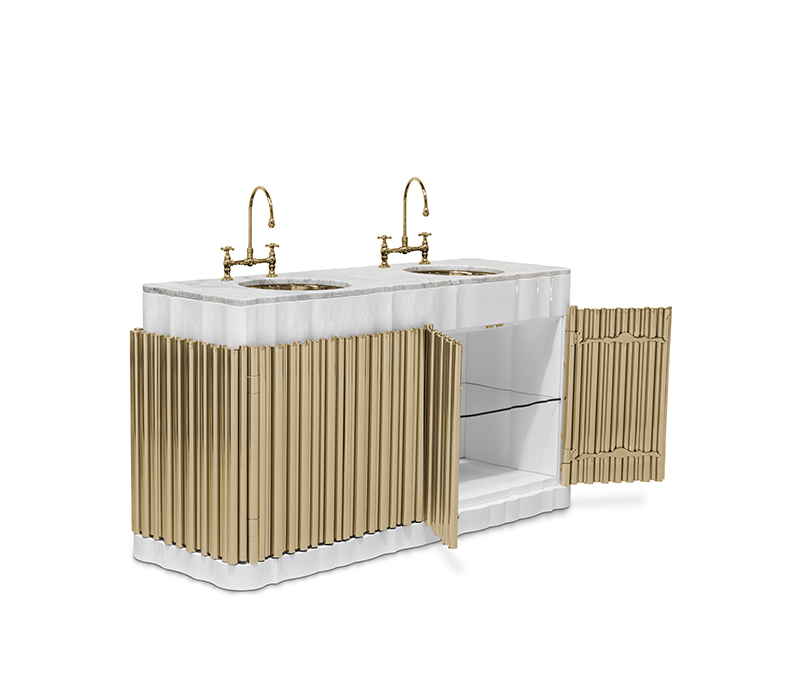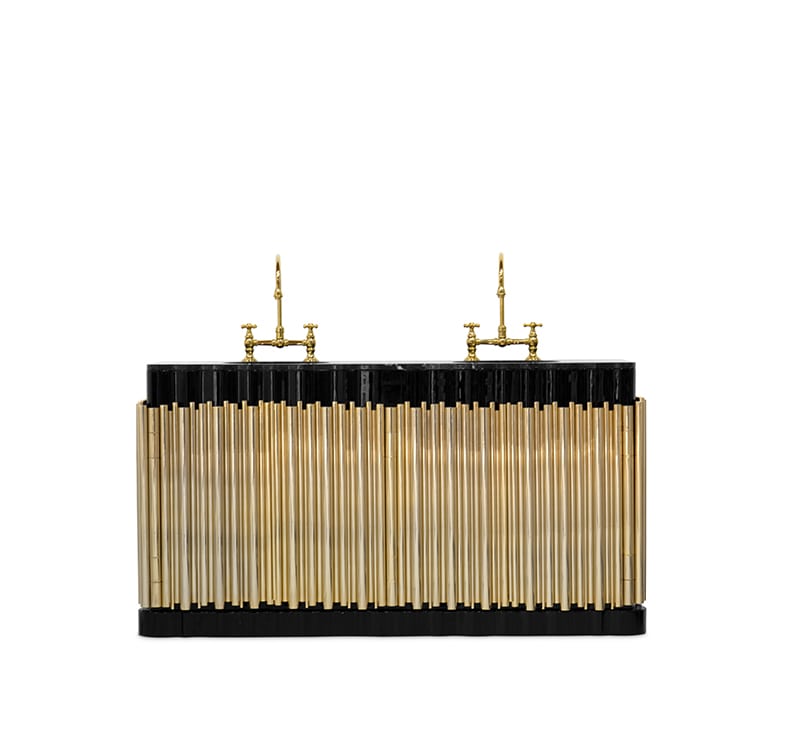 The Symphony Vanity Cabinet draws inspiration from church organ tubes, as well as the curves of a violin. Like all of Maison Valentina’s designs, the Symphony Vanity Cabinet is handmade by experienced artisans, each with different specialties, from metalwork to woodcarving. It features a cluster of polished brass tubes that envelopes an exotic wood structure with an interior that contains one large glass shelf and the countertop is all made of Nero Marquina Marble. Apart from this, you still find two magnificent round gold-plated vessel sinks. With this vanity cabinet, glamour and comfort are guaranteed in a modern bathroom.