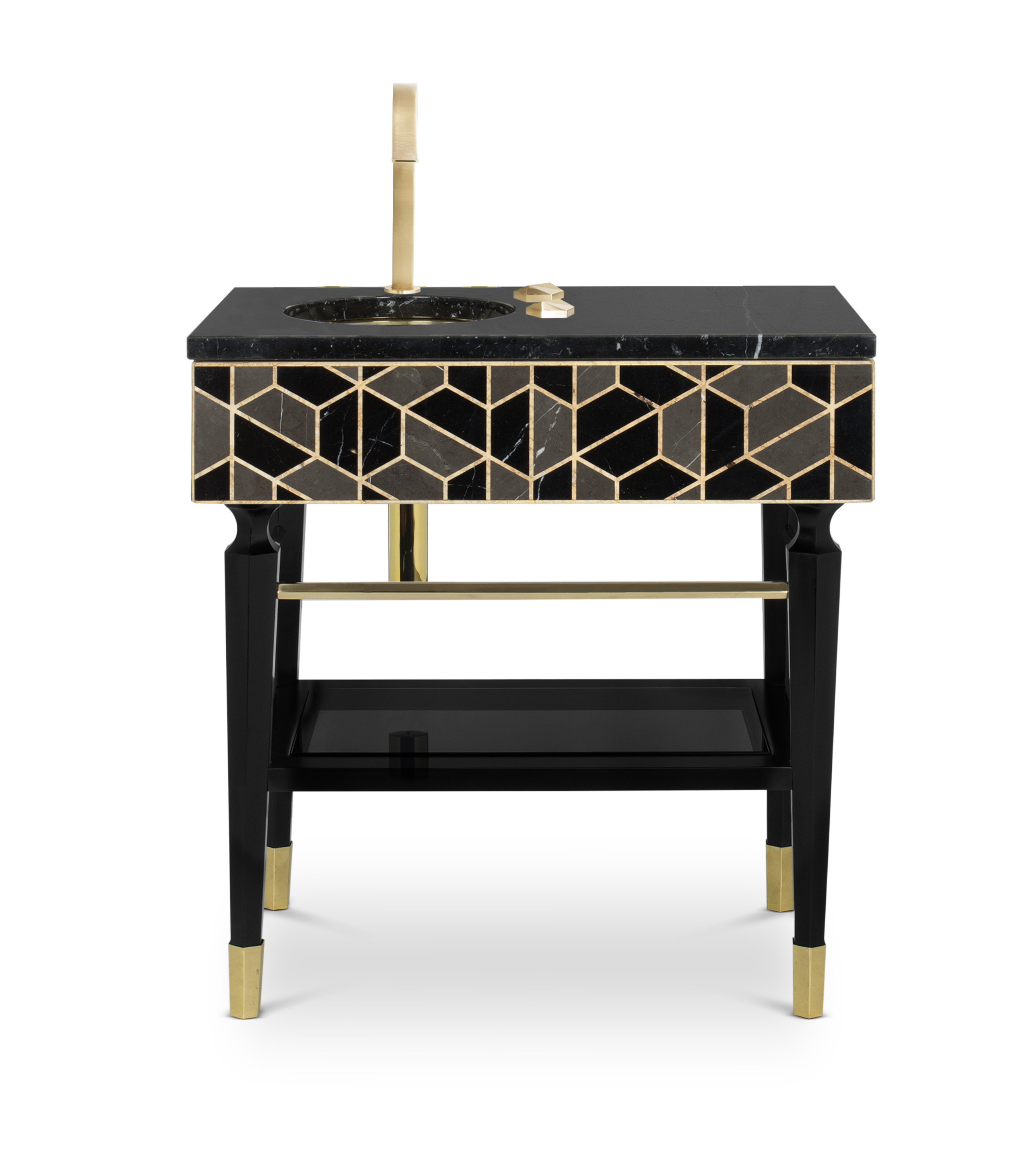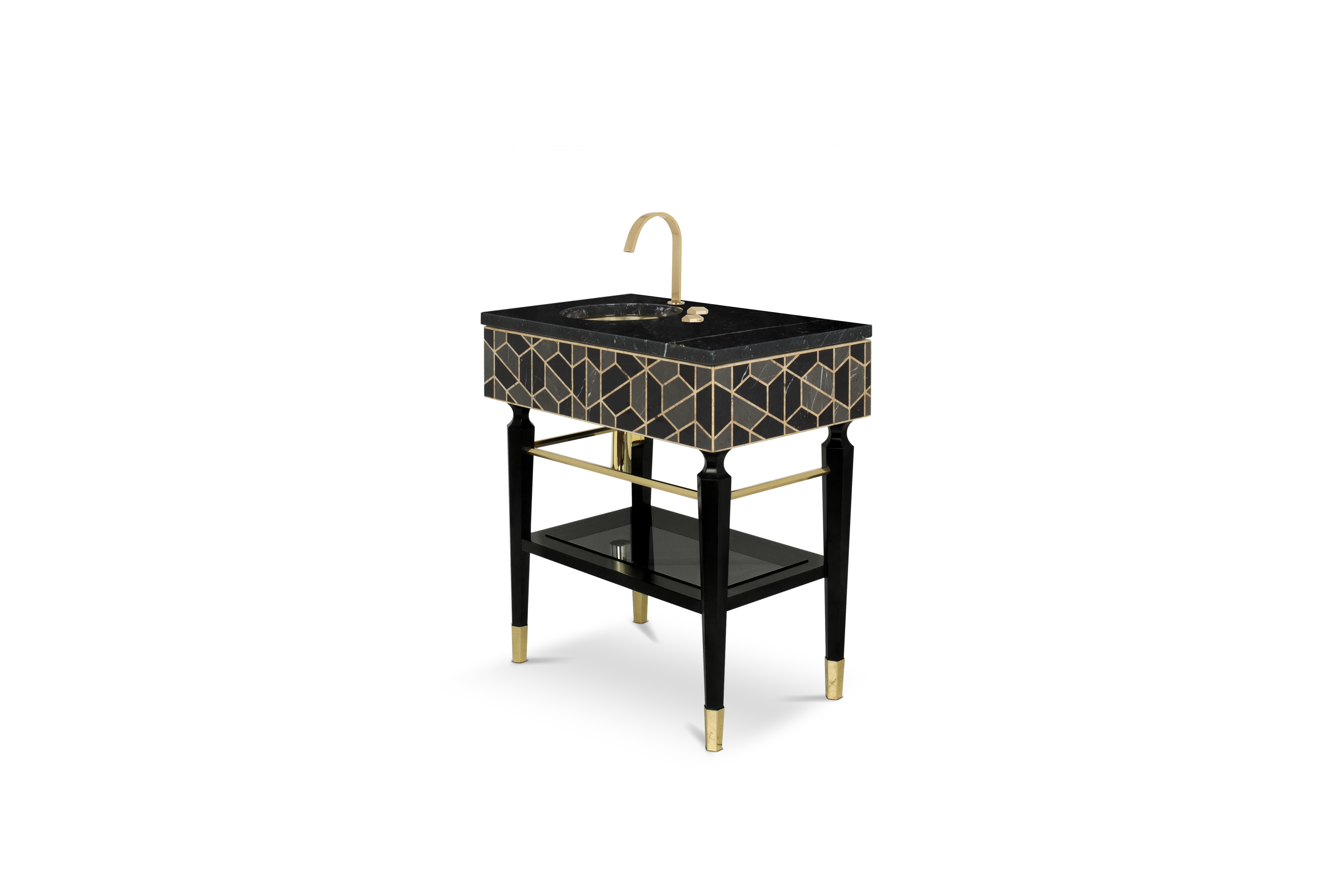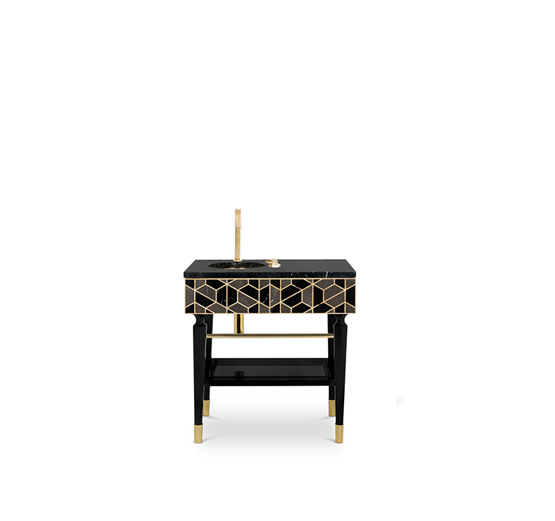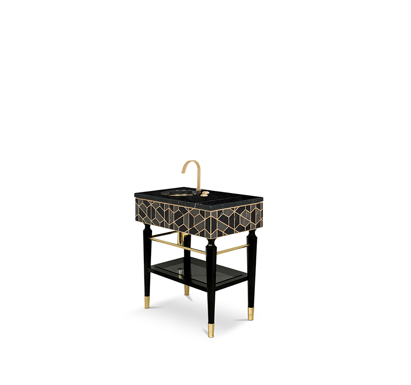 Highly appreciated for its decorative purposes for centuries, the tortoise’s hard outer shell has been the inspiration for different pieces. The reason is its beautiful patterns and colors, which make the Tortoise Single Vanity Cabinet unique. Black, grey and golden colors show a marvelous piece, contrasting with the golden tap and sink and black legs. Highly functional, it includes a mirrored shelf, a built-in drawer, a spacious Nero Marquina countertop, and gold plated tubes where you can hang the most comfortable towels. A strong combination of uniqueness and functionality to a modern bathroom.