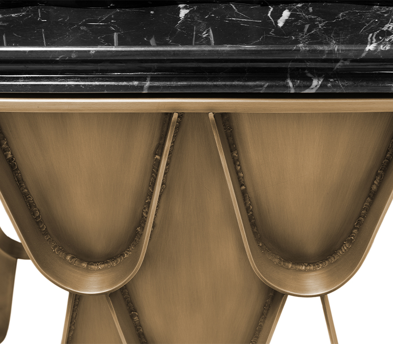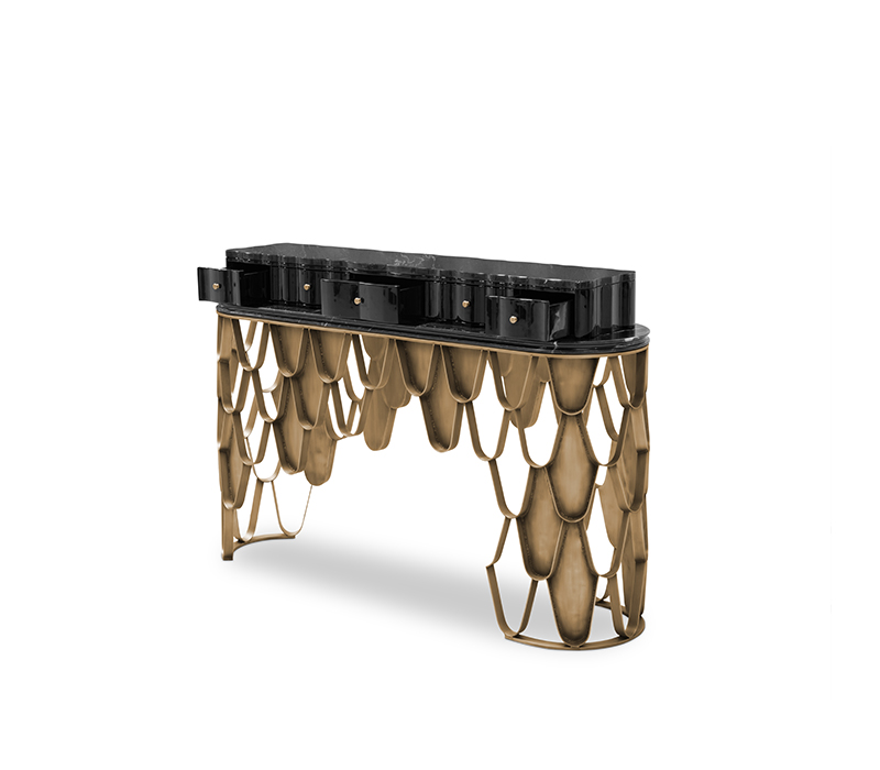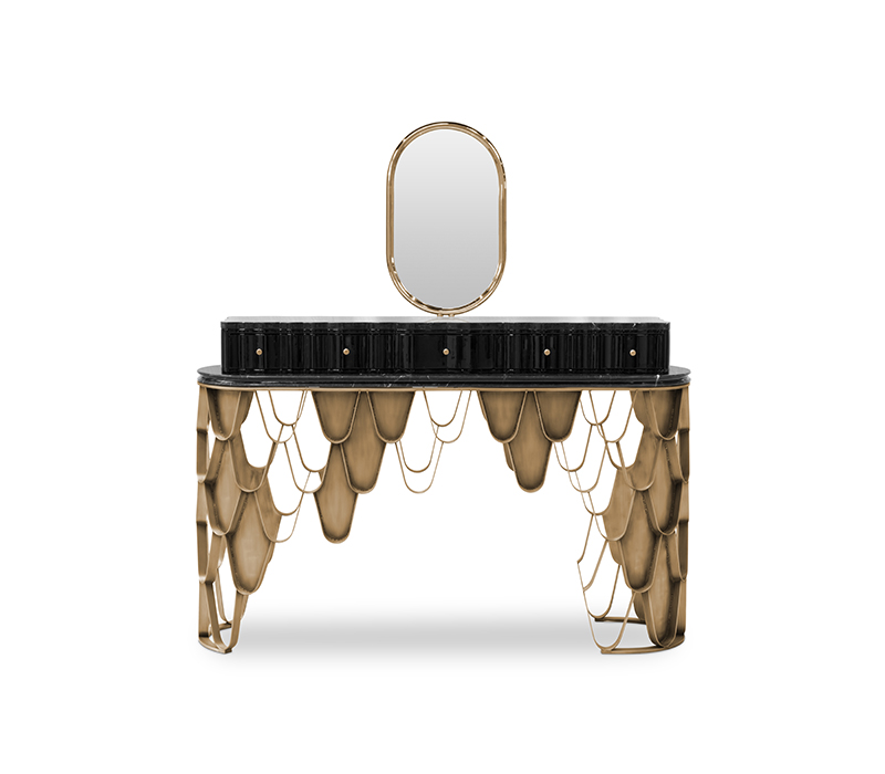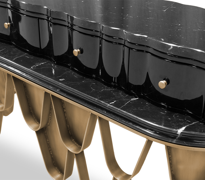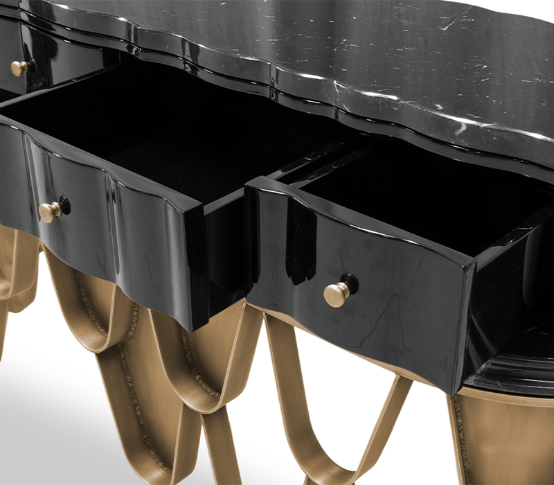 The Koi Vanity Table draws inspiration from the graceful Japanese Koi carp, bringing a sense of calm and refinement to your space. The black lacquer structure with a glossy finish flows seamlessly into the Nero Marquina marble top, creating a unified and sophisticated design. The brushed aged brass handles and base provide a subtle yet elegant touch, enhancing the overall aesthetic. With ample drawer space for storage, this vanity table perfectly blends modern luxury with practicality, making it an ideal addition to any contemporary bathroom or bedroom.