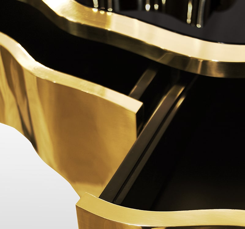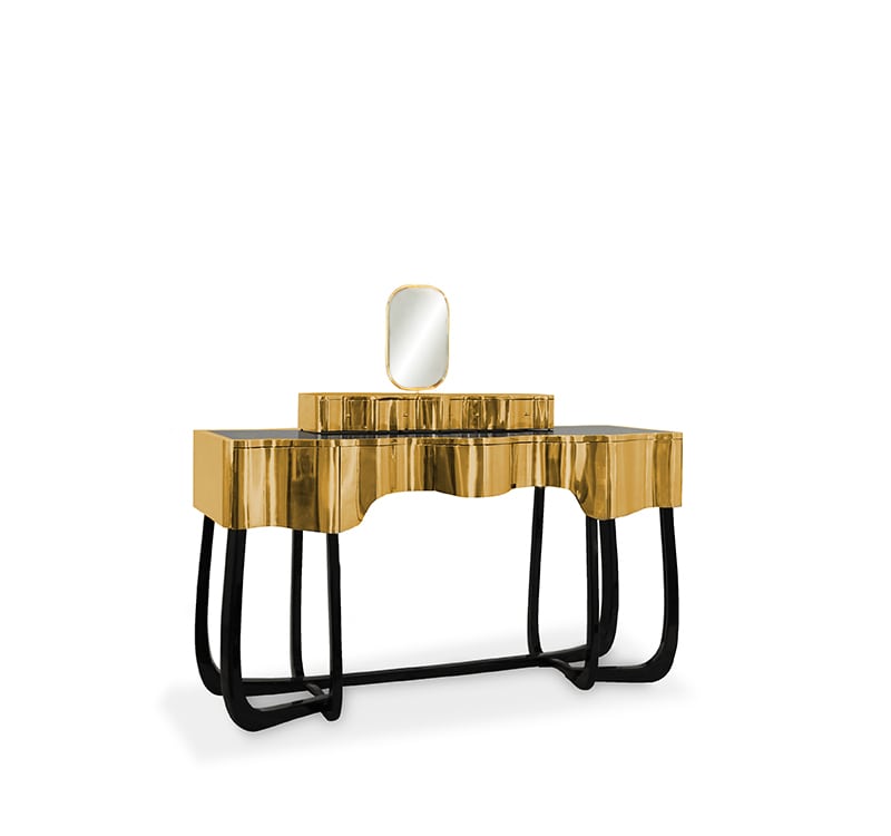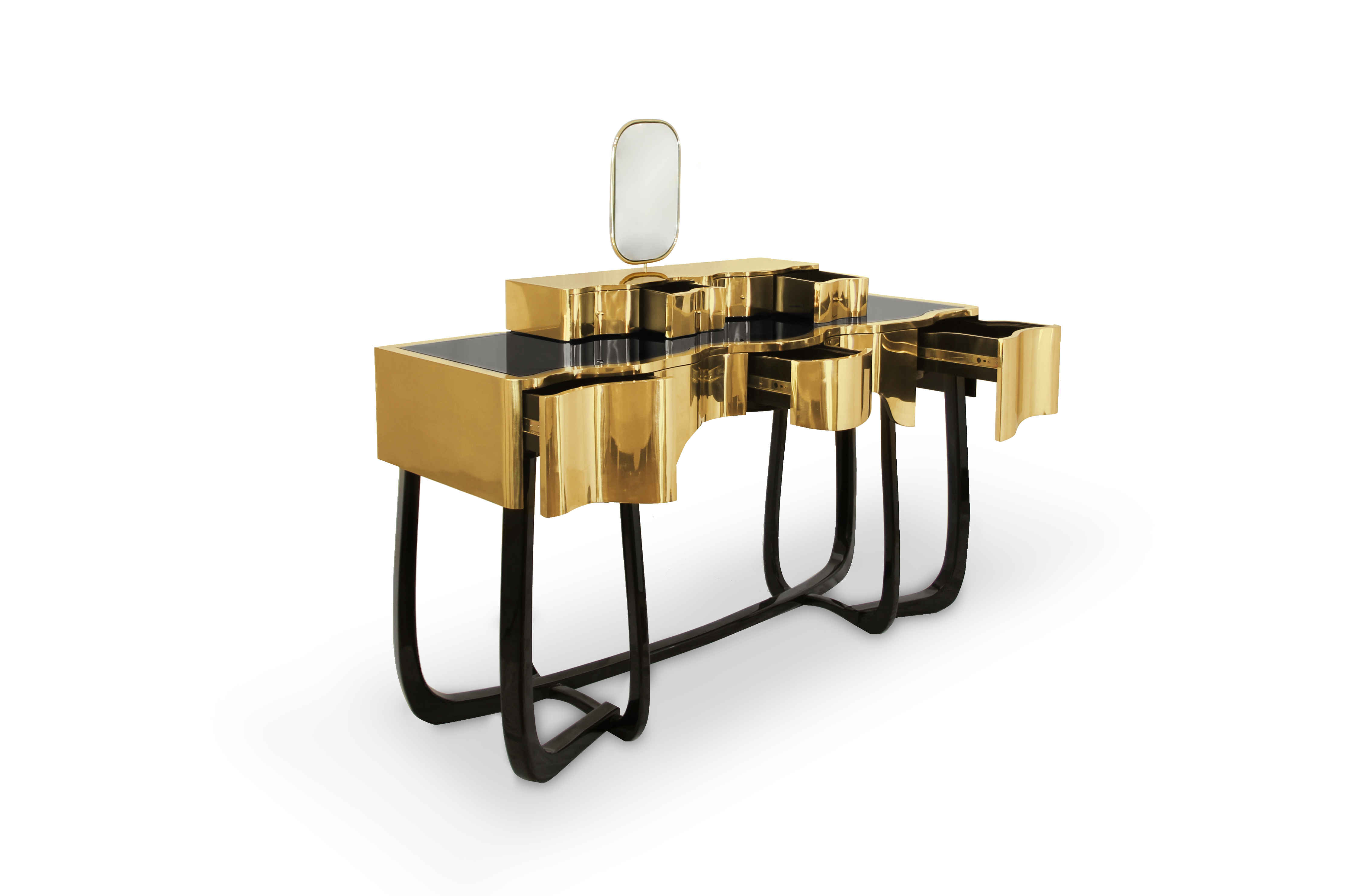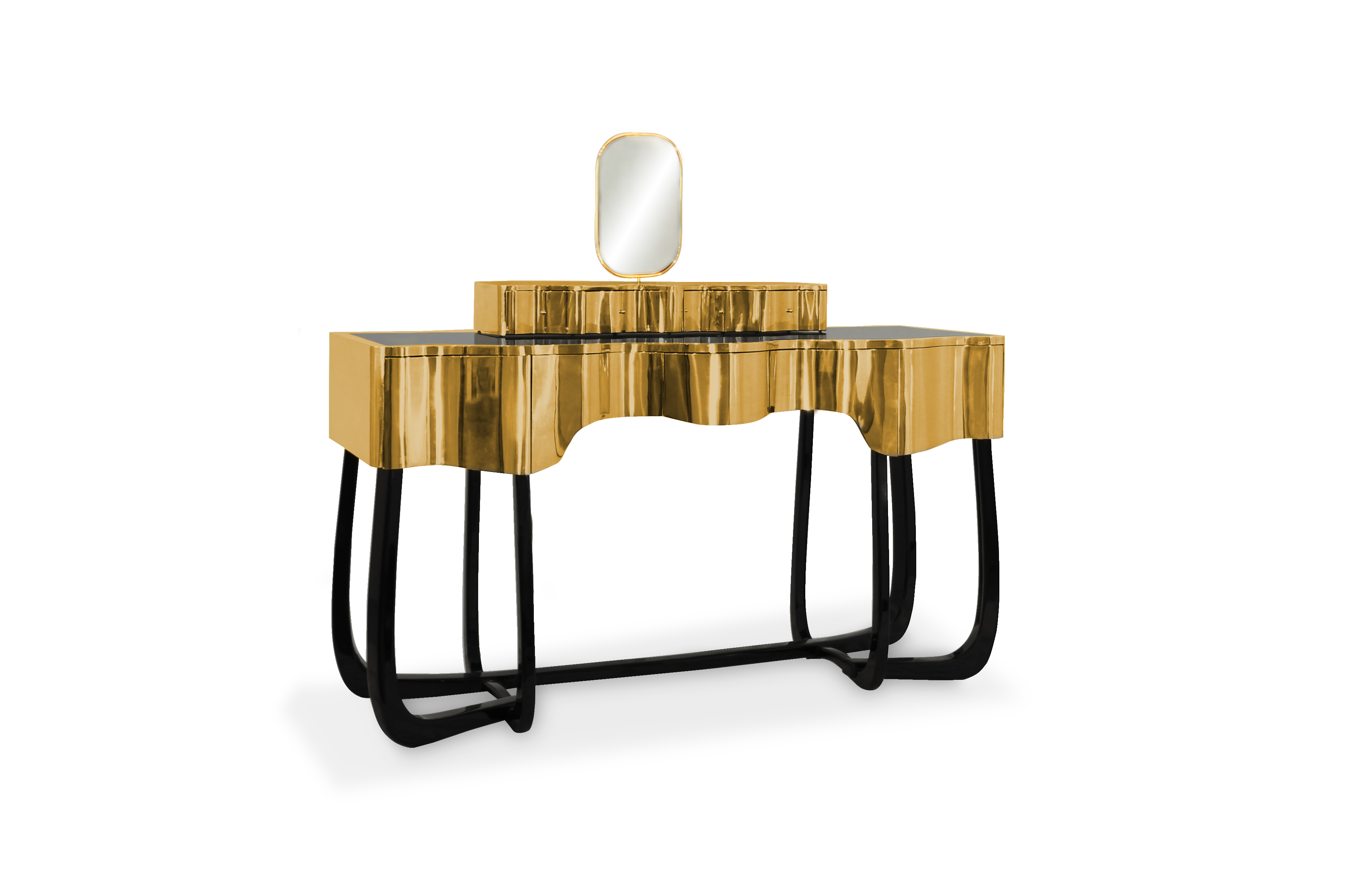 Sinuous is a vanity table designed with a modern and glamorous touch perfect for your bedroom or master bathroom set. Produced in wood, it is covered in black high gloss varnish and polished brass. It offers a lot of storage space, with four drawers on the top and five on the bottom, and a mirror accentuated by a gold plated rim. Its curved design will improve any bathroom design.