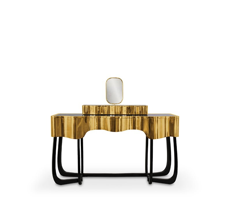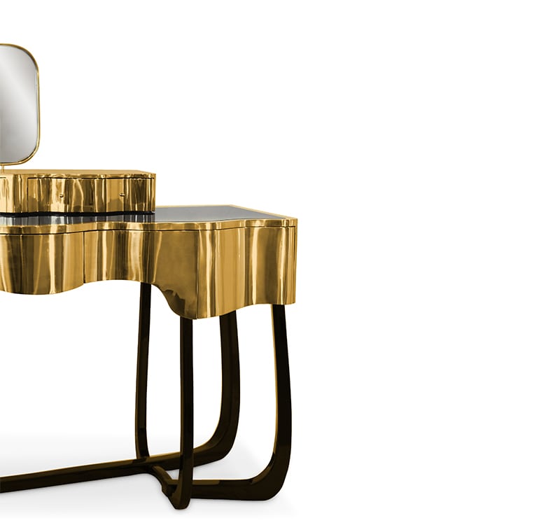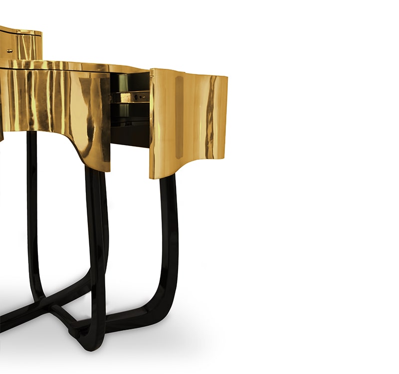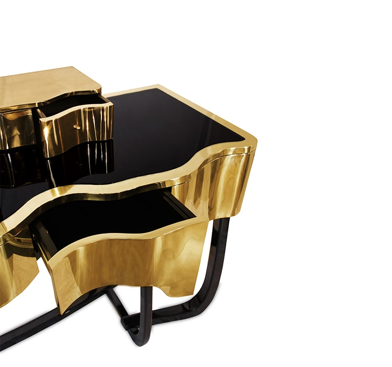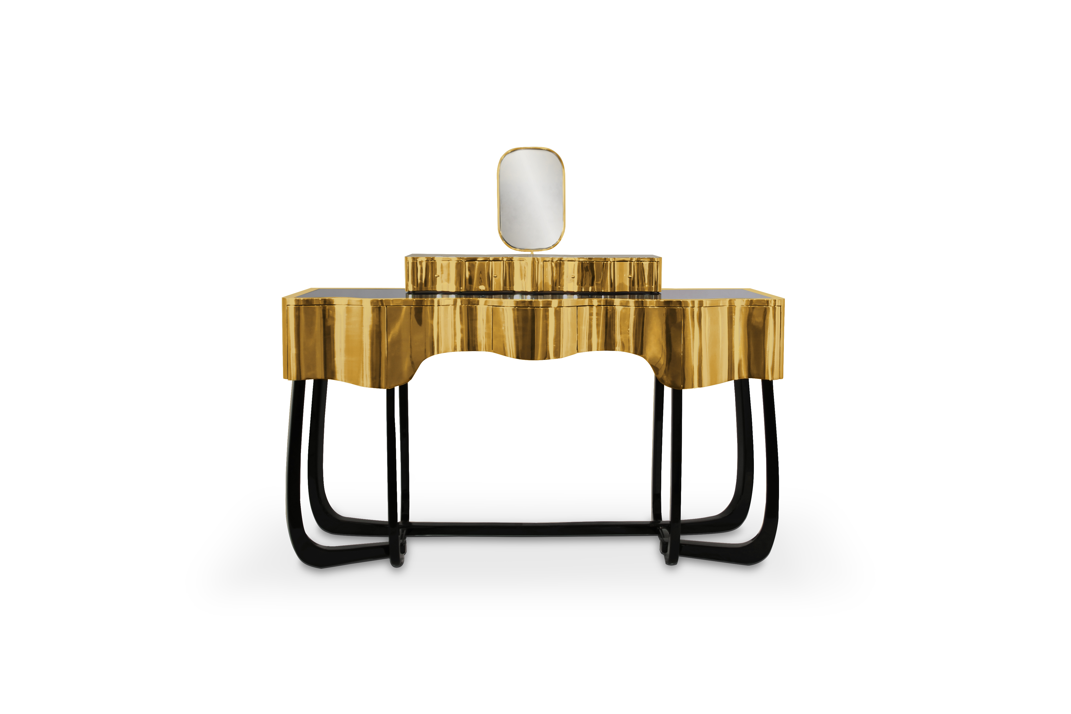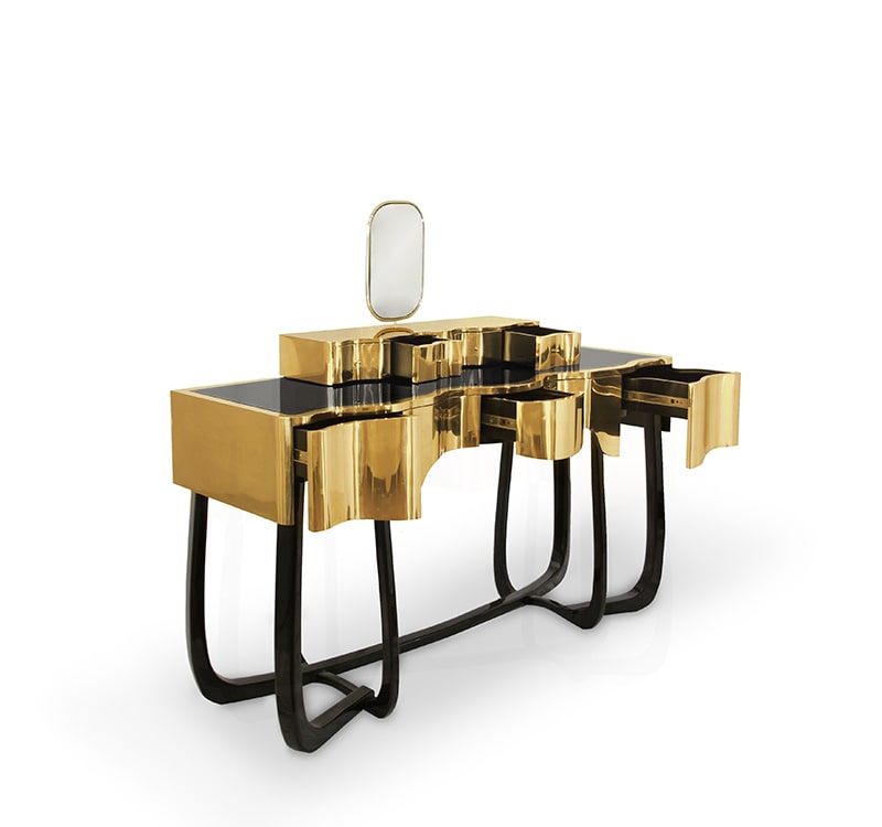 Sinuous is a vanity table designed with a modern and glamorous touch perfect for your bedroom or master bathroom set. Produced in wood, it is covered in black high gloss varnish and polished brass. It offers a lot of storage space, with four drawers on the top and five on the bottom, and a mirror accentuated by a gold plated rim. Its curved design will improve any bathroom design.