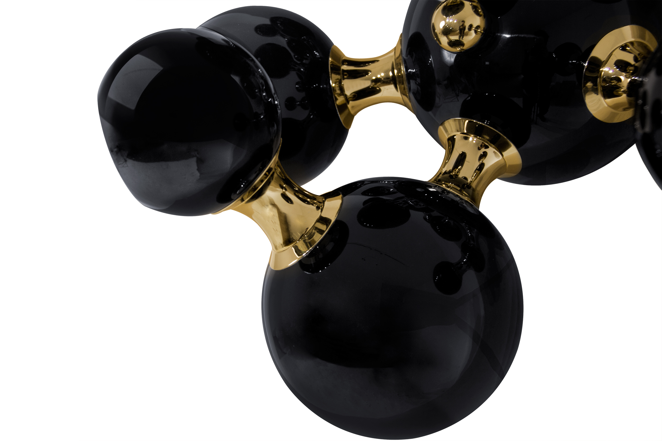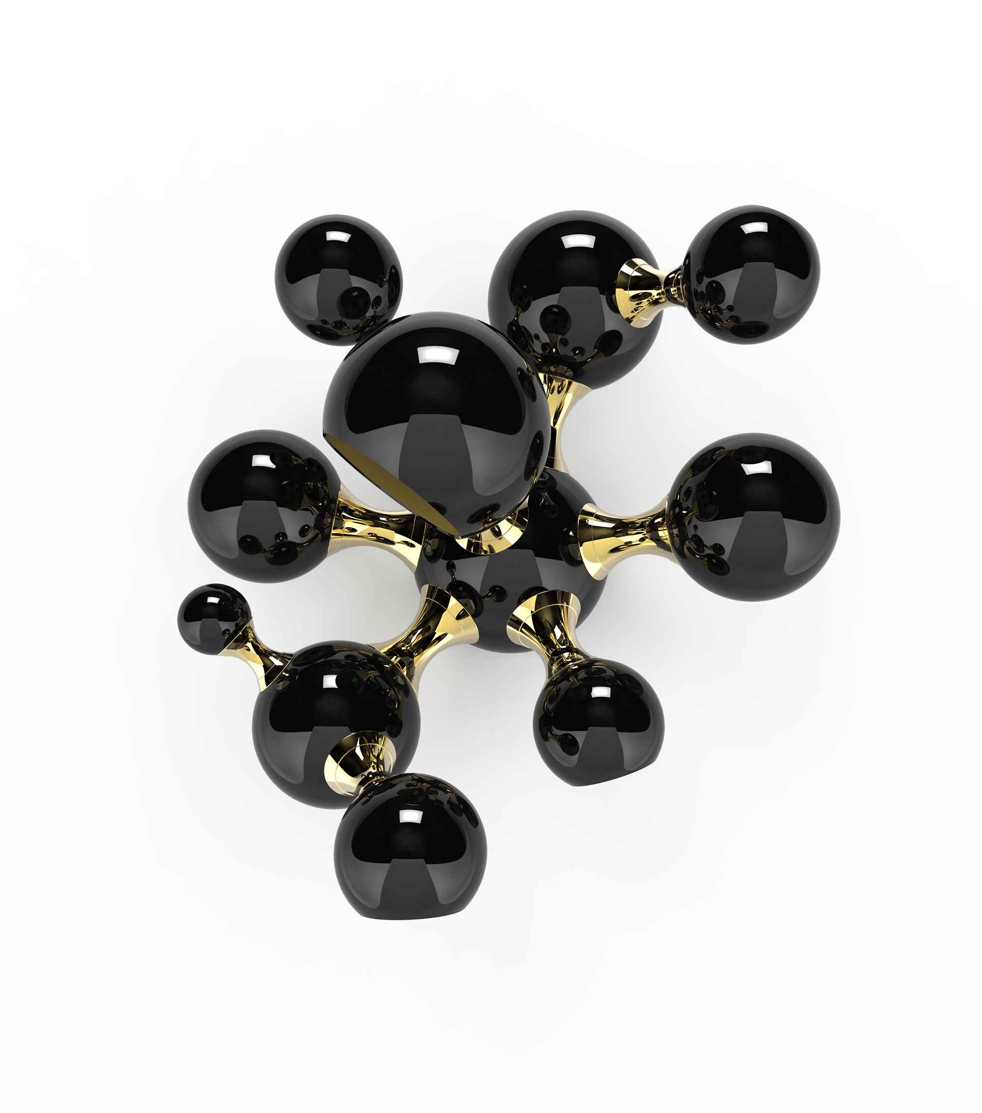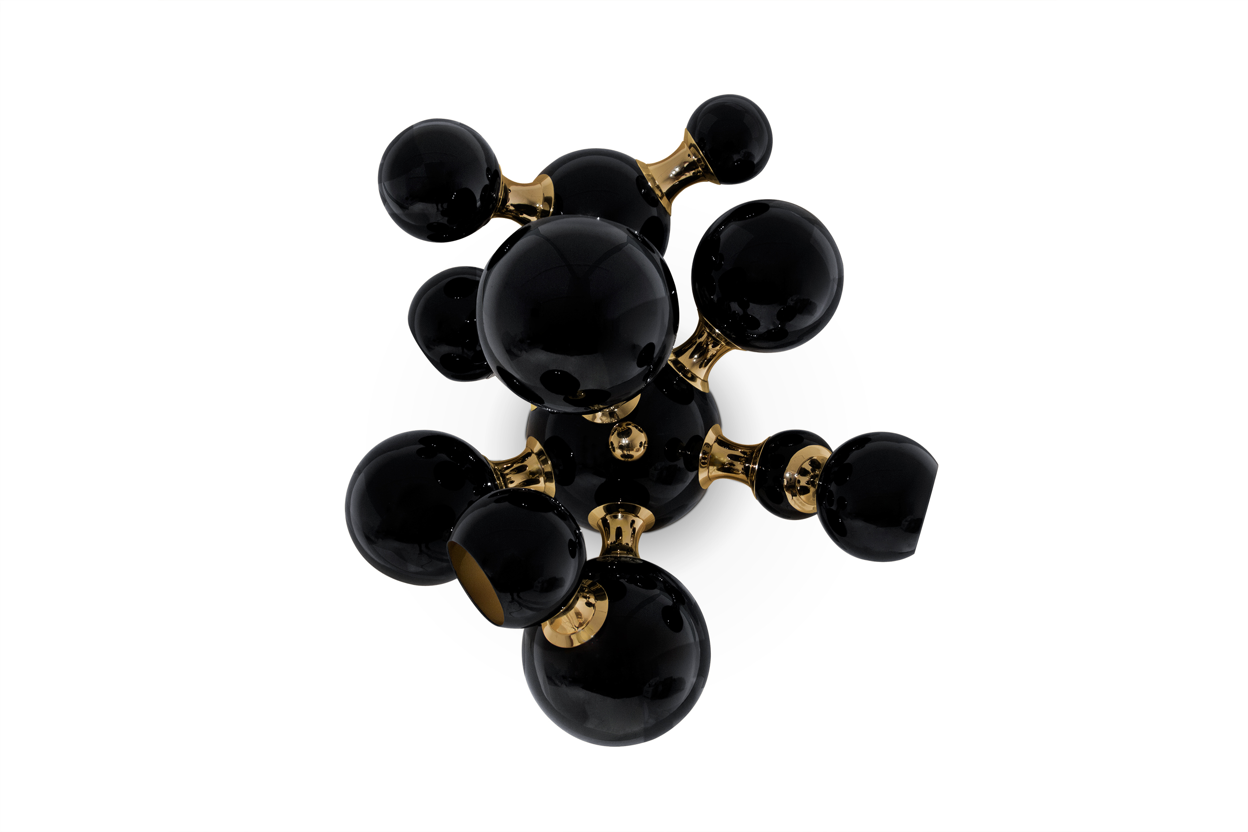 Atomic wall light is a mid-century modern lighting design inspired by the atomic discoveries of the mid-20th century. With multiple round shades that resemble the molecular composition of the atom, this interior wall light can give a fun twist to a contemporary home decor. Its body is handmade in brass and steel, with both a glossy black and a gold-plated finish. The lamp shades feature a glossy black lacquer on the exterior, while gold powder paint is used for the interior shade. It is with a modern vibe that this indoor wall light creates a statement of mid-century modern design in a contemporary living room, displaying each detail as a faithful reproduction of the glamorous 1950s.