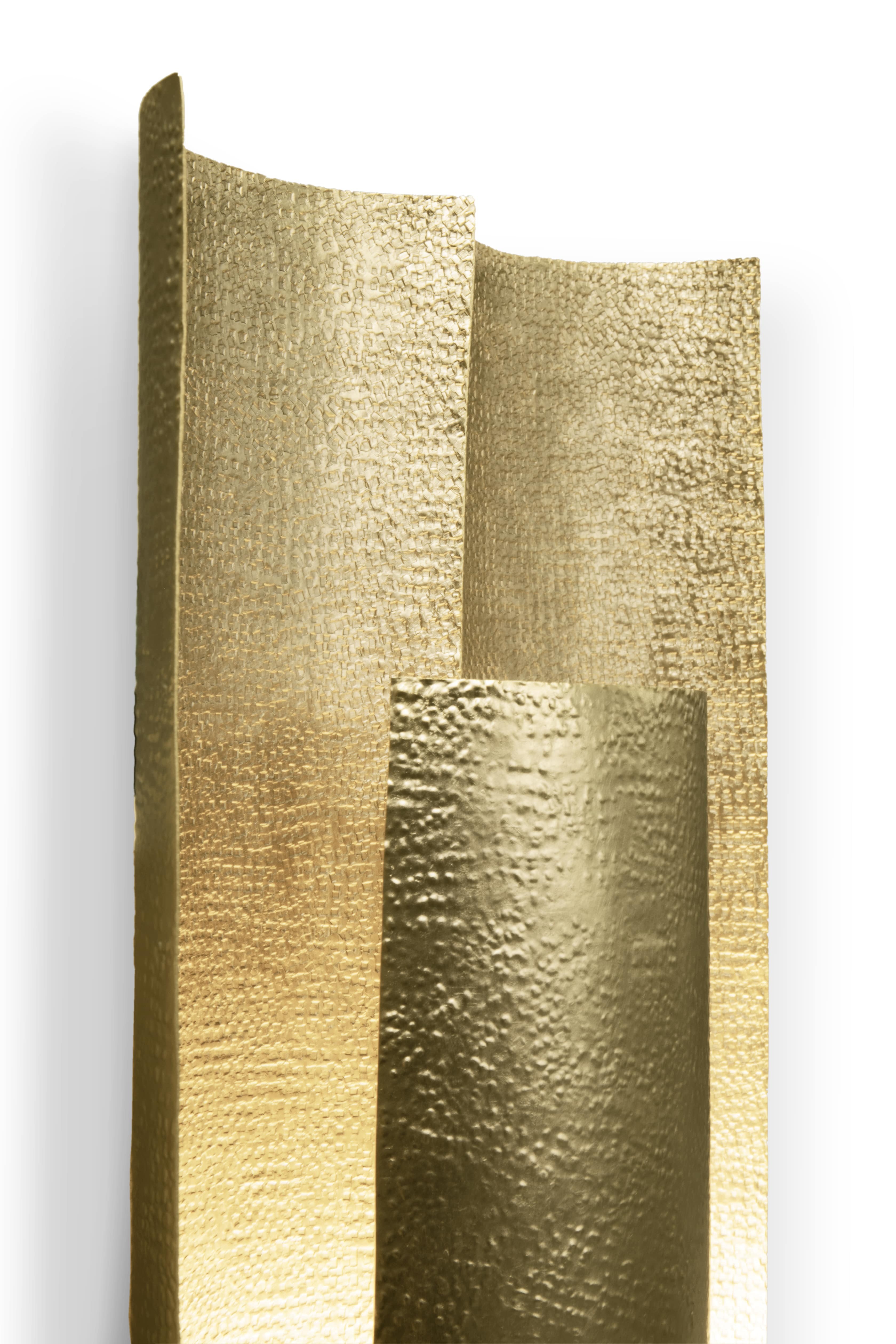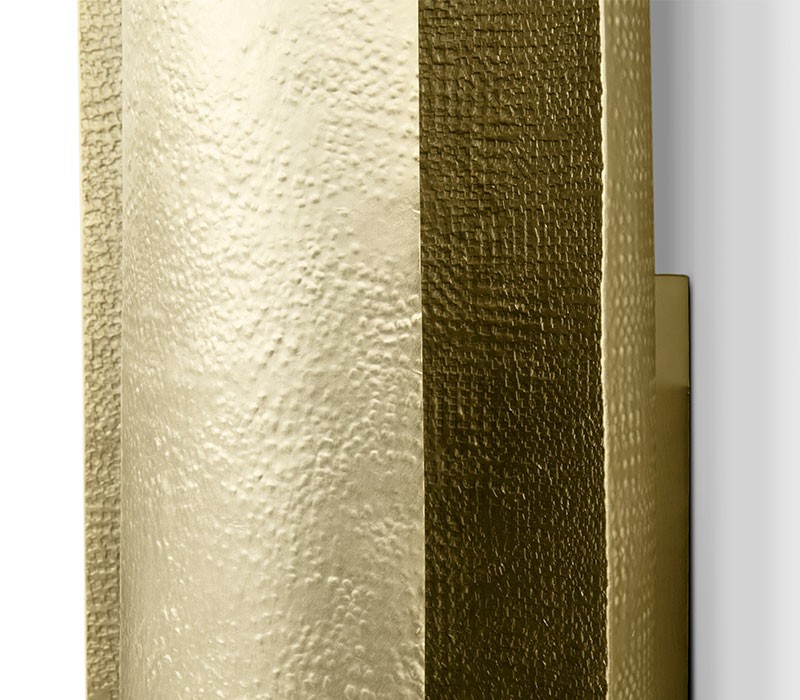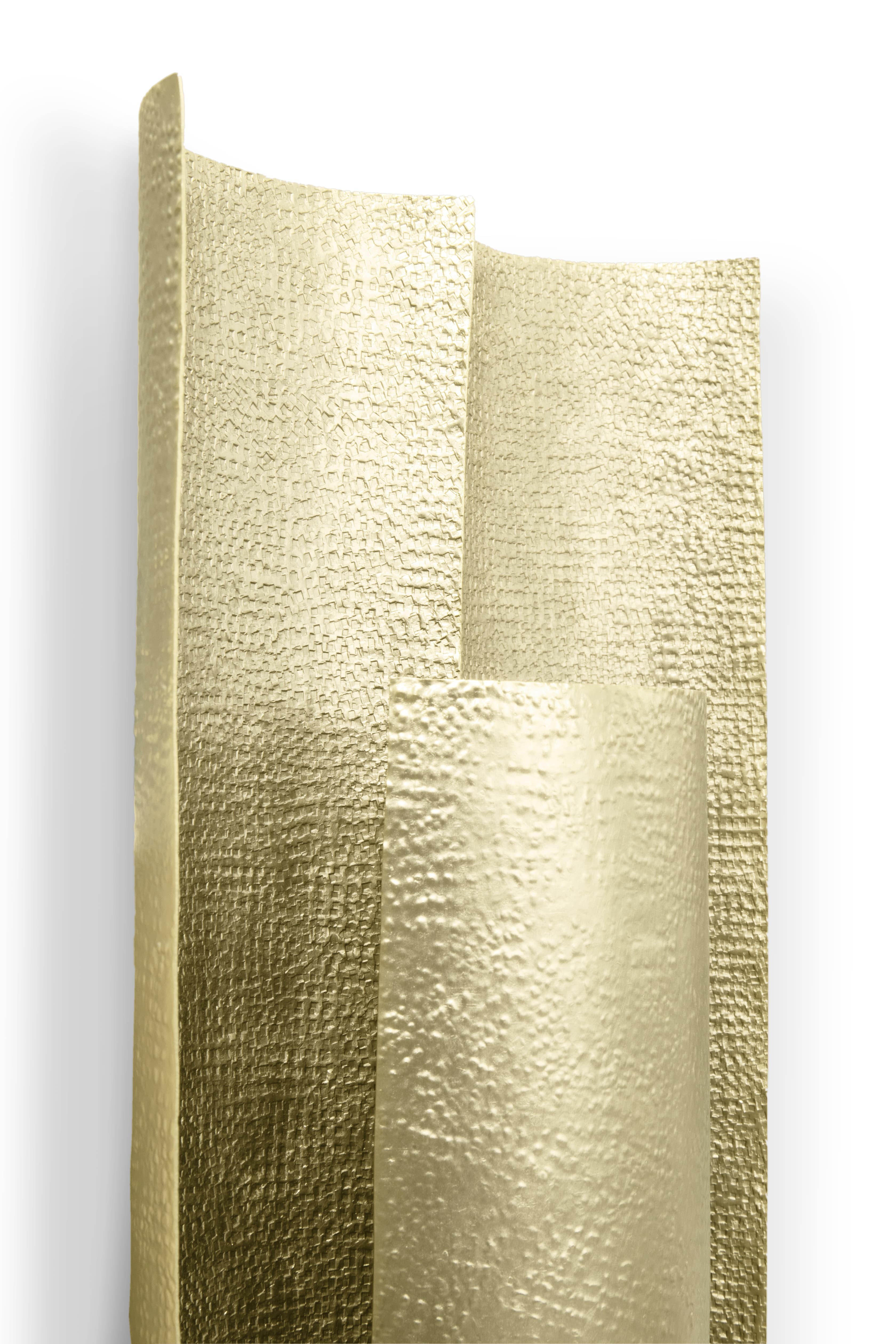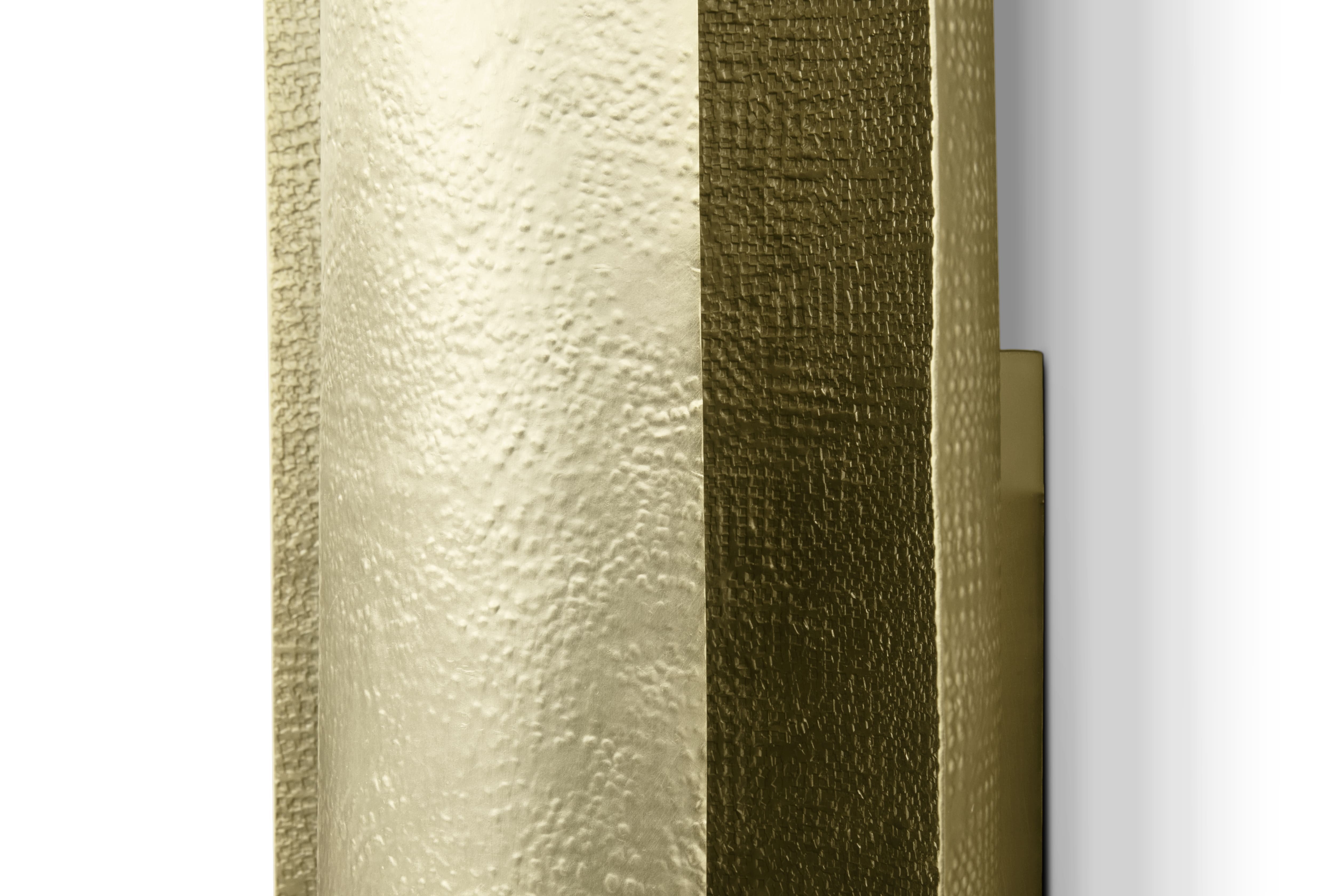 Aurum is the Latin word for gold. This imposing metal also named a contemporary lighting piece made of matte hammered brass in a 1.2 meters / 47 inches long wall light option. With a unique design, AURUM XL Wall Light will bring comfort in the darkest nights with its warm yet sensitive light. This wall light is part of the AURUM Lighting Collection that includes also another wall light and suspension lights in different shapes and sizes.
