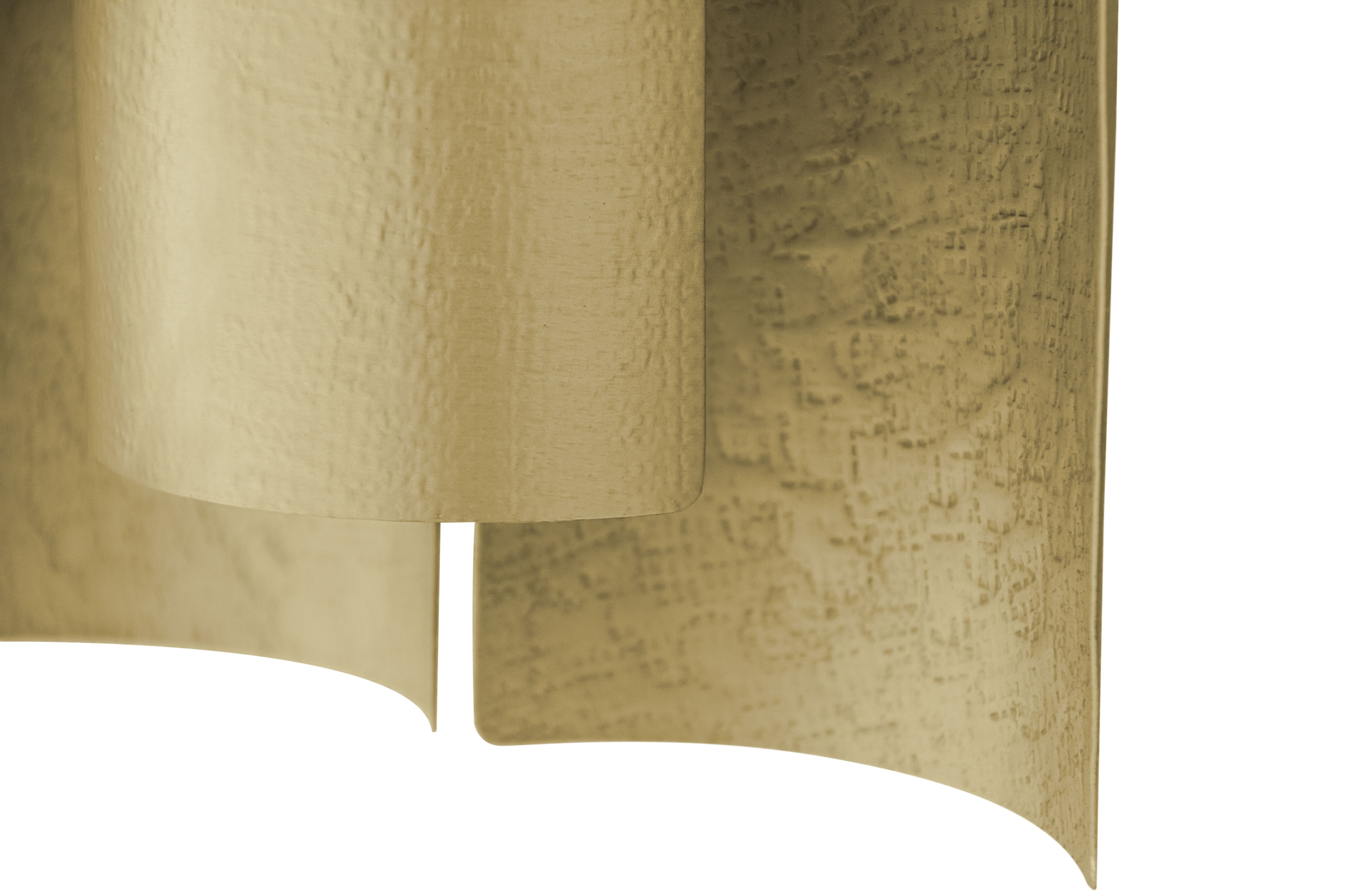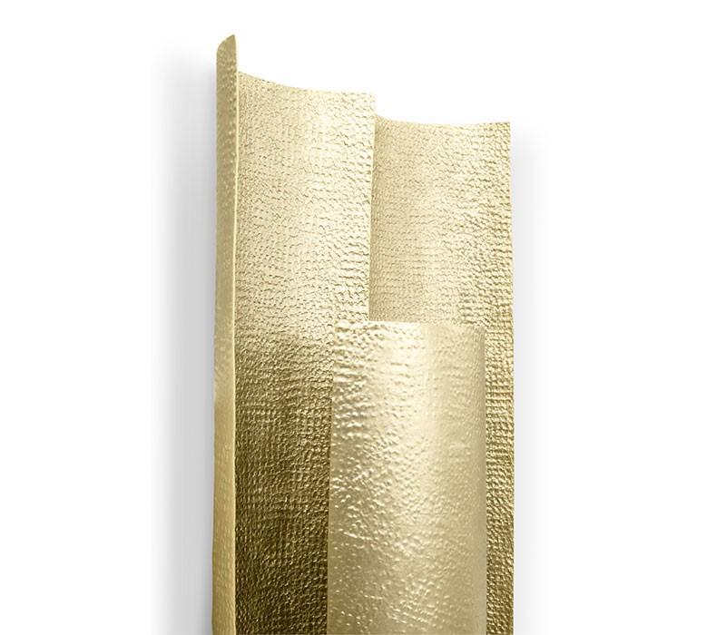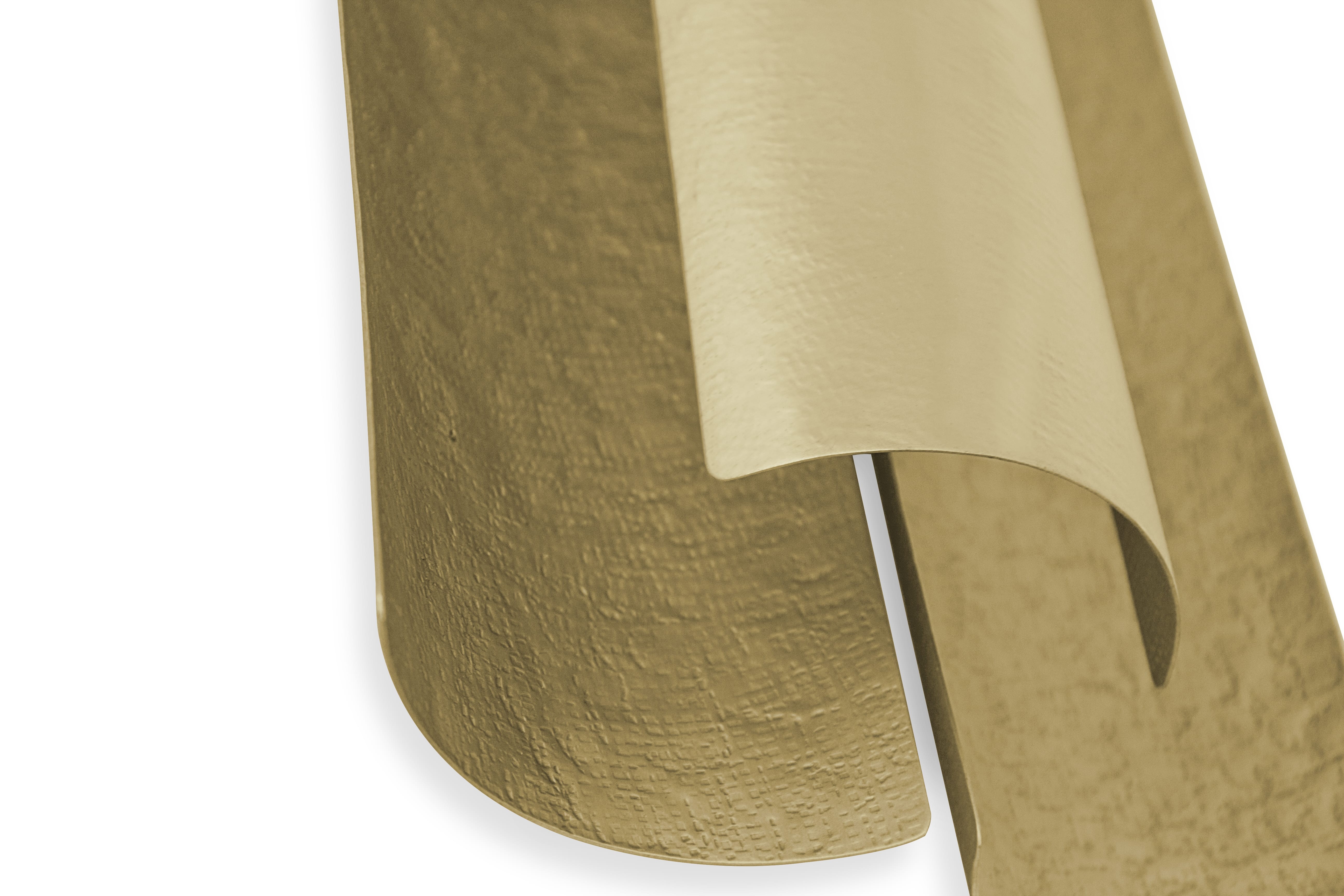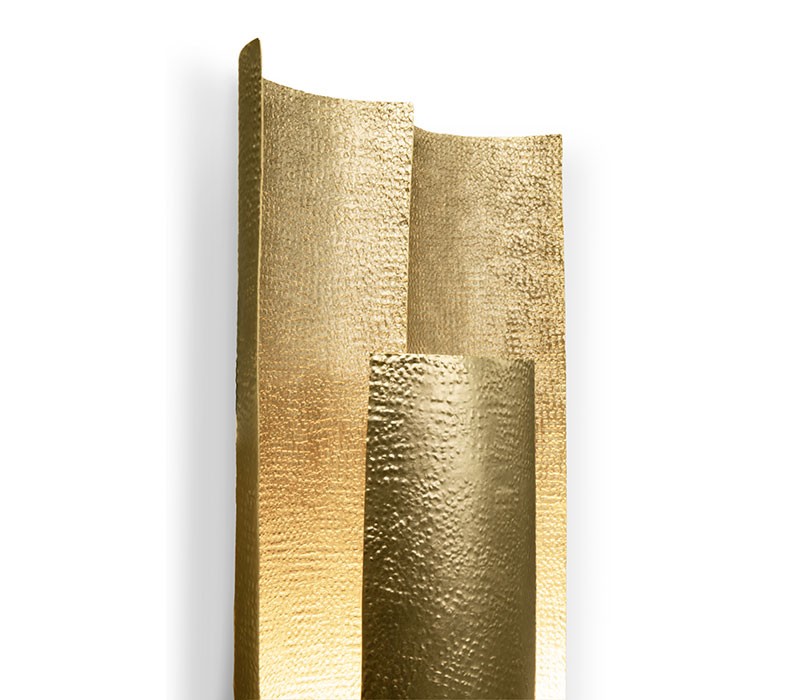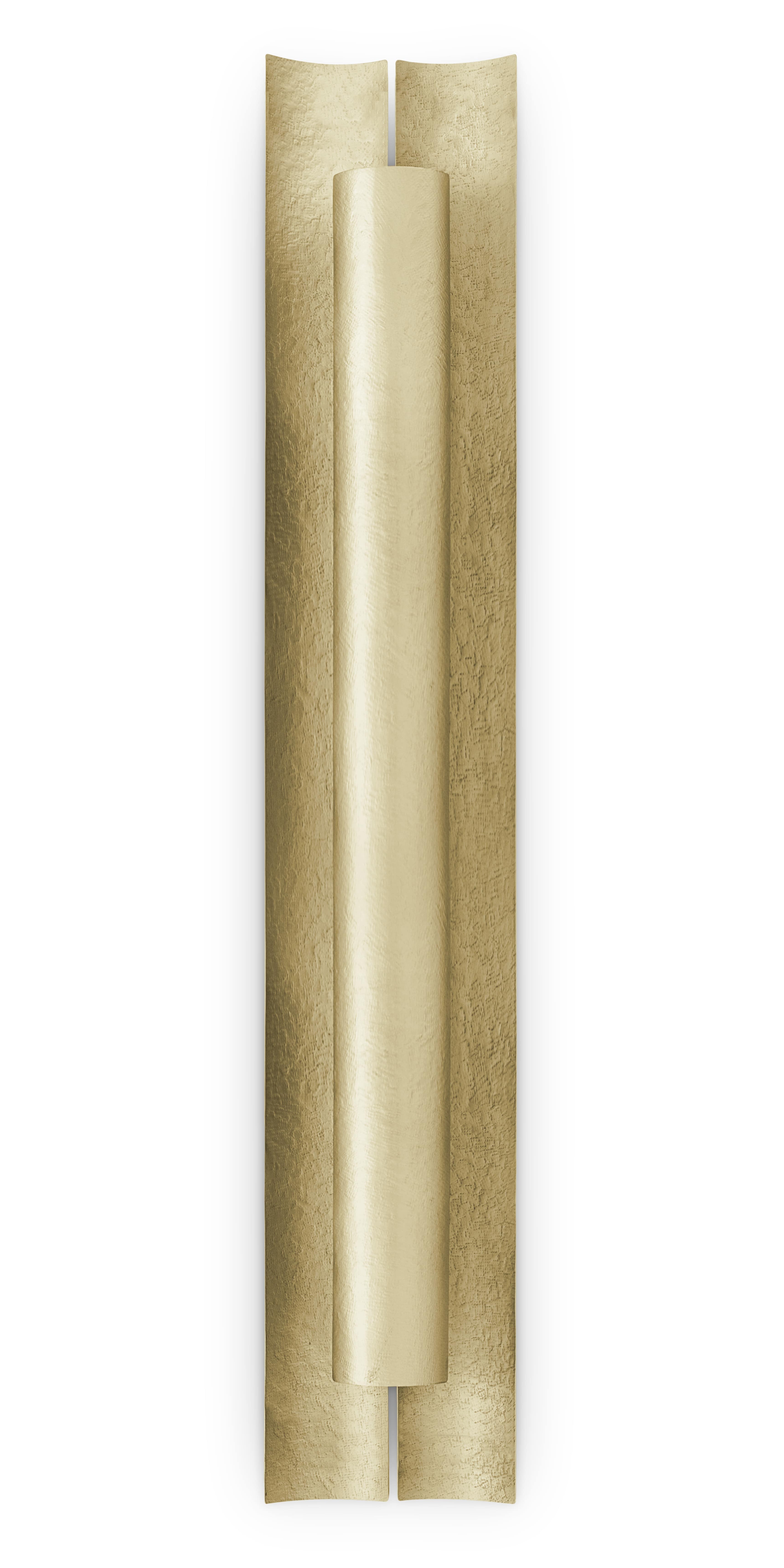 Aurum is the Latin word for gold. This imposing metal also named a contemporary lighting piece made of matte hammered brass in a 1.2 meters / 47 inches long wall light option. With a unique design, AURUM XL Wall Light will bring comfort in the darkest nights with its warm yet sensitive light. This wall light is part of the AURUM Lighting Collection that includes also another wall light and suspension lights in different shapes and sizes.